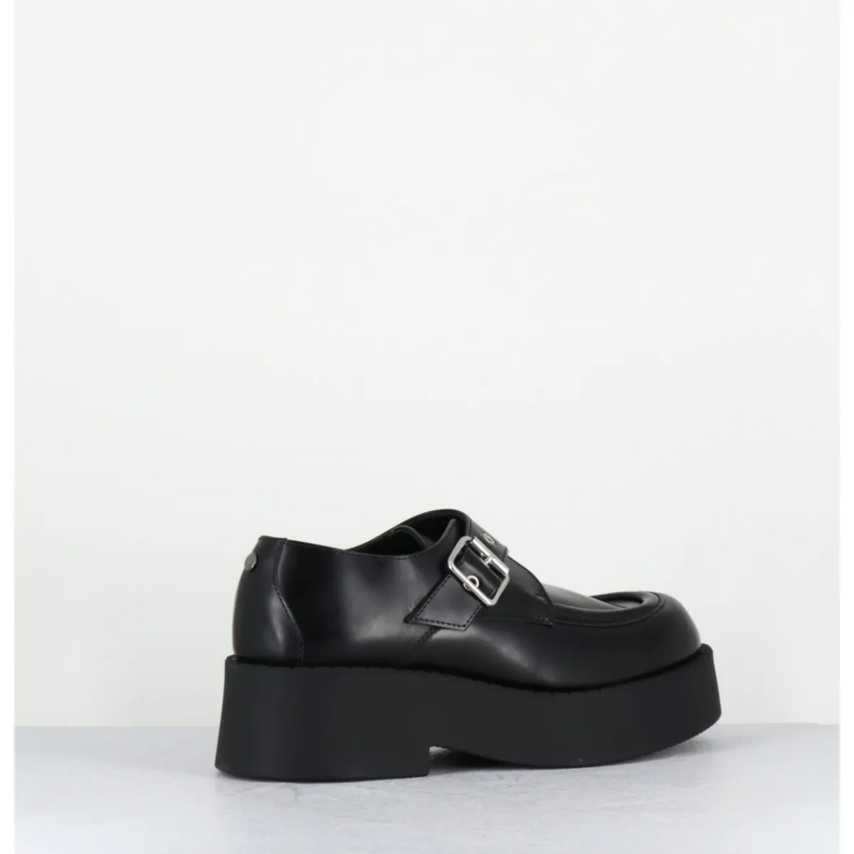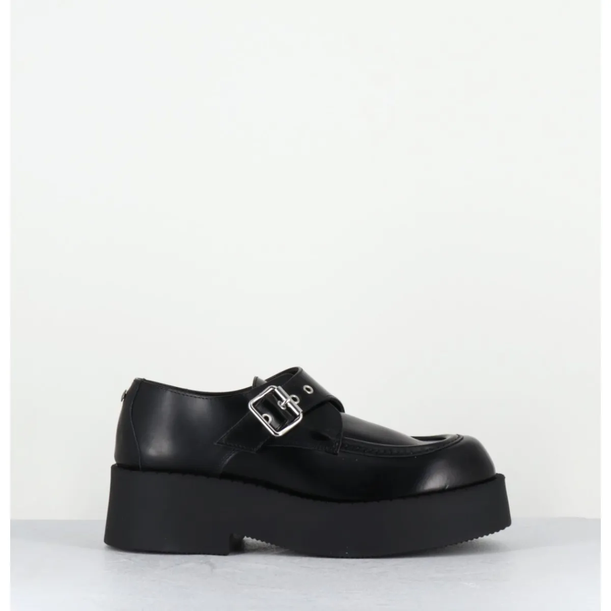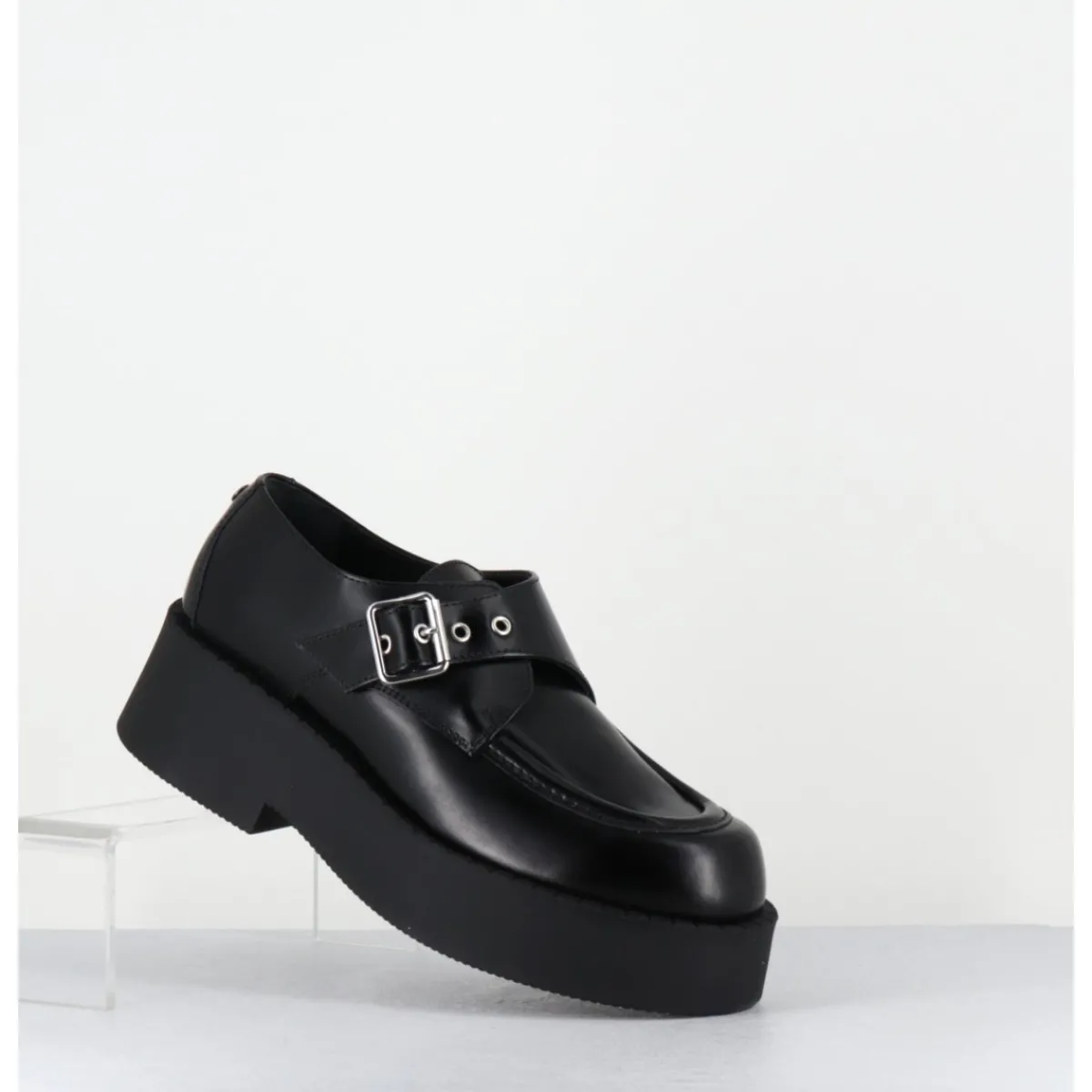 Chaussures à plateforme esprit creepers en cuir glacé noir avec boucle réglable, montées sur une semelle épaisse en gomme légère
