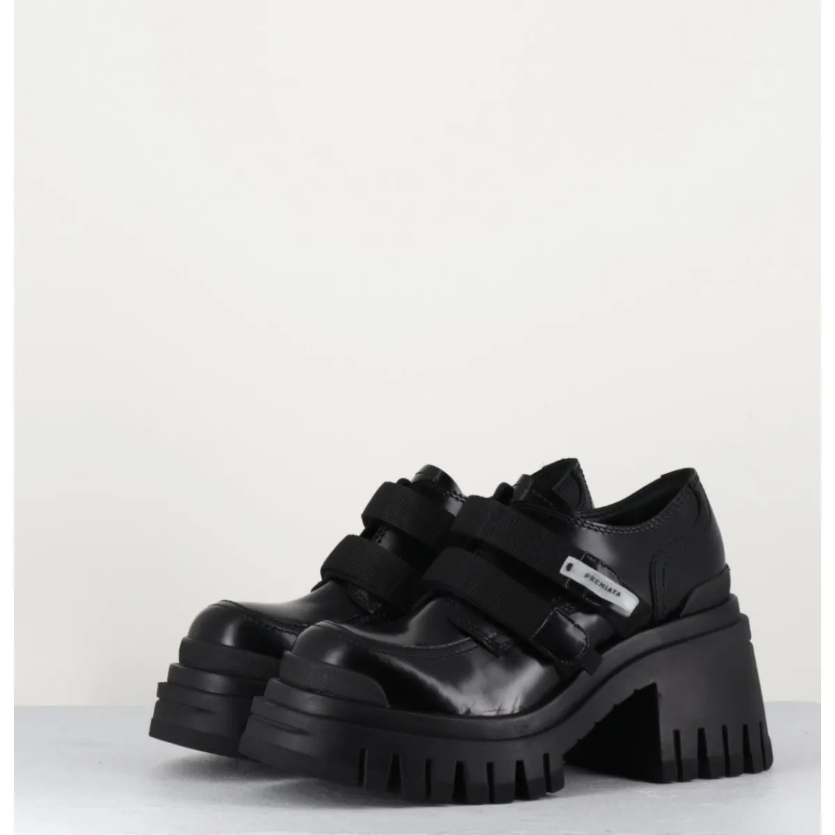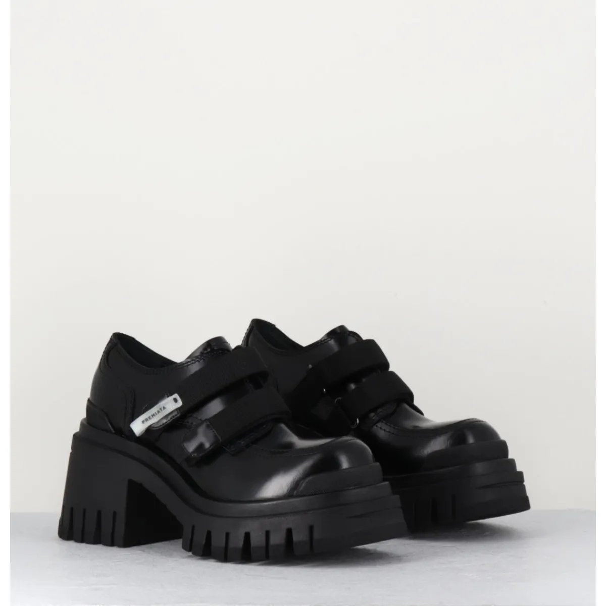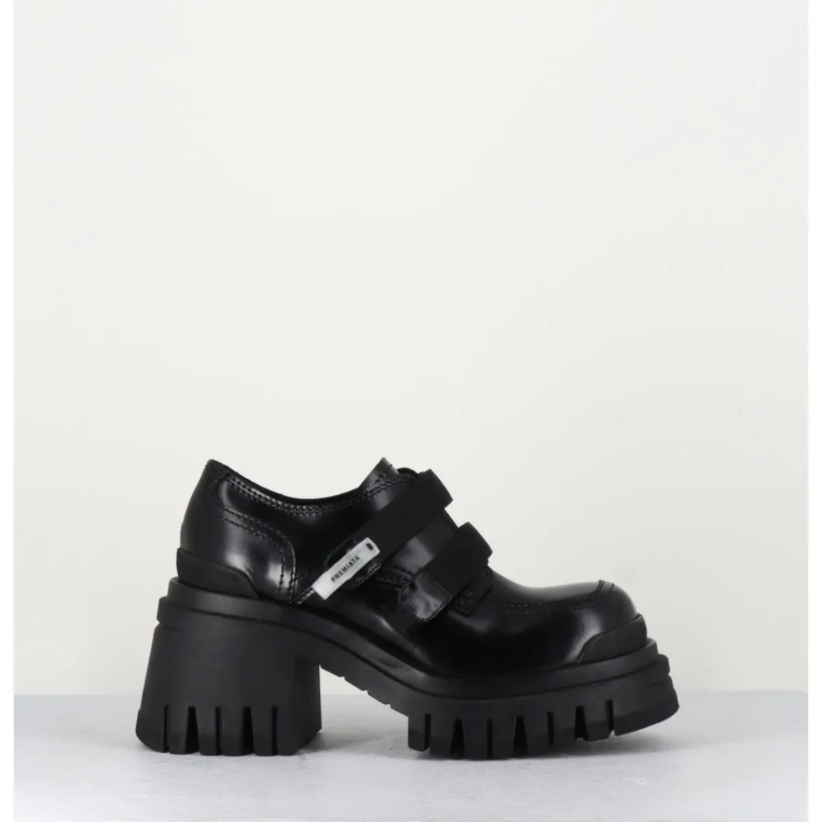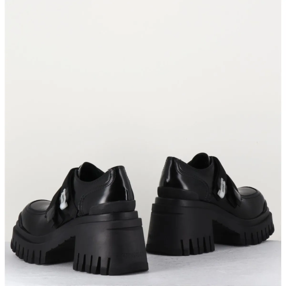 Chaussures en cuir noir double brides à scratch & brogue esprit 90s, montées sur une semelle épaisse & un talon moyen crantés