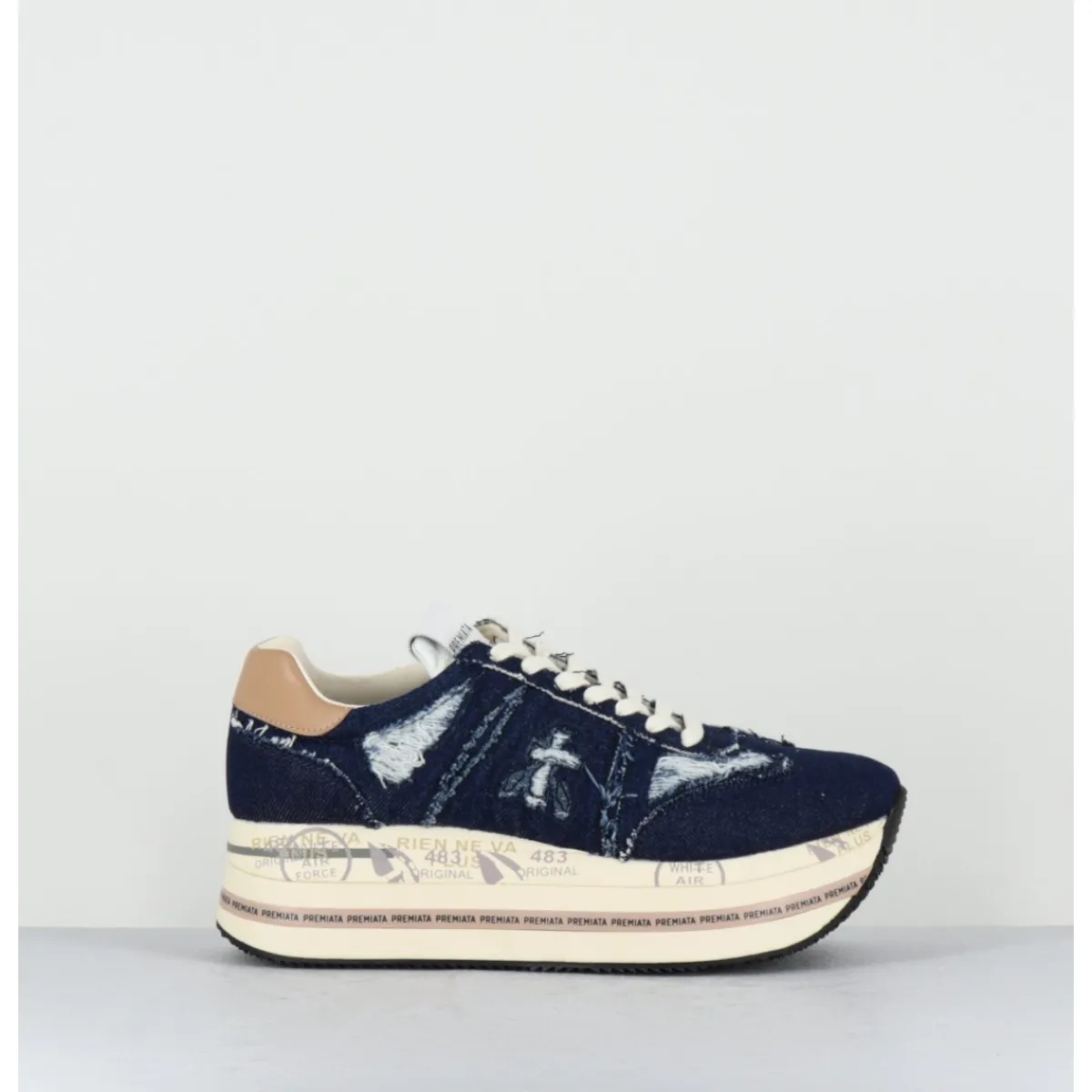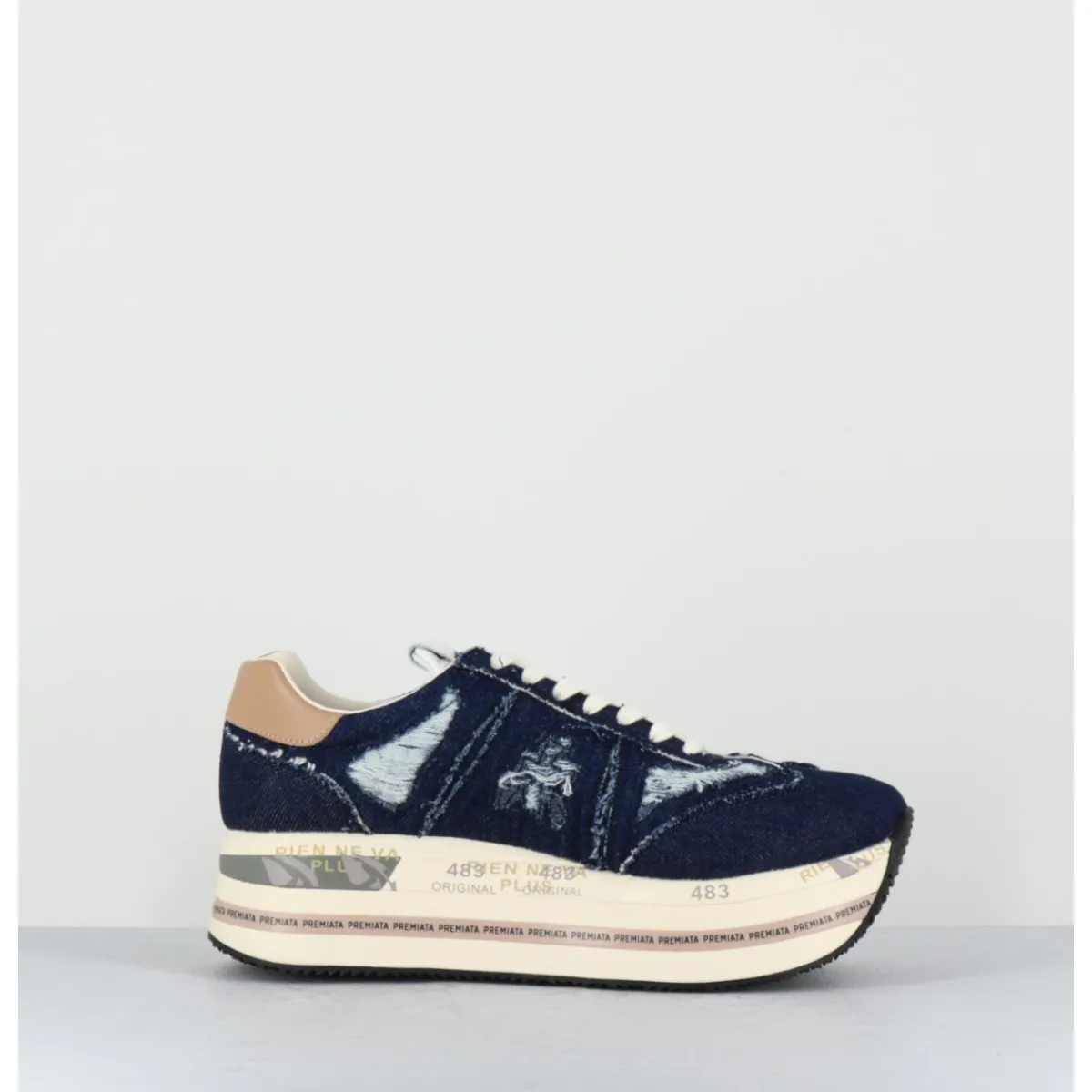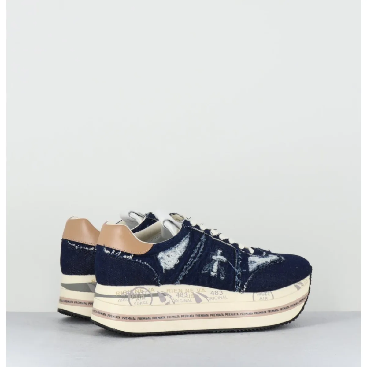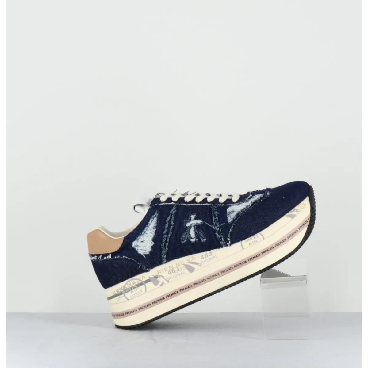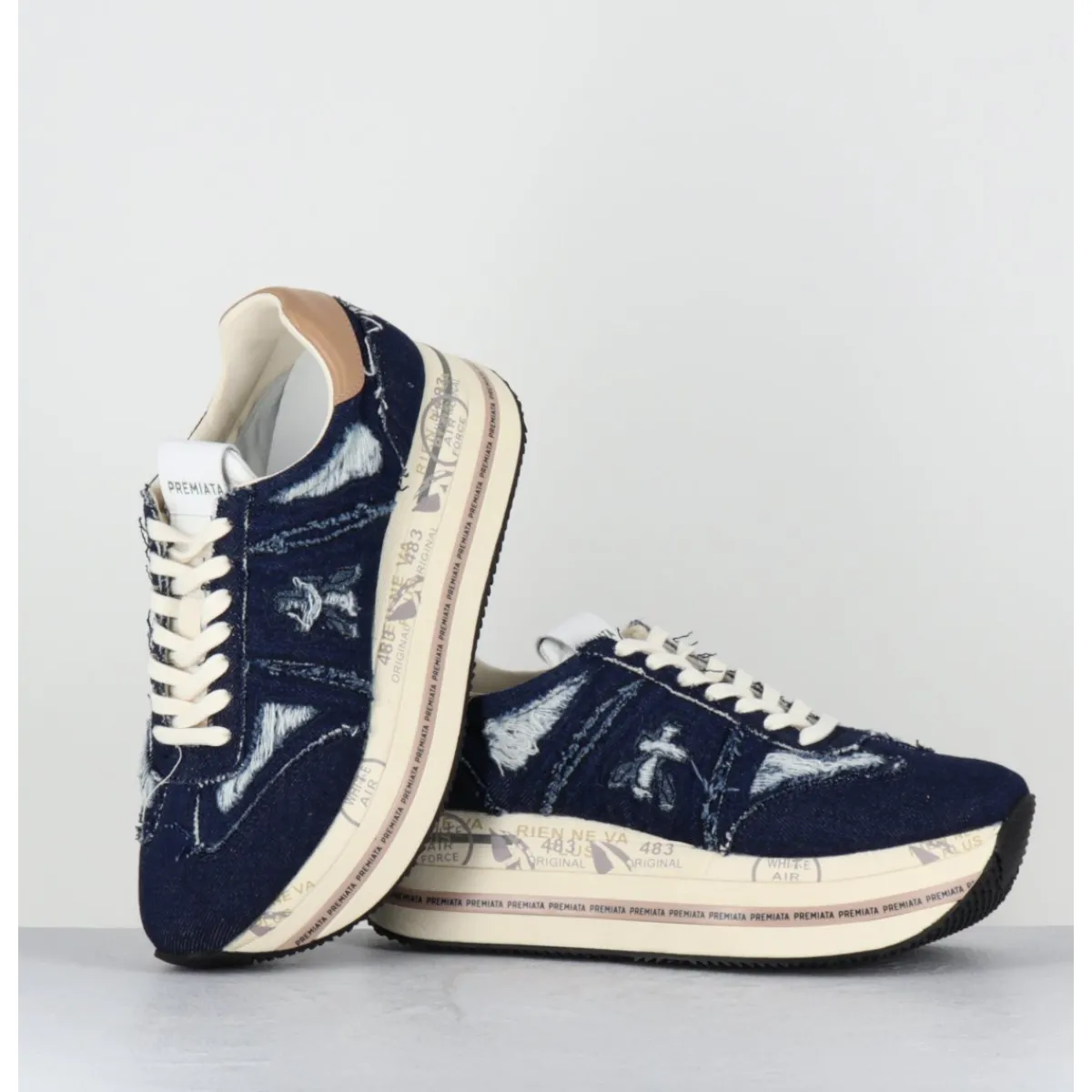 Sneakers en jean brut usé & intérieur cuir, ligne japonisante, montées sur une semelle épaisse bloc avec détails signature de la Maison. Cambrure étudiée très confortable