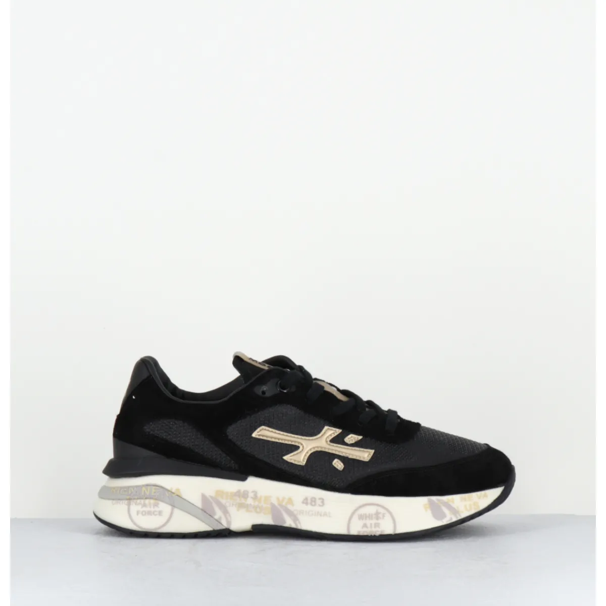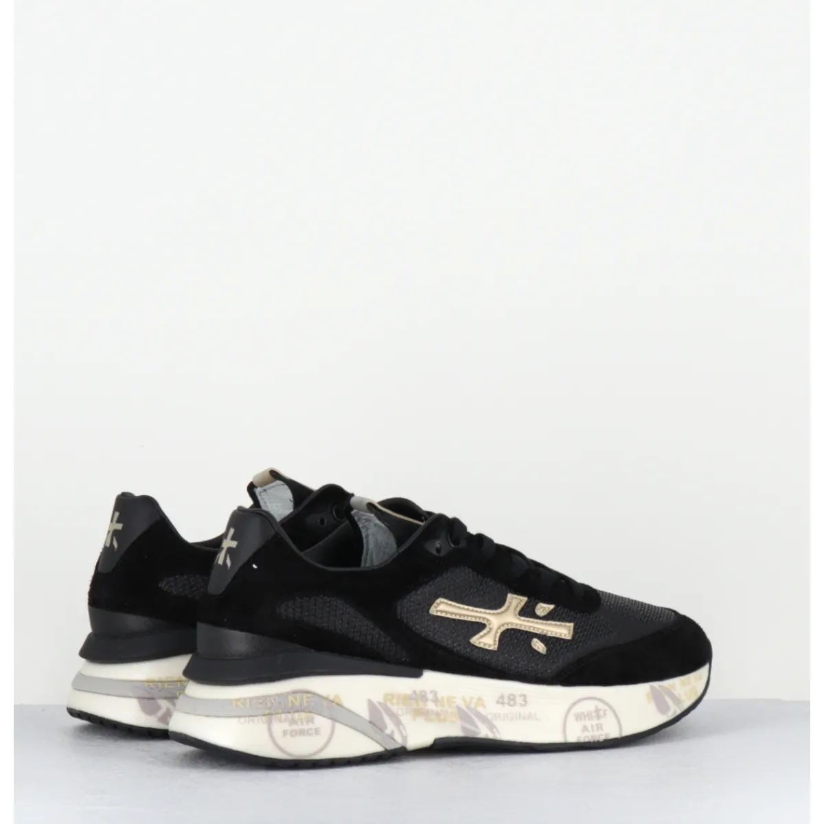 Sneakers esprit années 90, semelle ultra light innovante chez Premiata, daim noir et empiècement de toile avec détails cuir or, montées sur une semelle épaisse blanche en micro fibre, avec imprimé signature de la Maison Italienne Premiata.