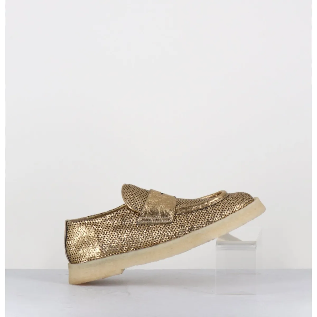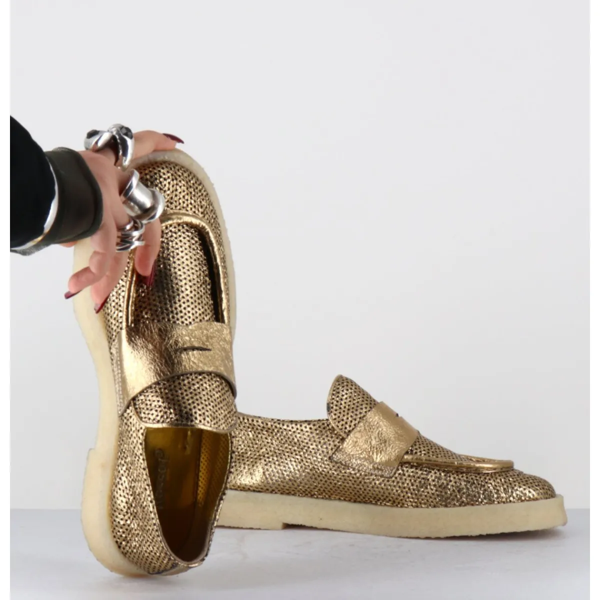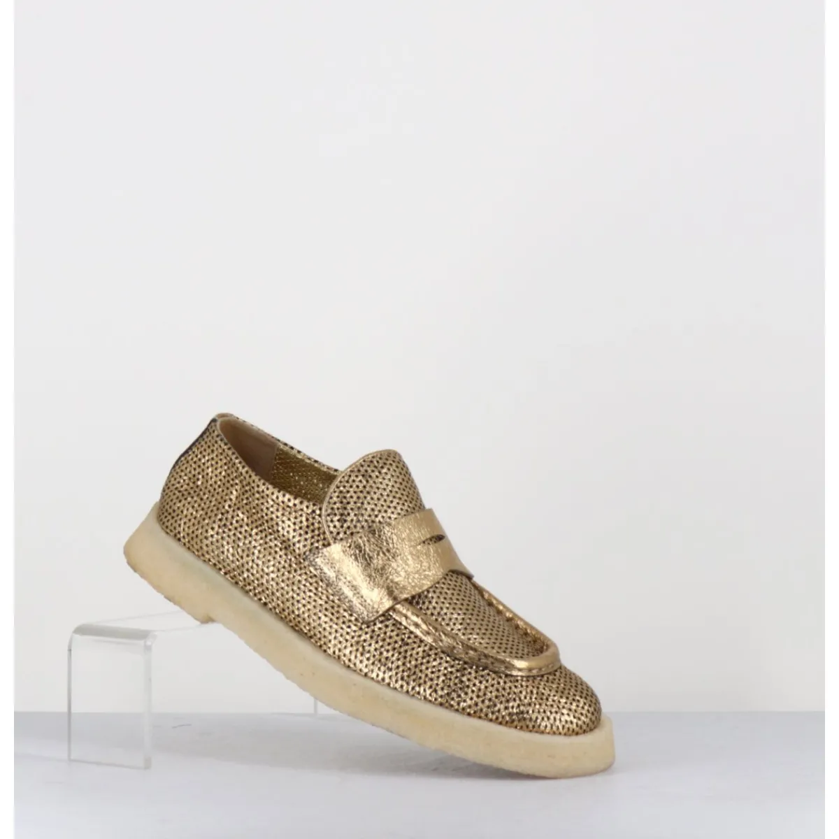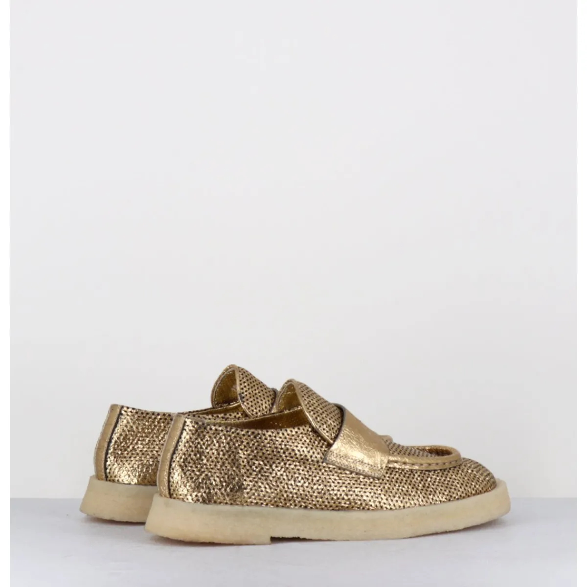 Mocassins en cuir métallisé doré perforé et crêpe naturel, construction sacchetto extrêmement souple cousu intérieur extérieur, forme large à semelle légèrement débordante