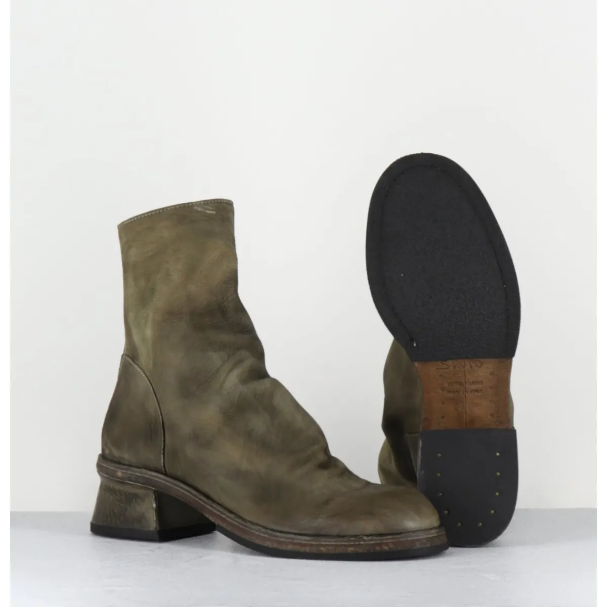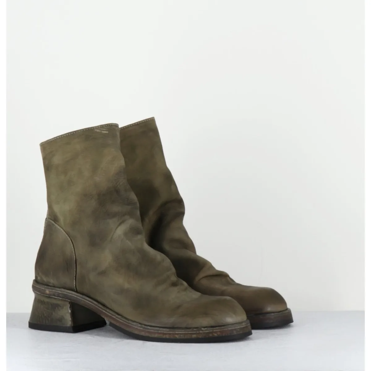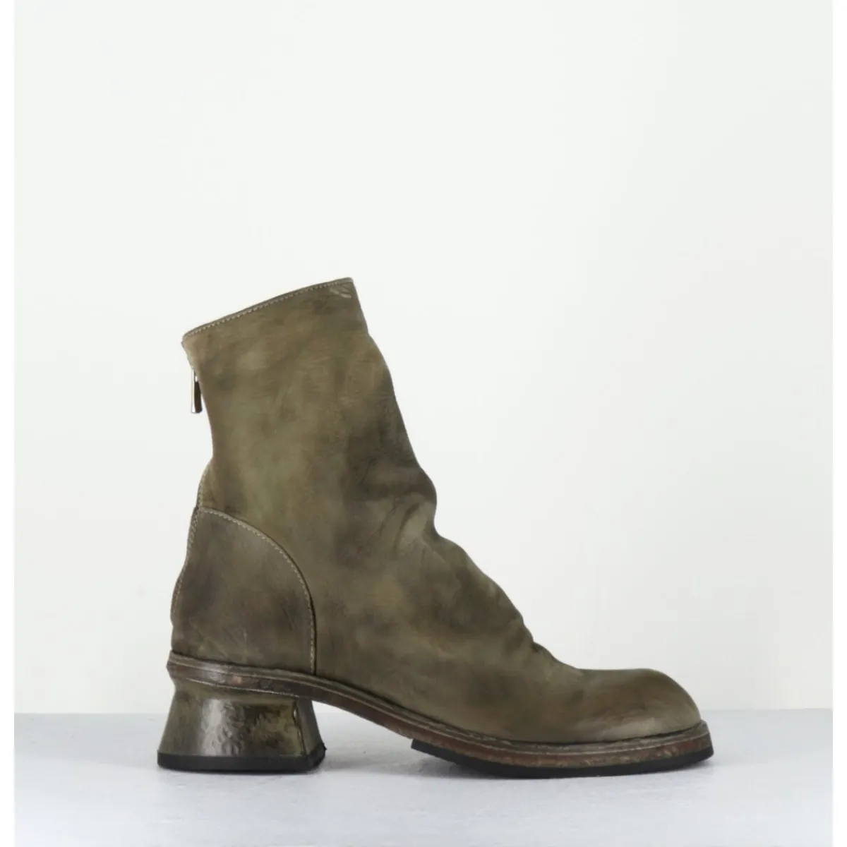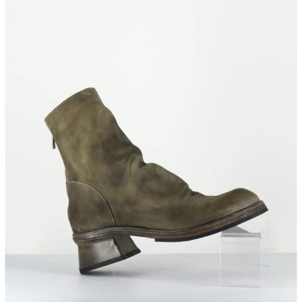 Boots en cuir gras huilé et lavé à la main pour un effet vintage « usé », couleur vert kaki nuancé, zip arrière, montées sur une double semelle cousue intégral et un petit talon légèrement déstructuré