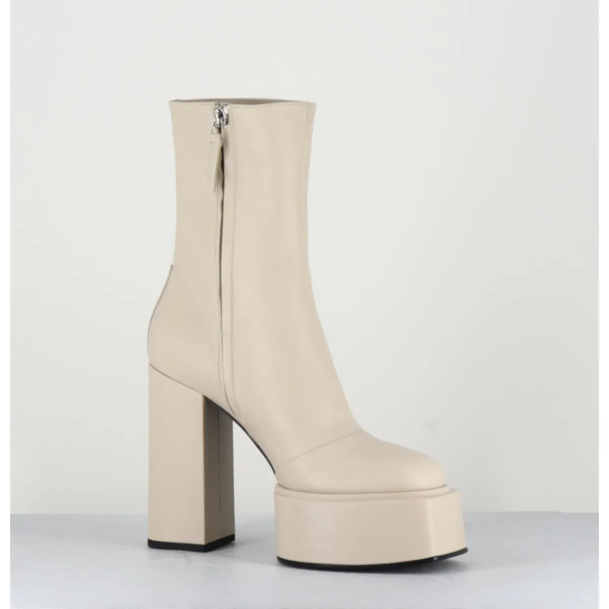 Boots en cuir souple blanc, tige haute, zip intérieur, bout rond, couture centrale rétro, montées sur une large plateforme carrée et un haut talon bloc recouverts.