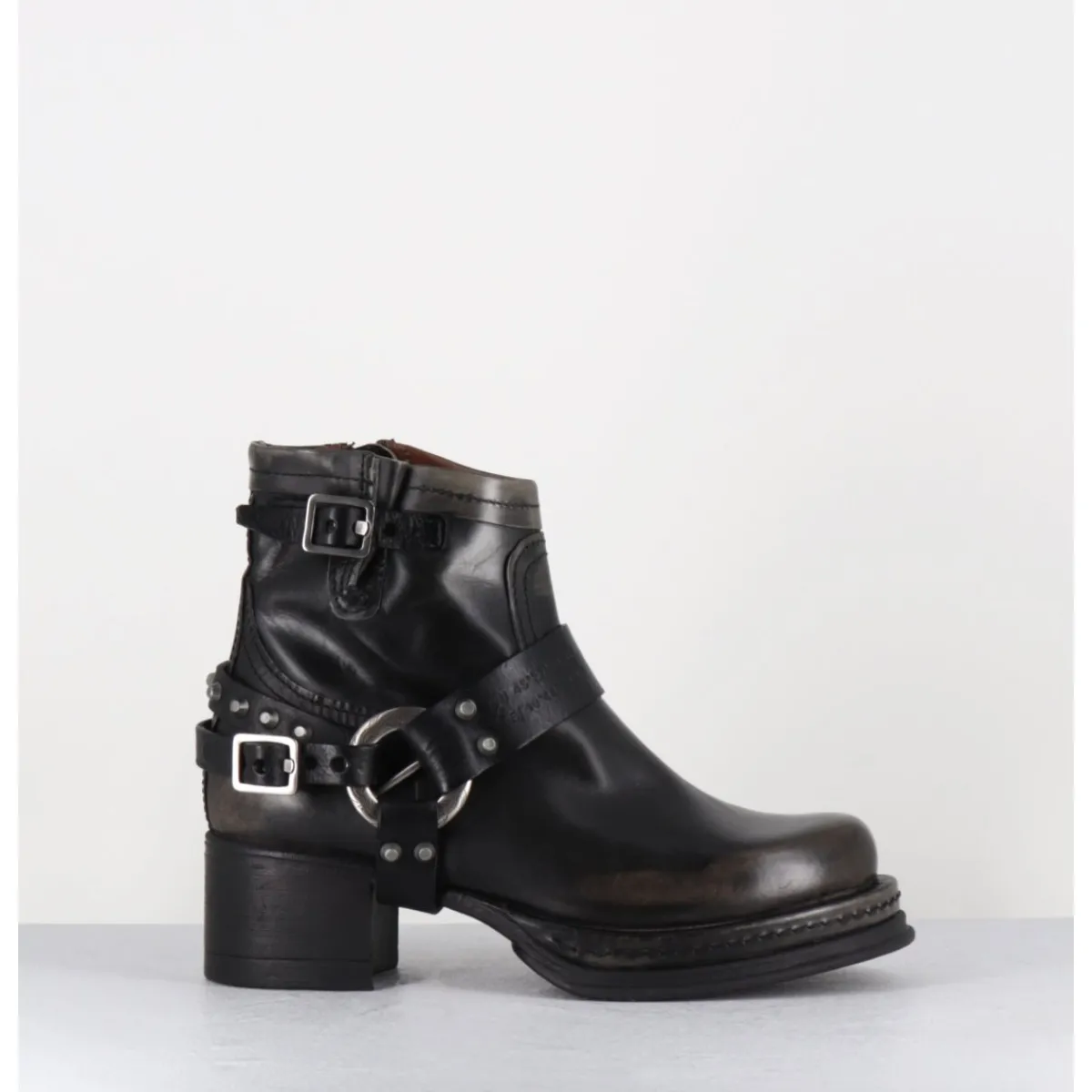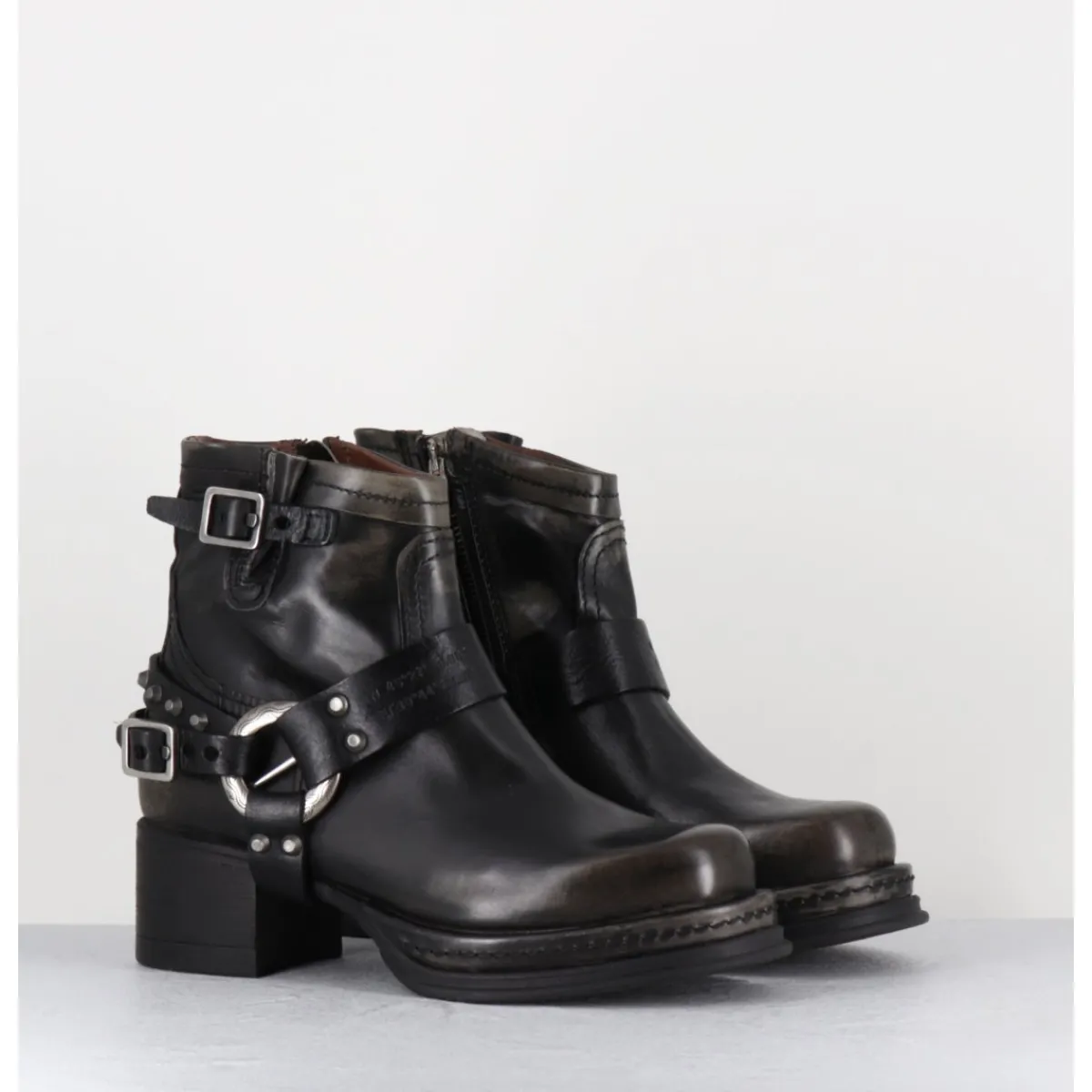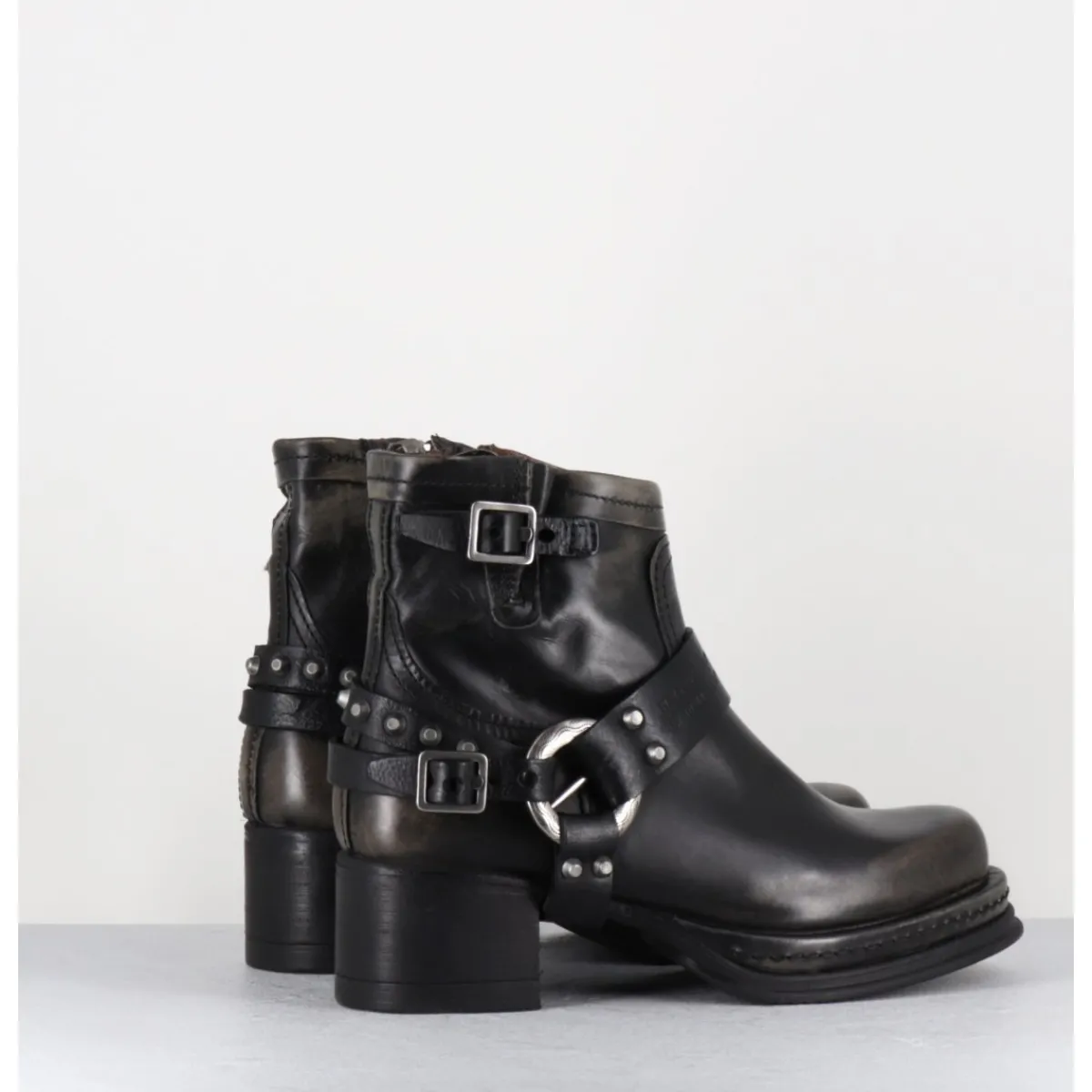 Boots bikers tige courte en cuir anthracite lustré avec patine vieilli à la main pour un effet vintage allant du gris au noir, ceinturon à clous argentés, bout arrondi, petit bride à boucle réglable sur la jambe, montées sur une semelle épaisse en gomme et un talon bloc confortable