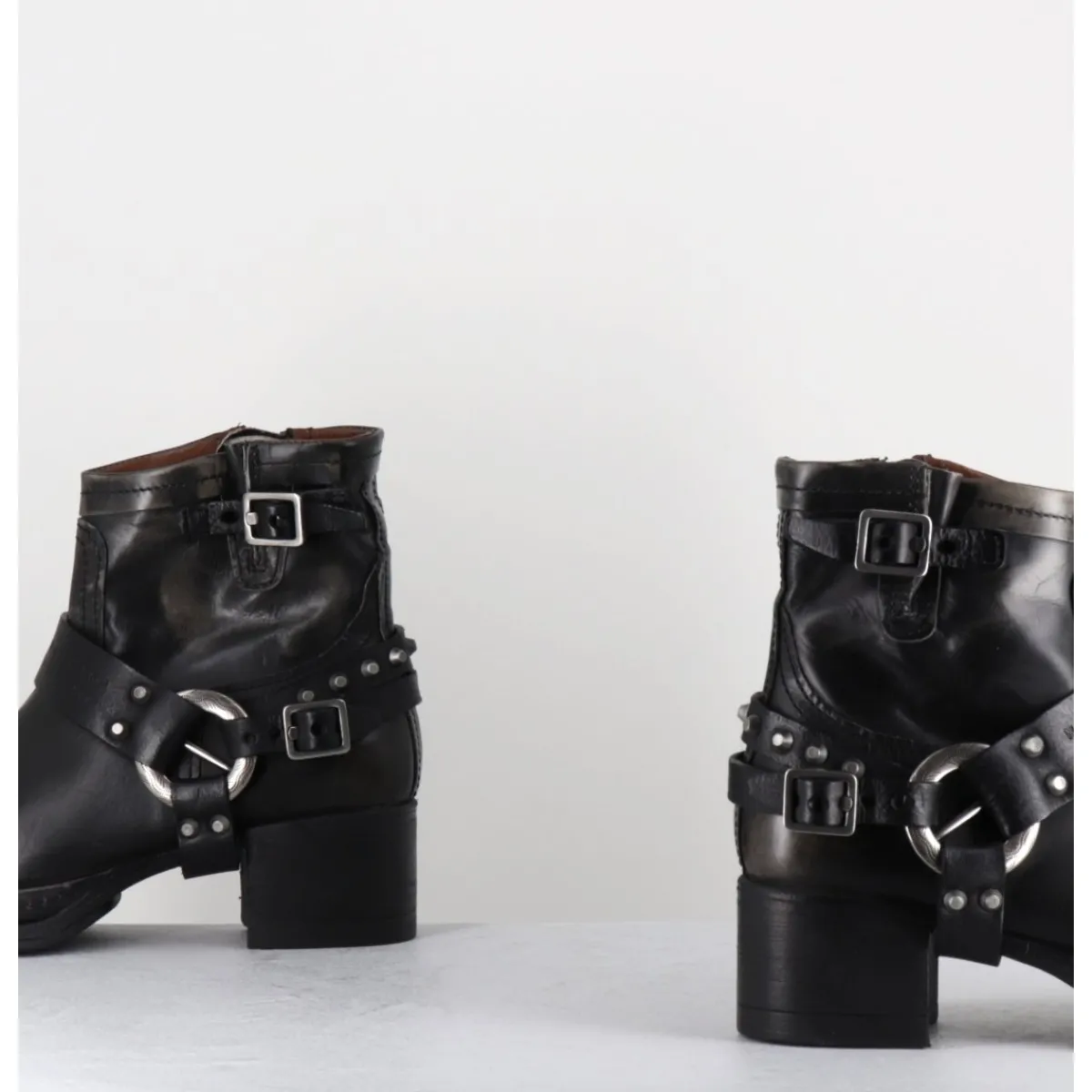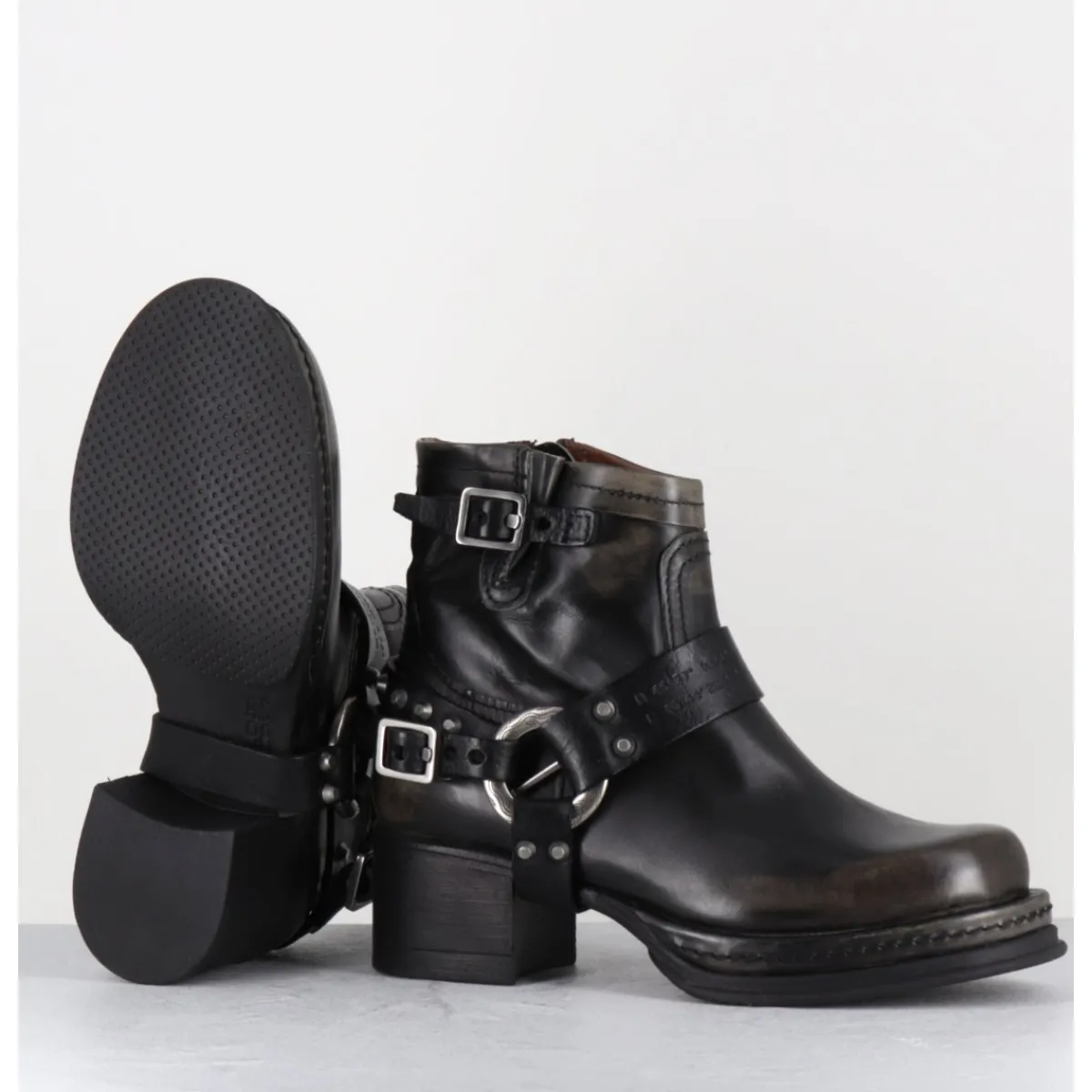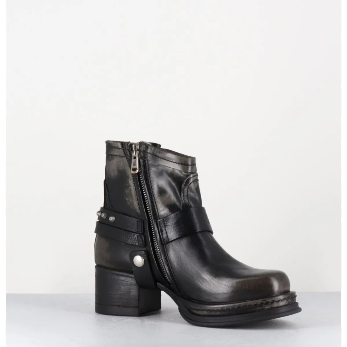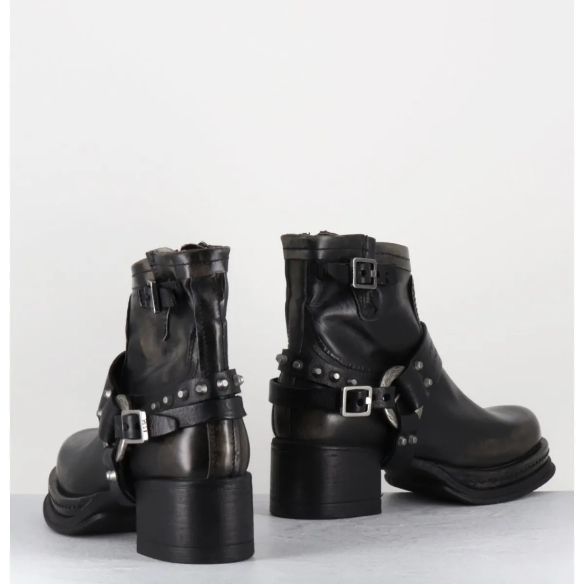 Boots bikers tige courte en cuir anthracite lustré avec patine vieilli à la main pour un effet vintage allant du gris au noir, ceinturon à clous argentés, bout arrondi, petit bride à boucle réglable sur la jambe, montées sur une semelle épaisse en gomme et un talon bloc confortable