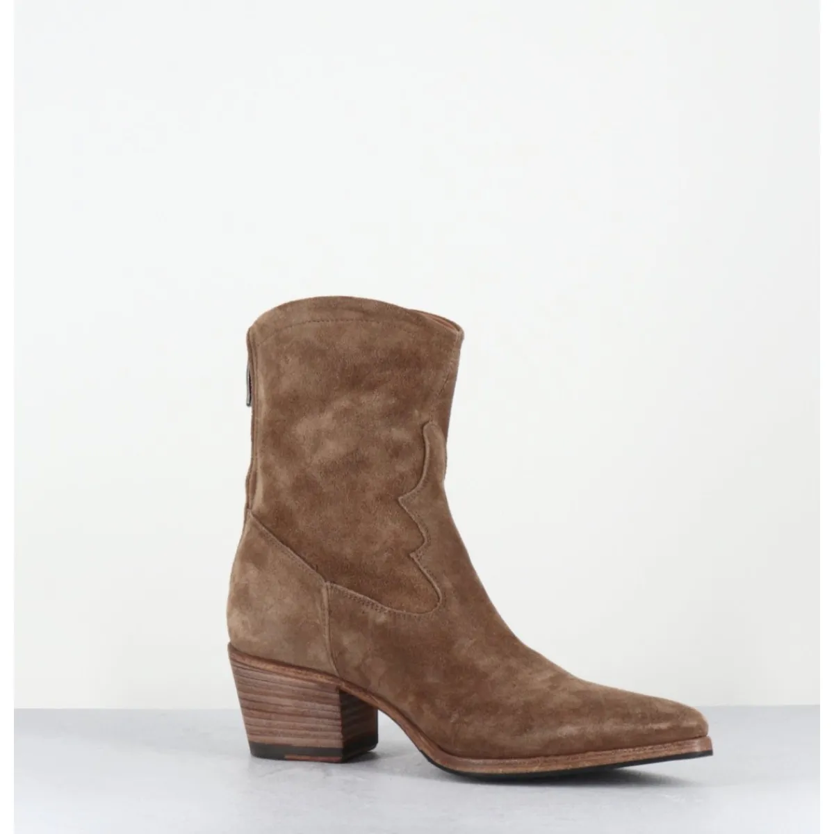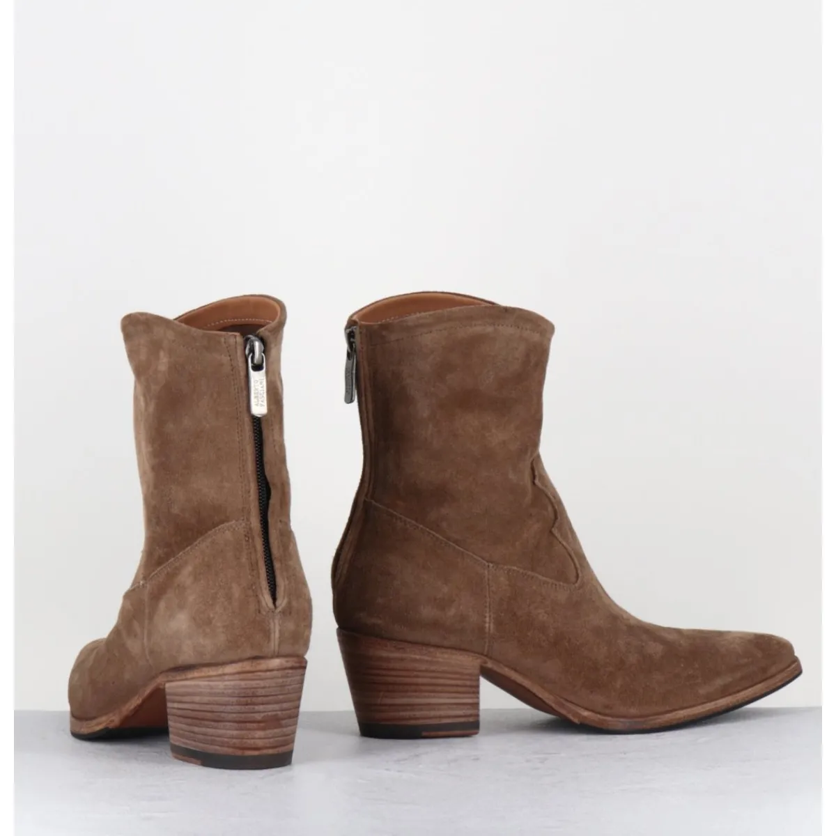 Boots en daim souple camel, ligne pure effilée esprit santiag, zip arrière, haut de la tige en partie non-doublée pour plus de souplesse, montées sur un talon trotteur très légèrement biseauté
