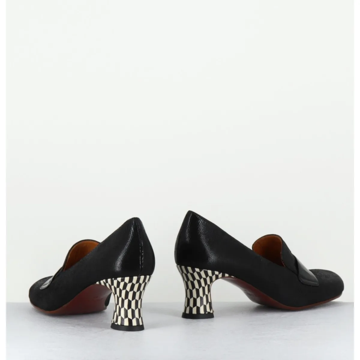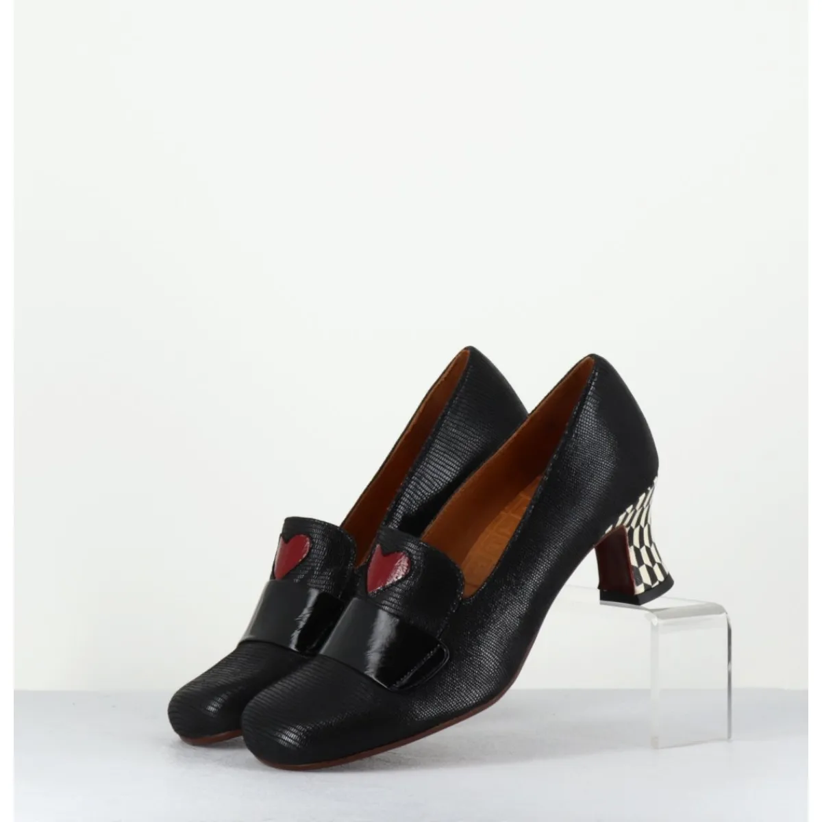 Chaussures en daim noir texturé, bout carré arrondi, orné d’un petit coeur rouge sur l’empeigne, montées sur un petit talon bobine au look rétro recouvert de cuir impression damier