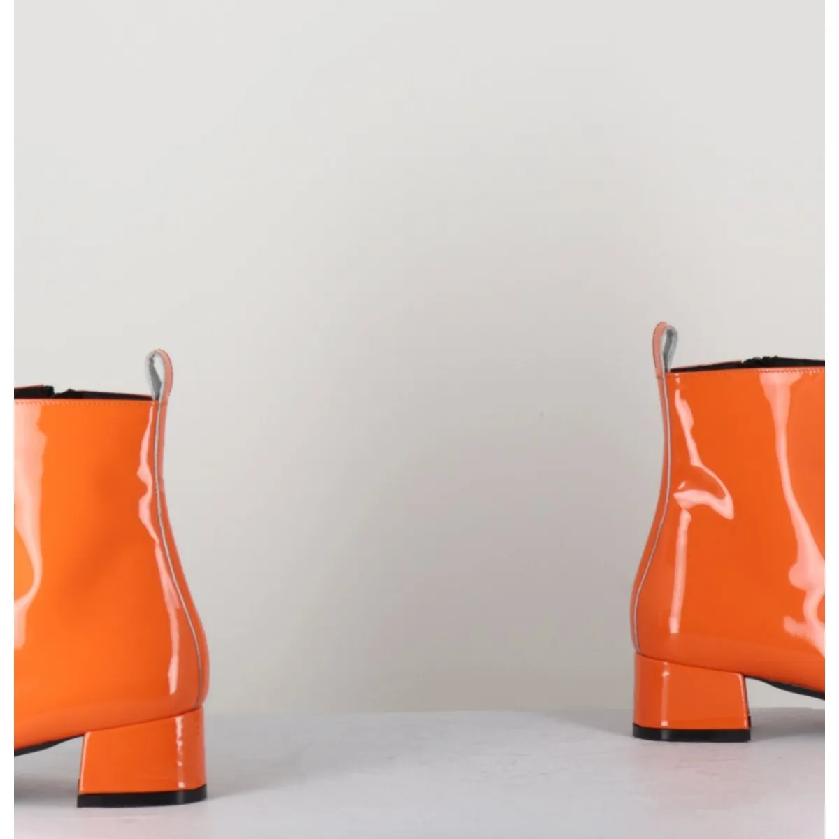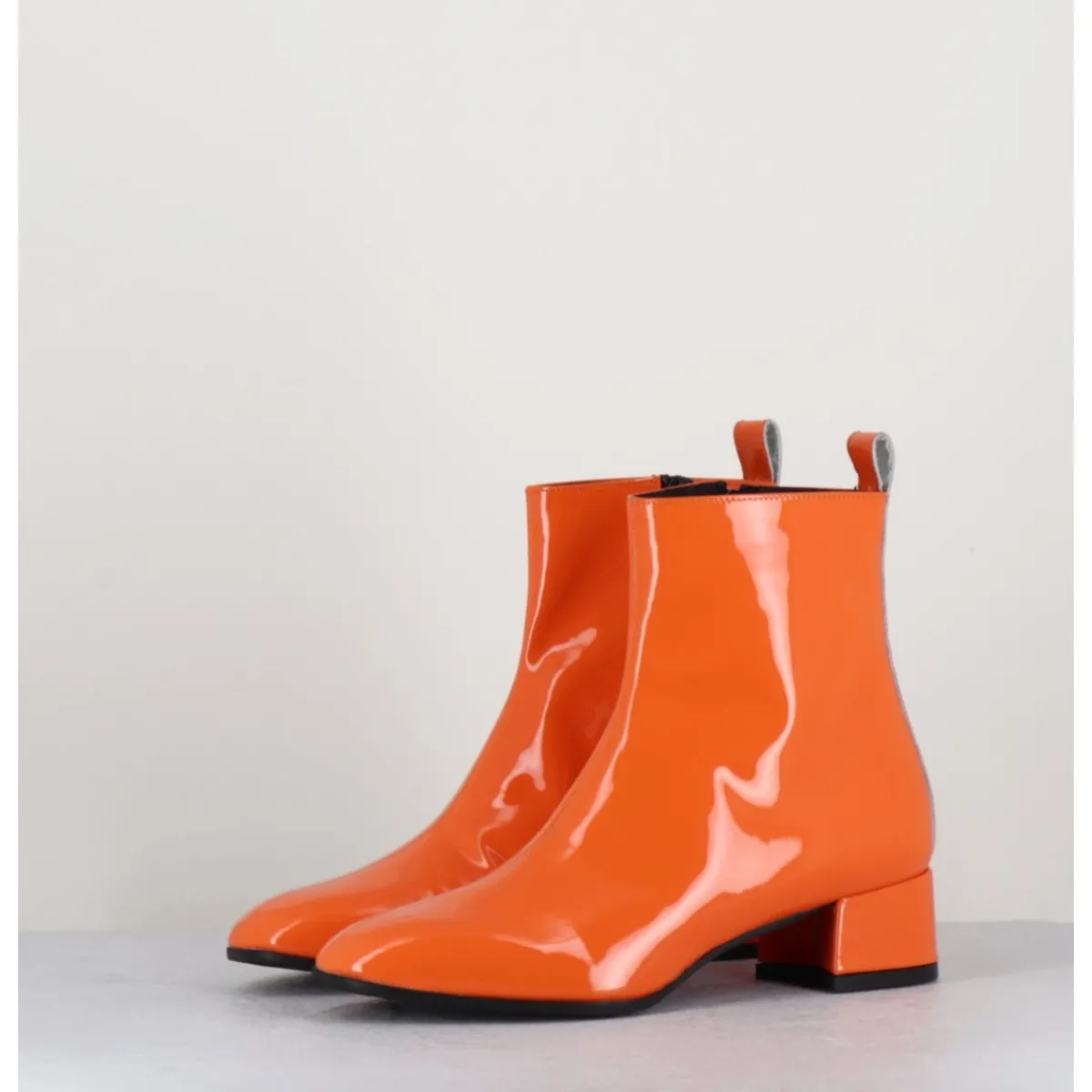 Boots 60s en cuir vernis orange, couture centrale rétro, bout en amande, zip intérieur, montées sur un petit talon bloc recouvert confortable.