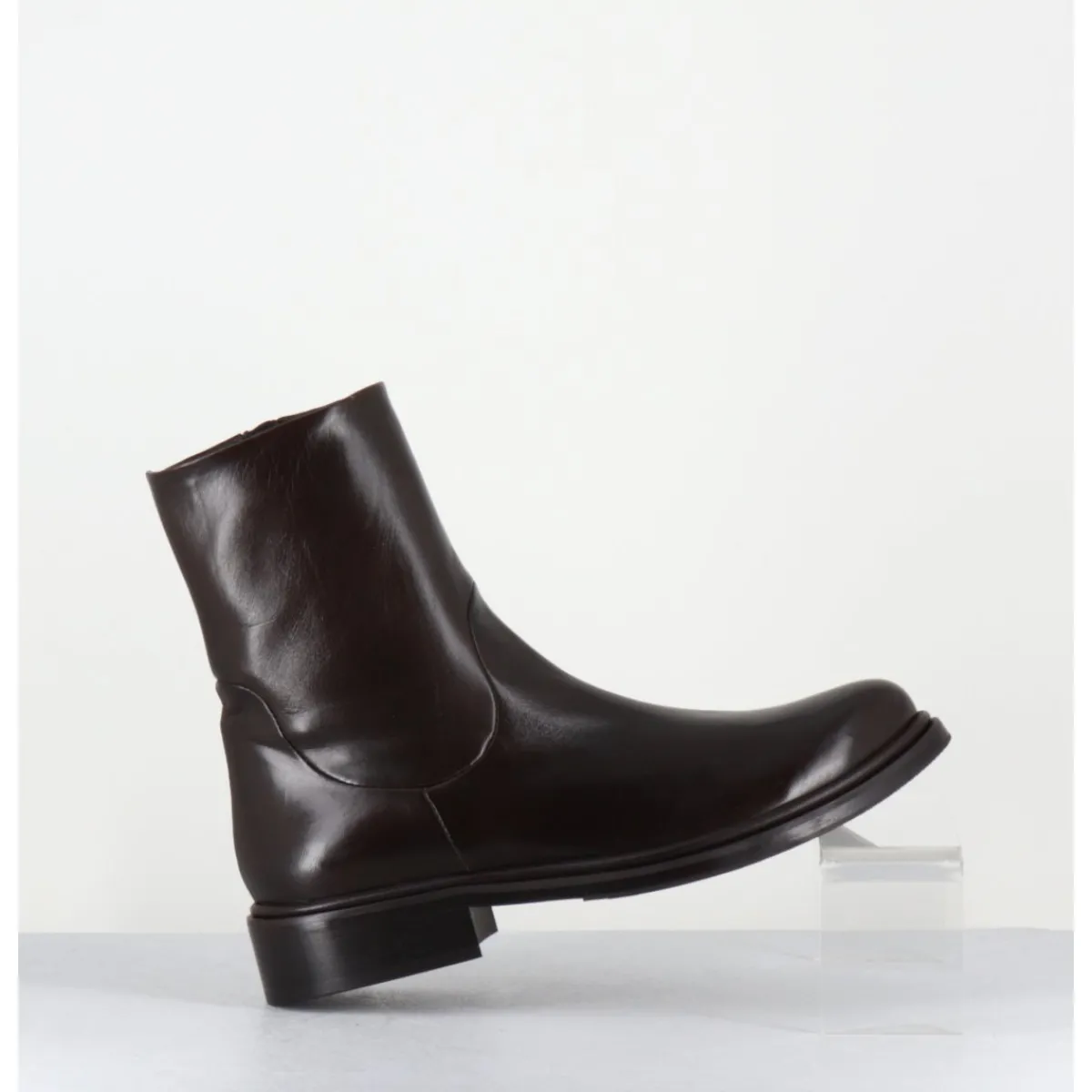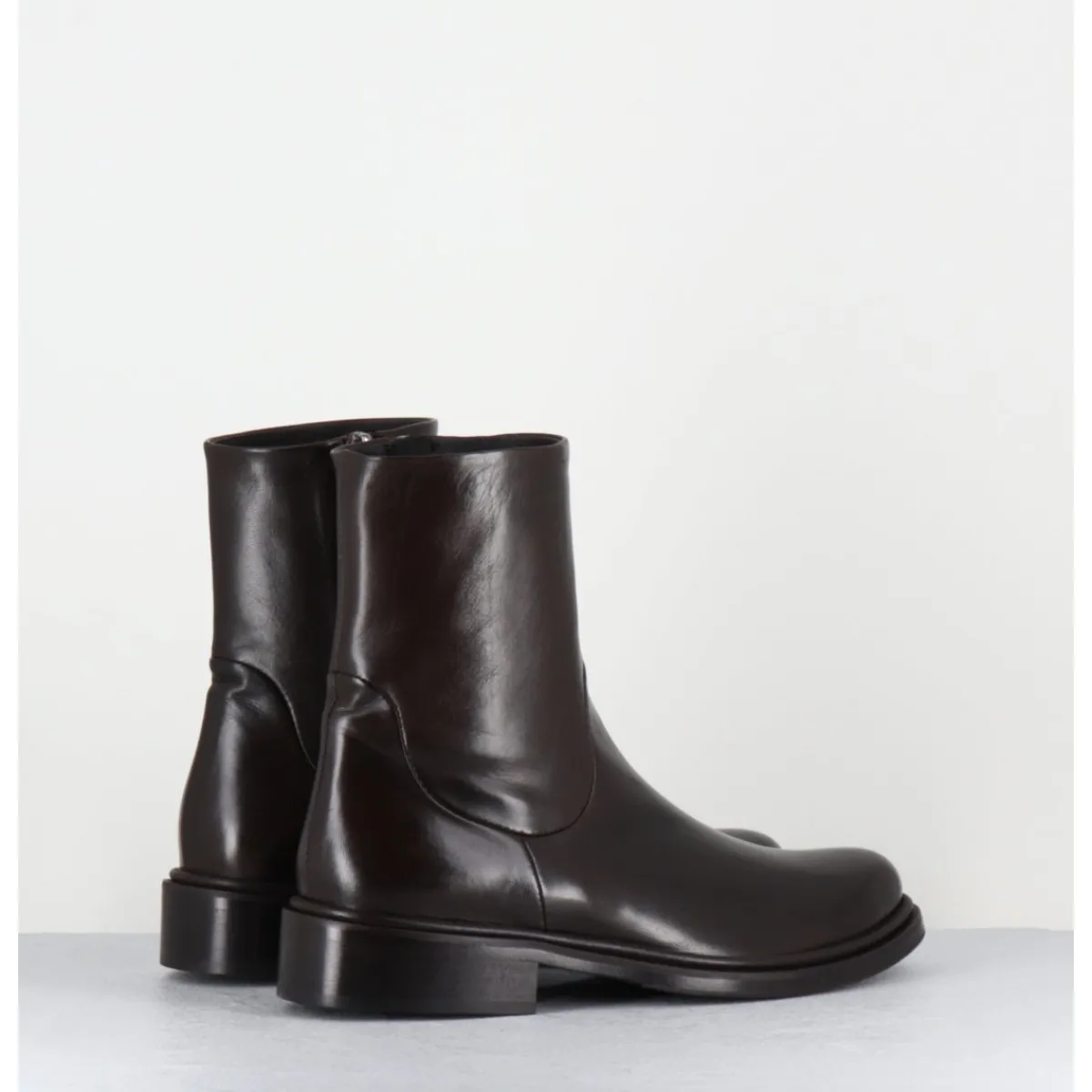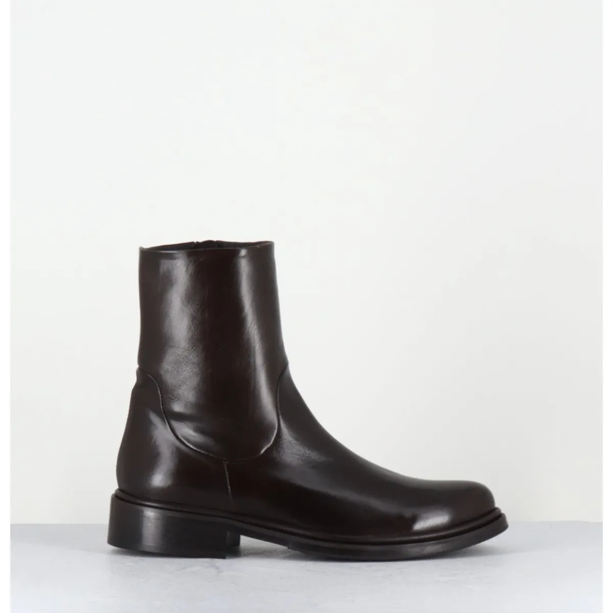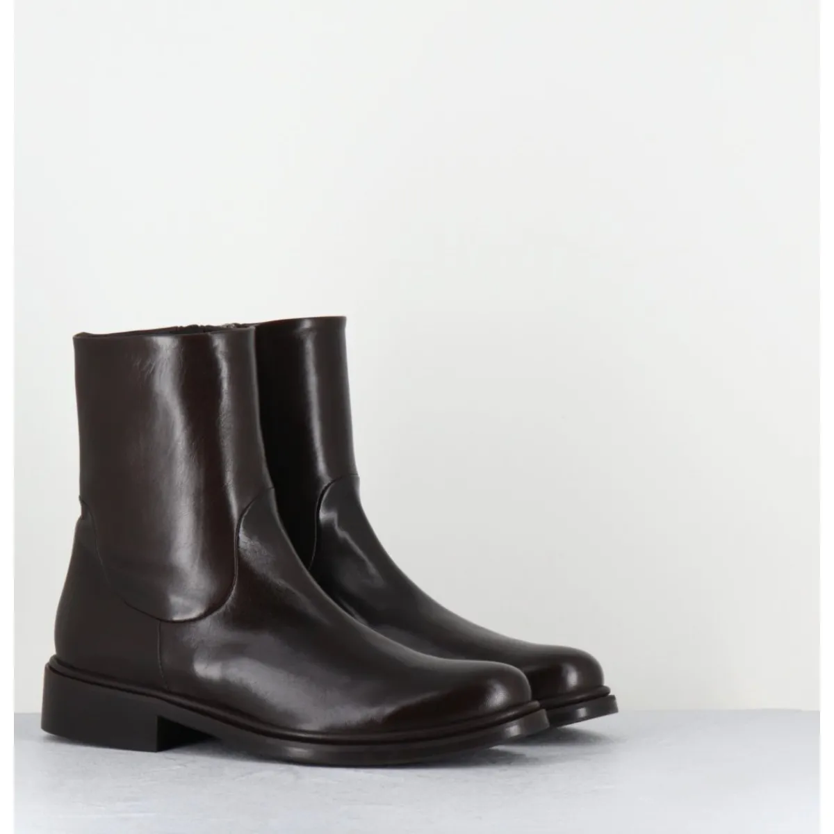 Boots en cuir marron extrêmement souple, ligne pure effilée à bout en amande, zip intérieur, montées sur une semelle de cuir avec insert de gomme