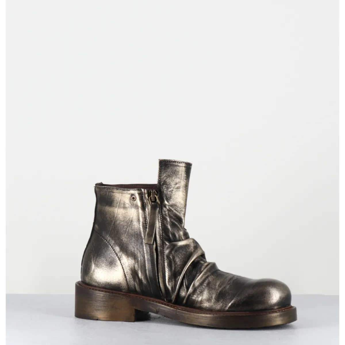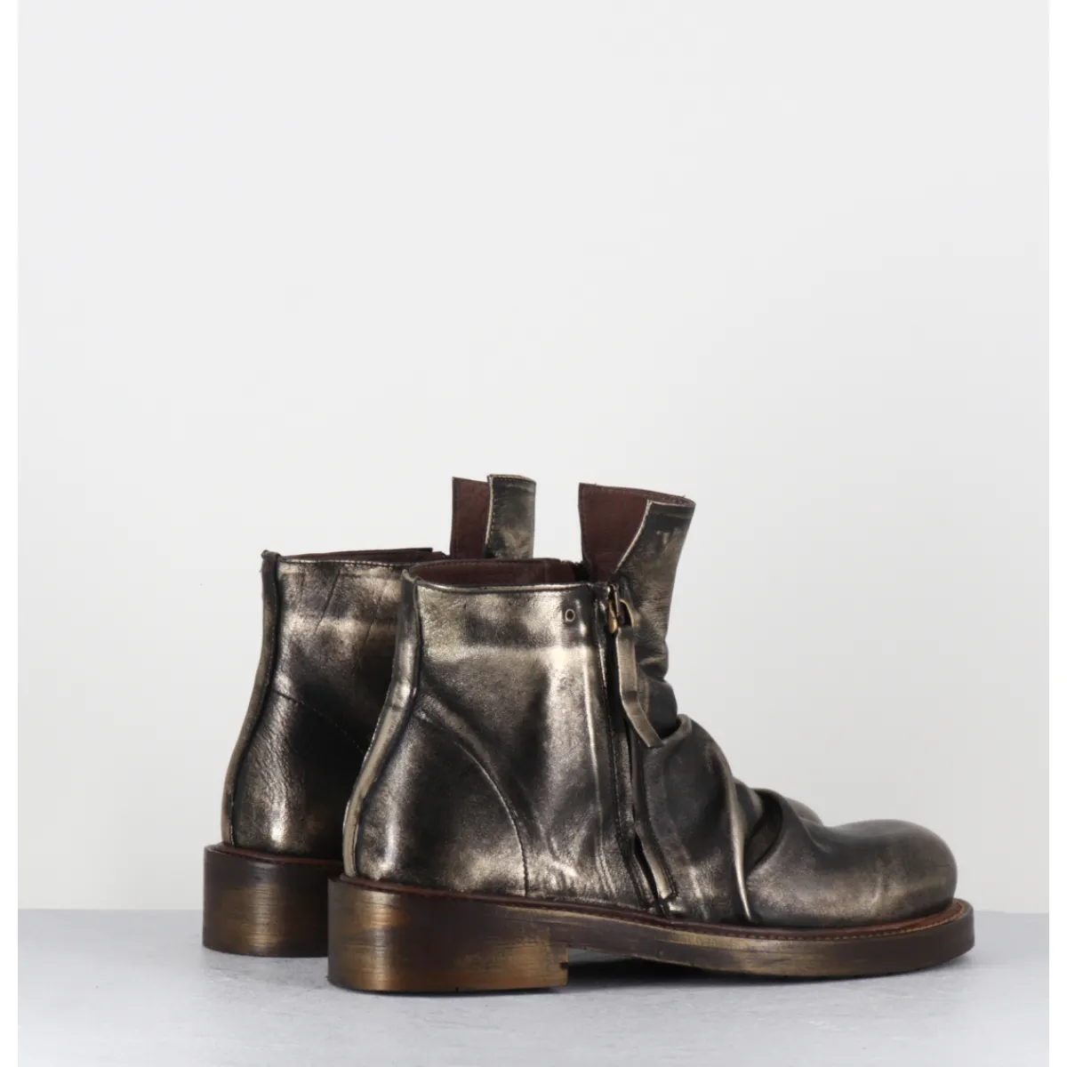 Boots courtes en cuir métallisé doré brossé au noir pour un effet ‘usé’, travail de plis à l’avant, bout rond & double zip