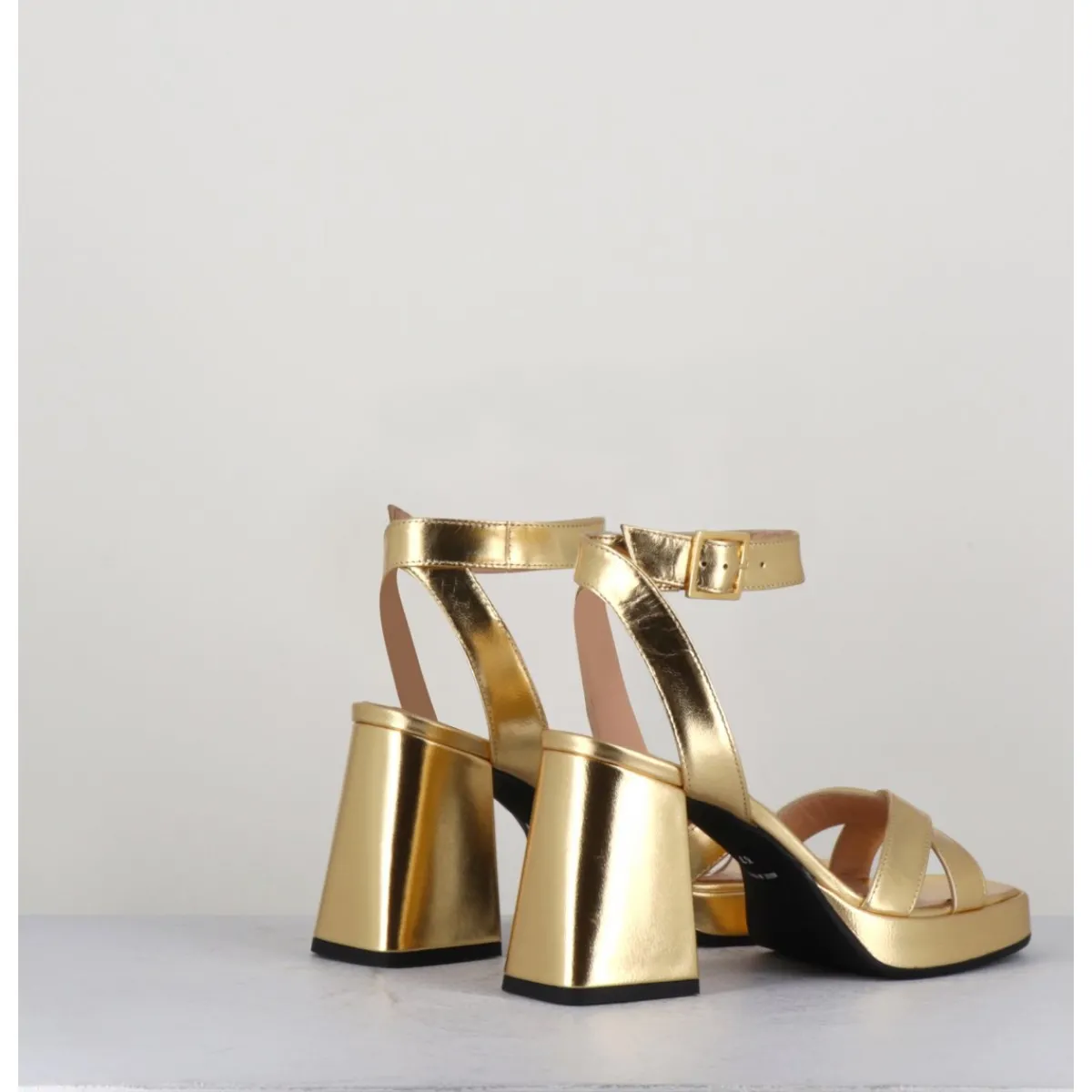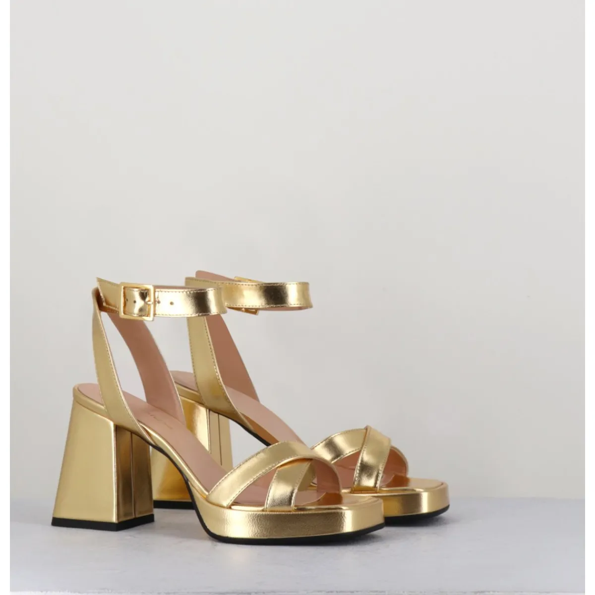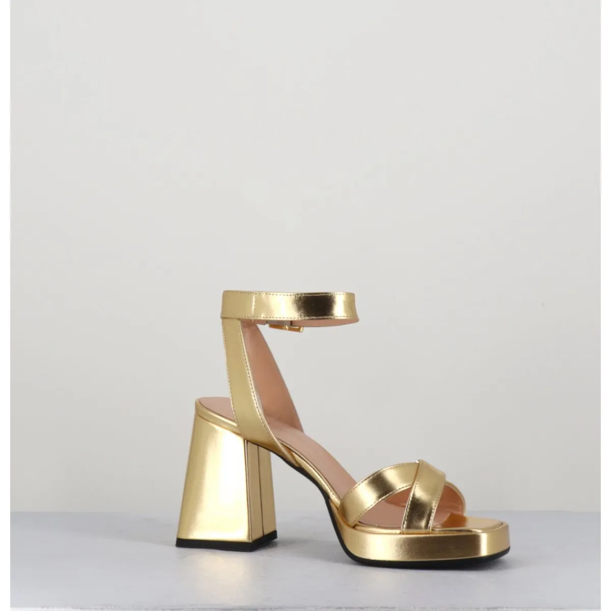 Sandales à plateforme 90s bout carré en cuir métallisé doré, bride cheville réglable, montées sur un talon large légèrement évasé.