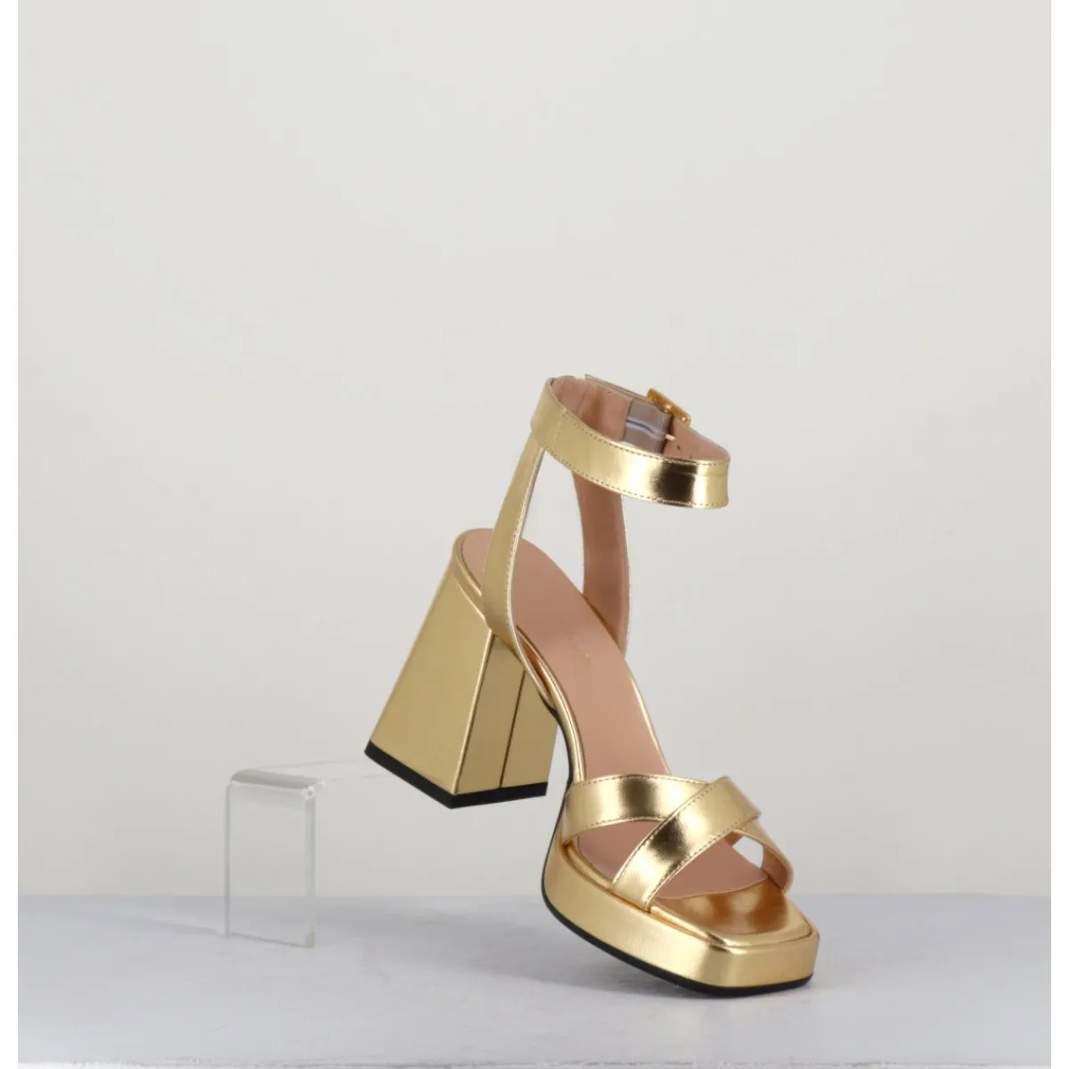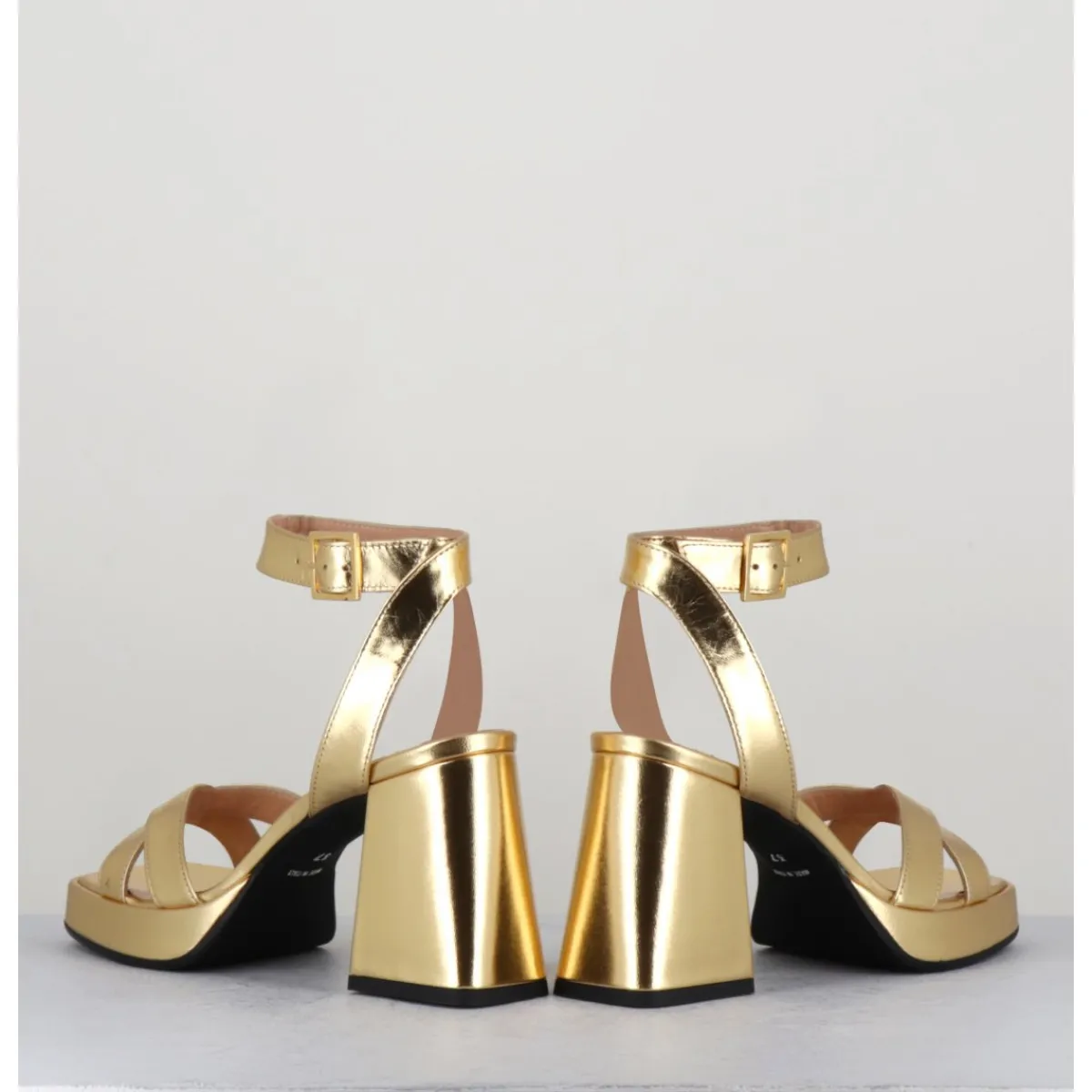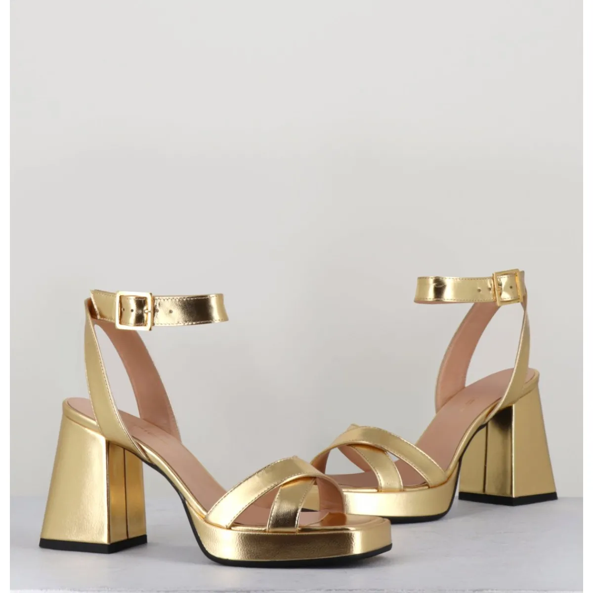 Sandales à plateforme 90s bout carré en cuir métallisé doré, bride cheville réglable, montées sur un talon large légèrement évasé.