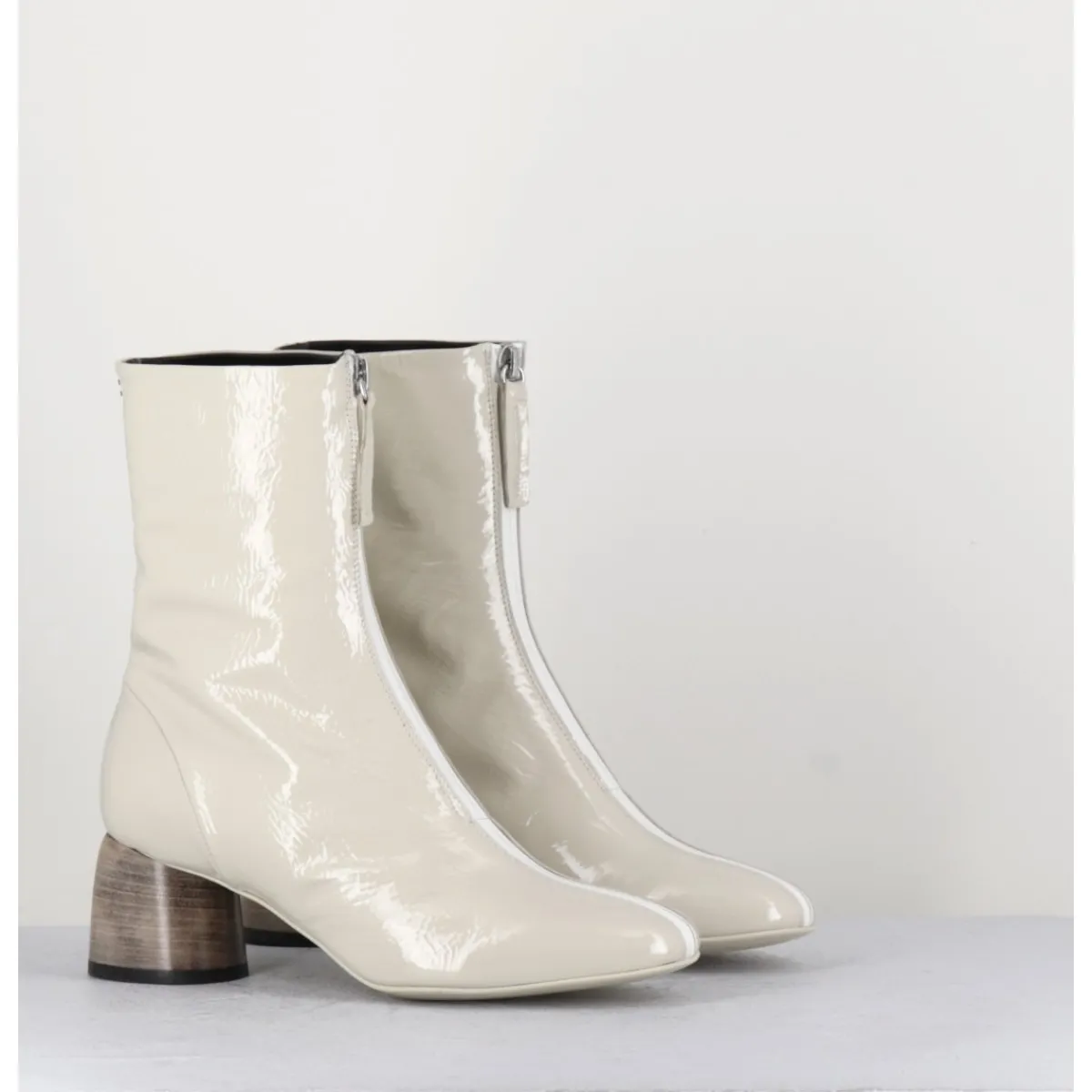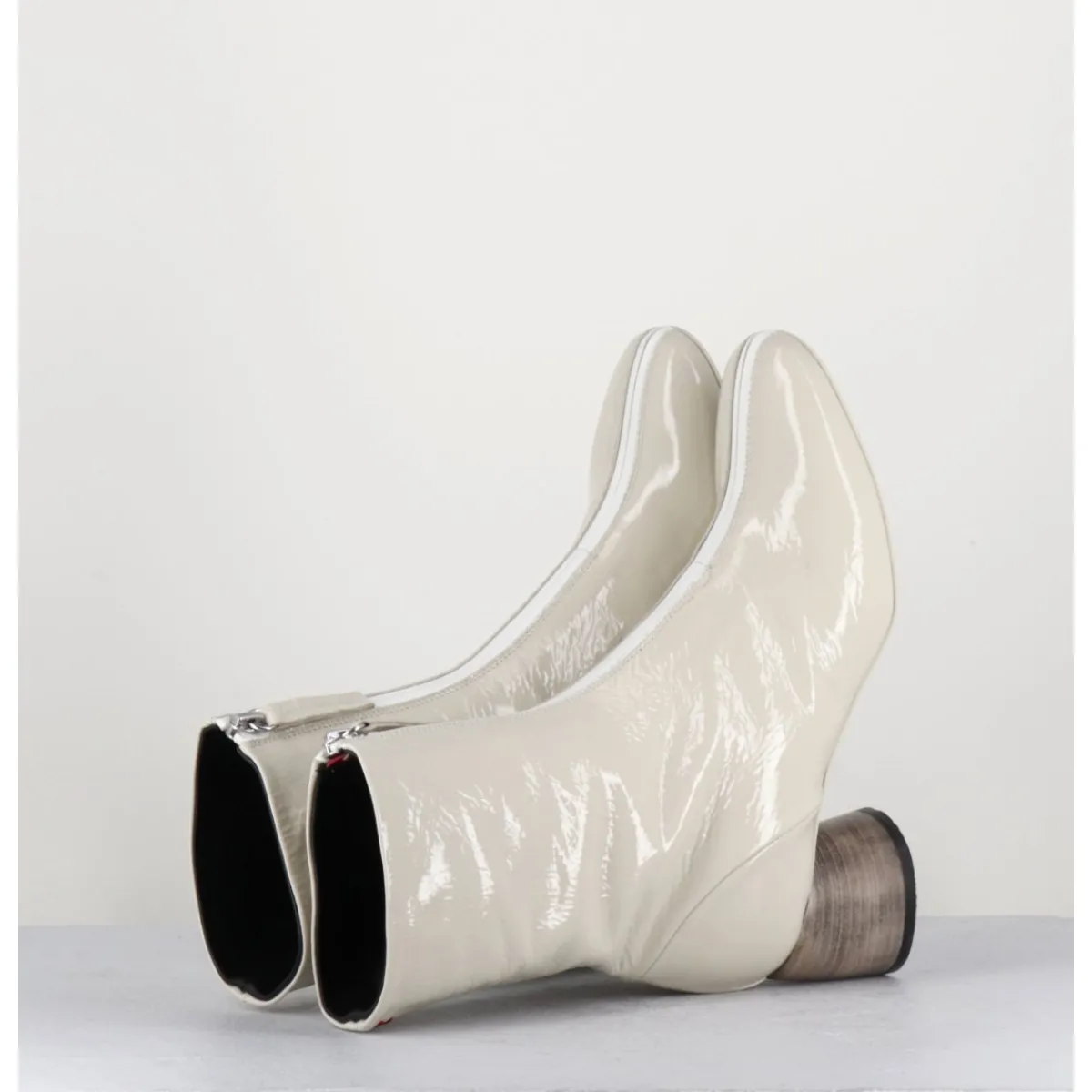 Boots en cuir vernis souple blanc cassé, zip central esprit 60s, montées sur un petit talon cylindrique stylisé peint à la main en gris dégradé. Space Age !