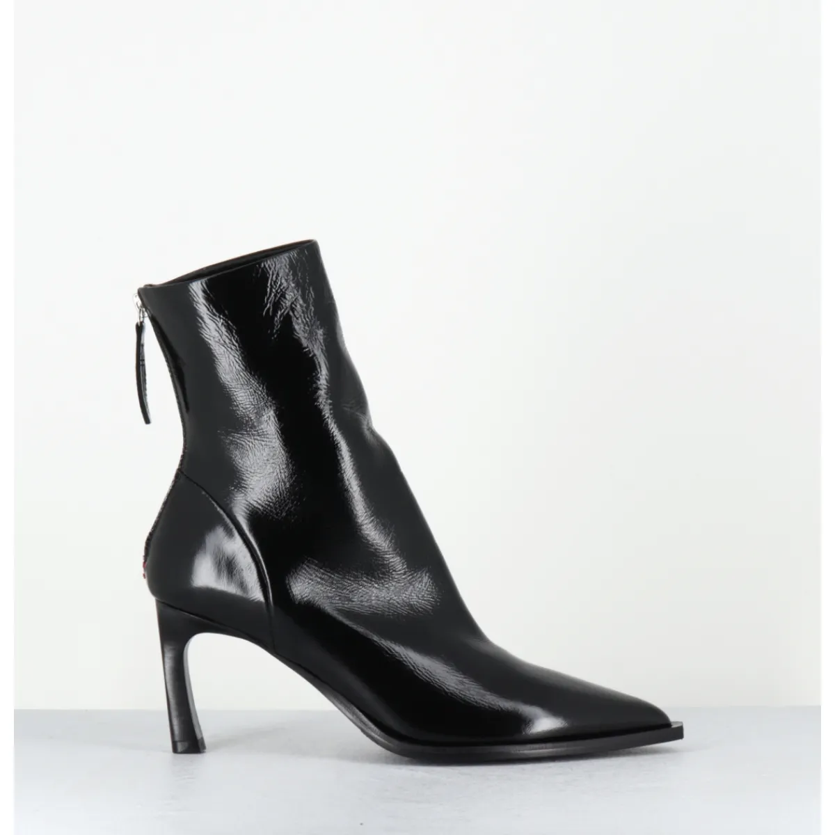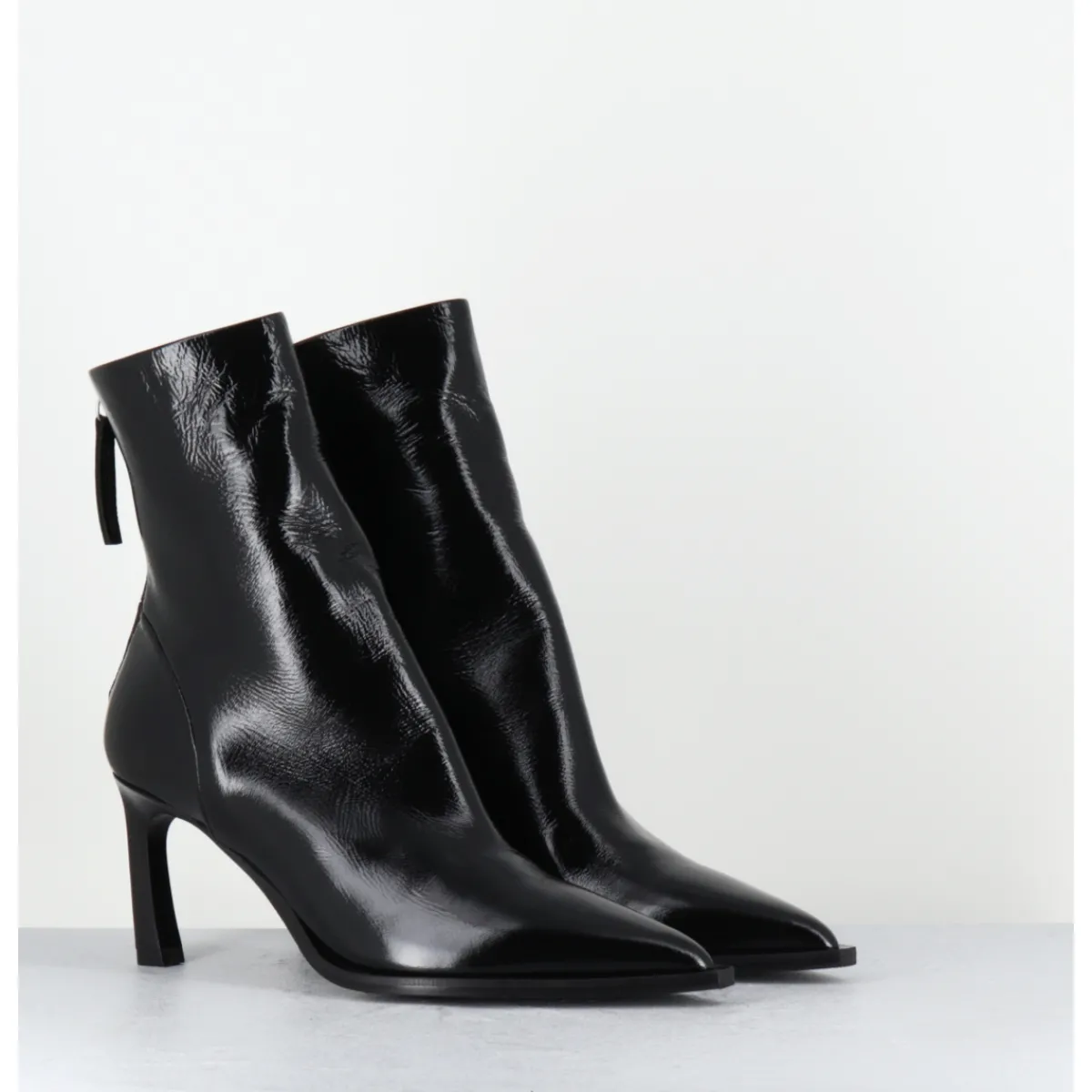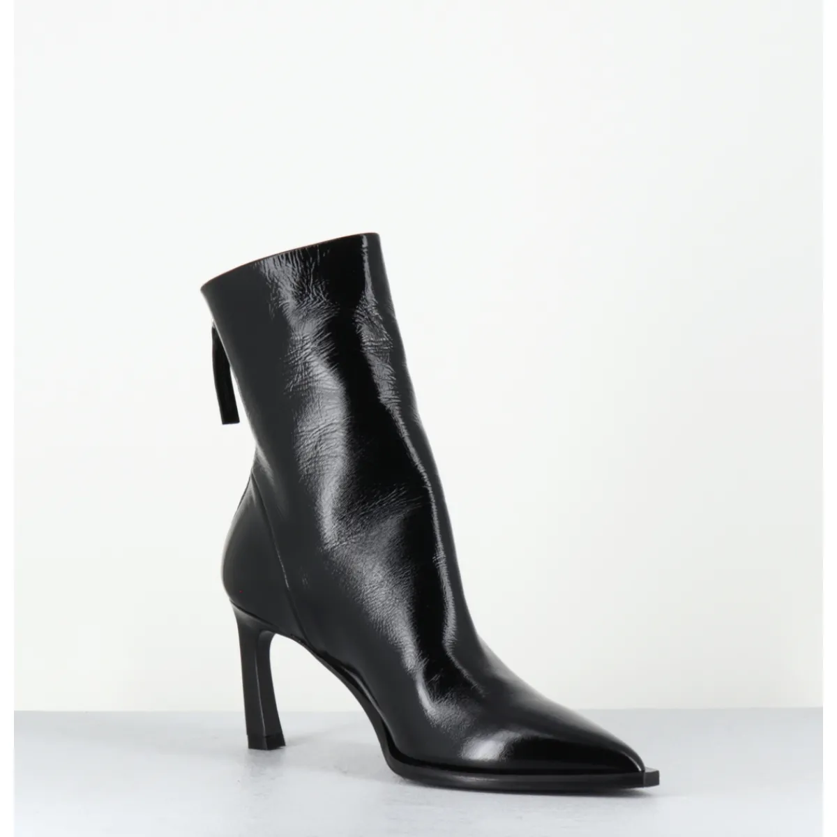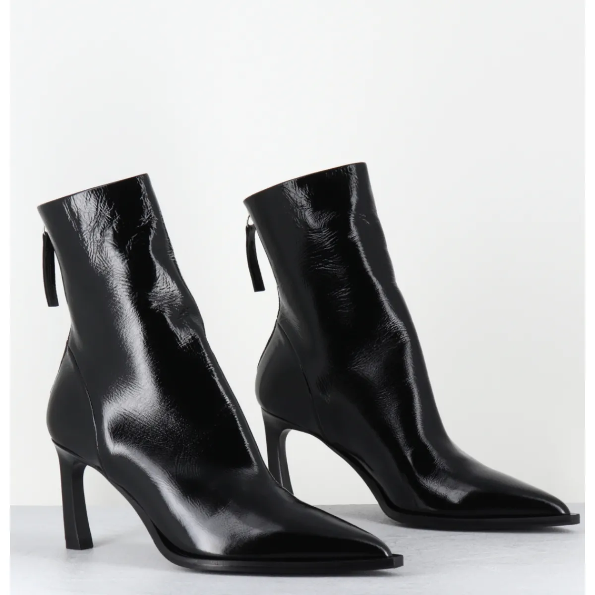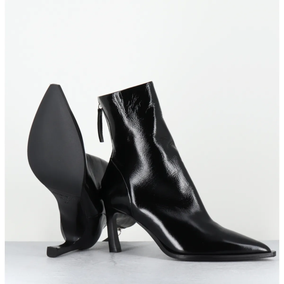 Boots bout pointu en cuir noir souple finition brillante, montées sur un talon fin stylisé et une semelle à débord noire