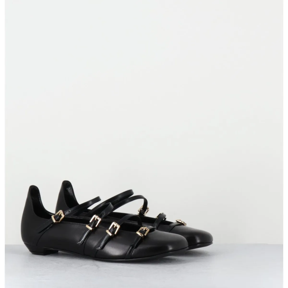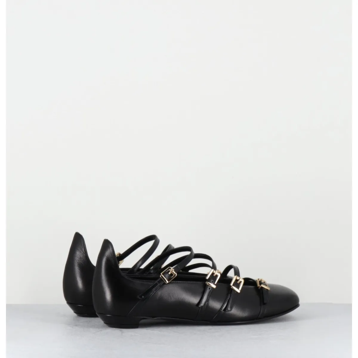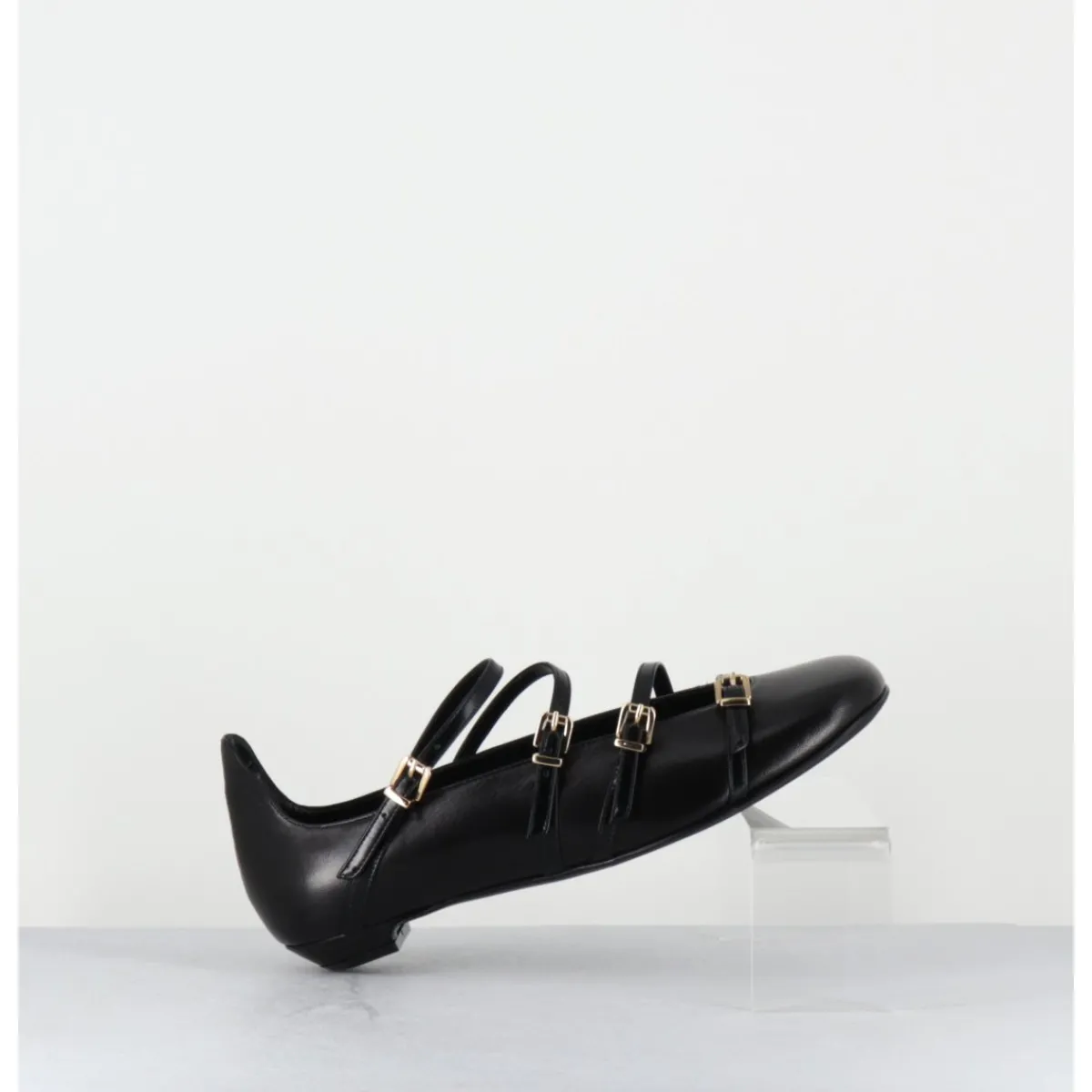Ballerines multi-brides en cuir noir, petites boucles dorées réglables, bout carré arrondi, montées sur un tout petit talon légèrement biseauté