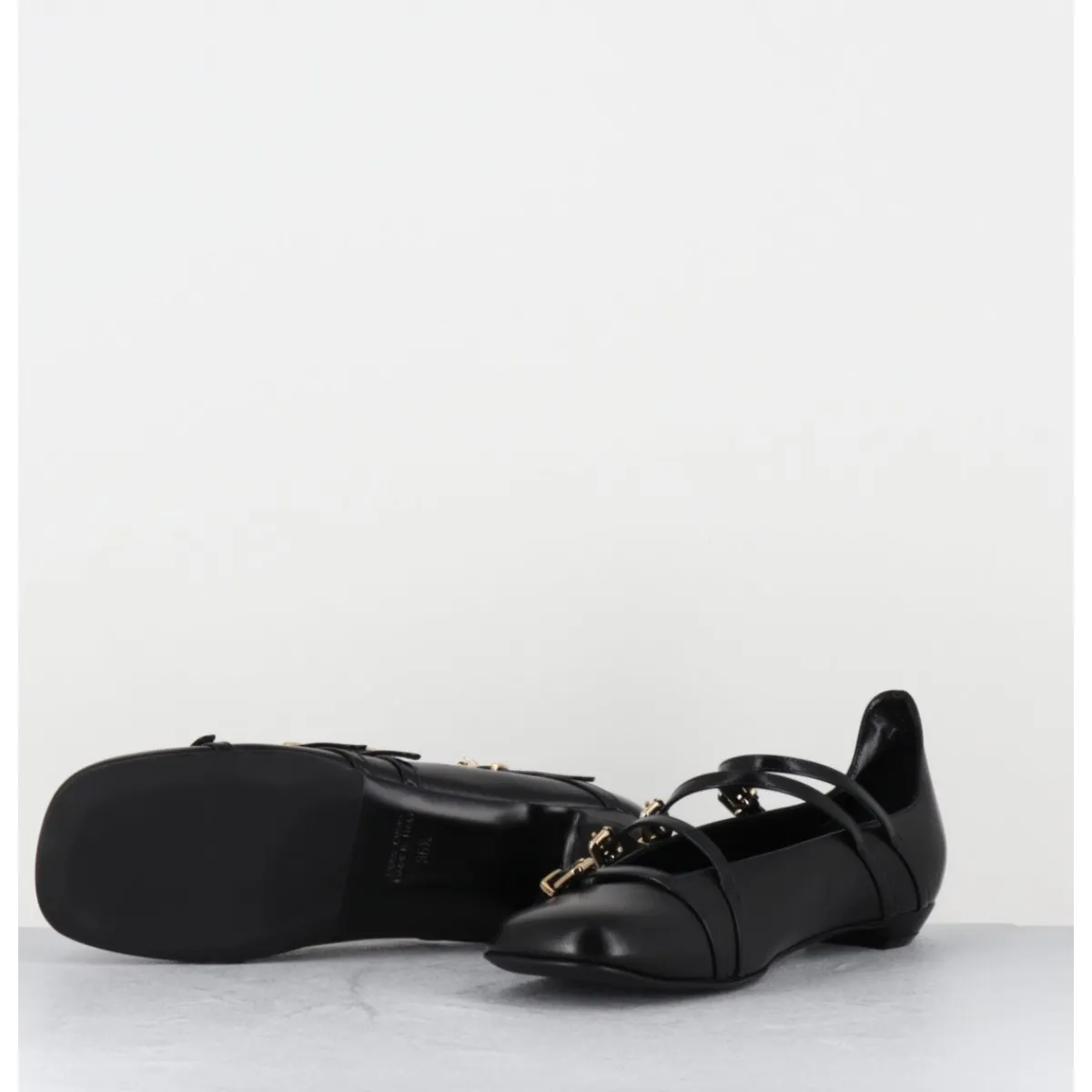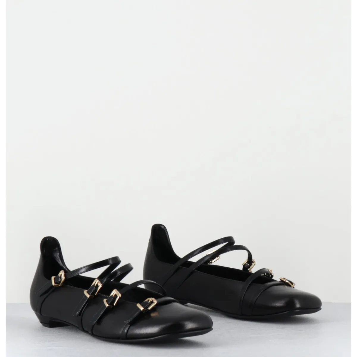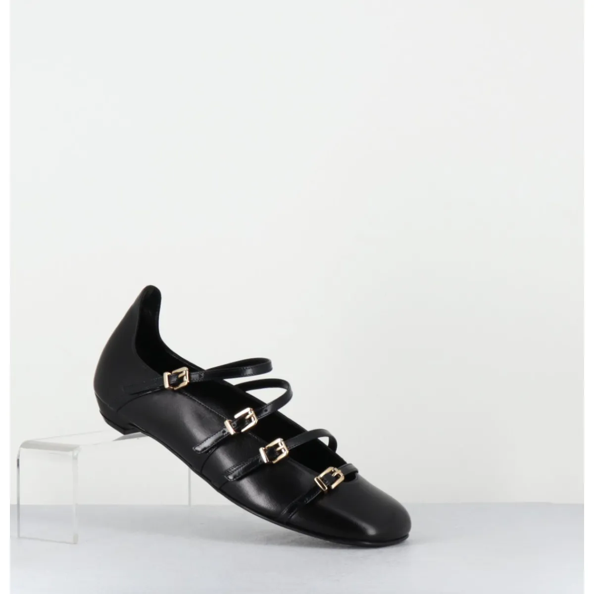 Ballerines multi-brides en cuir noir, petites boucles dorées réglables, bout carré arrondi, montées sur un tout petit talon légèrement biseauté