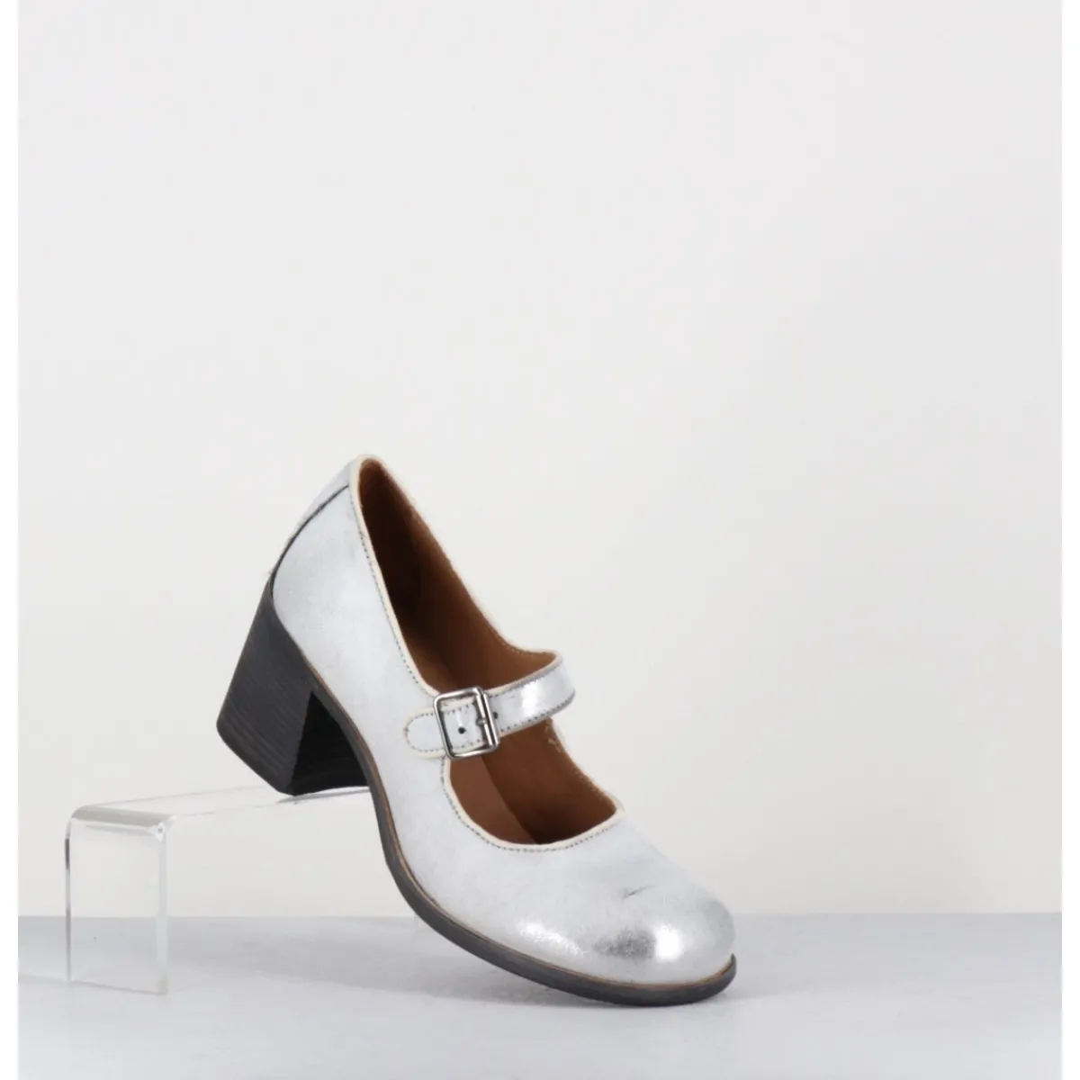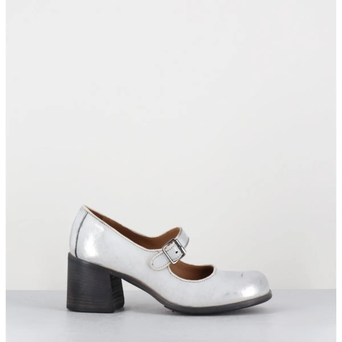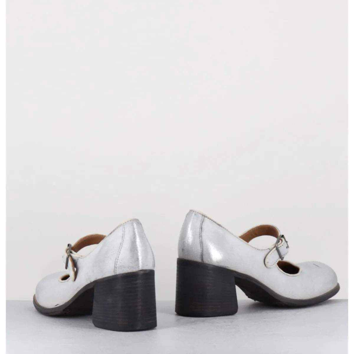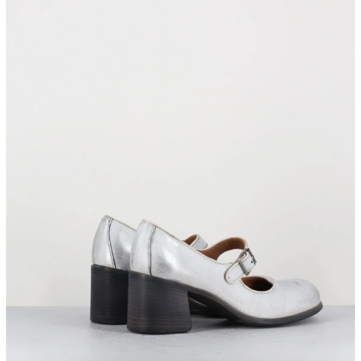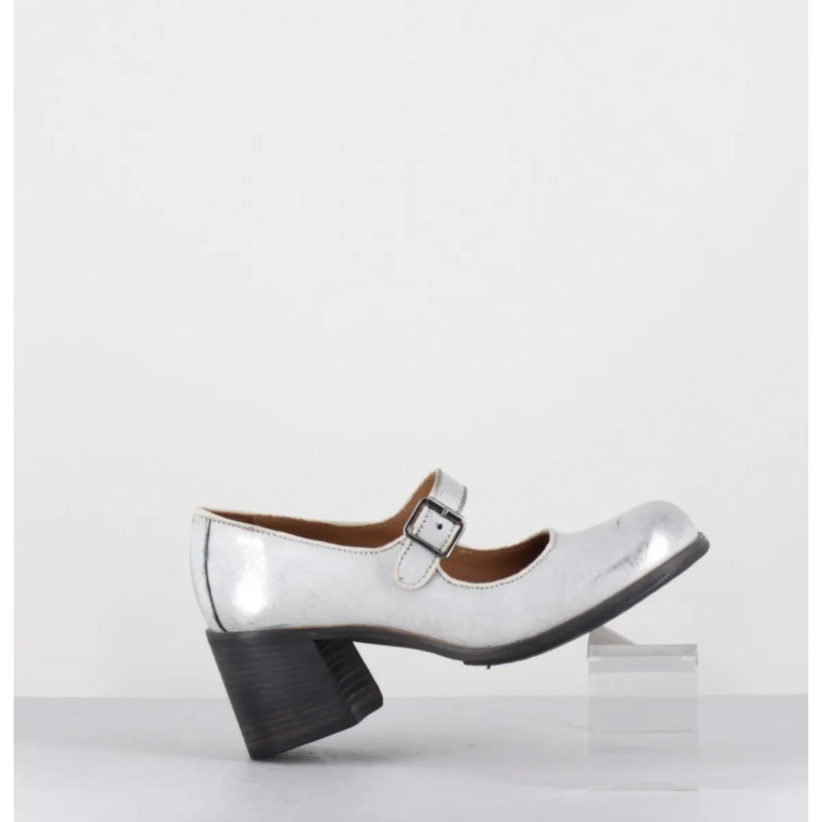Chaussures babies en cuir souple métallisé argent, ligne pure esprit avant-garde, bout carré-arrondi, montées sur une semelle cousue et lavée à la main pour un effet usé et un talon bloc confortable