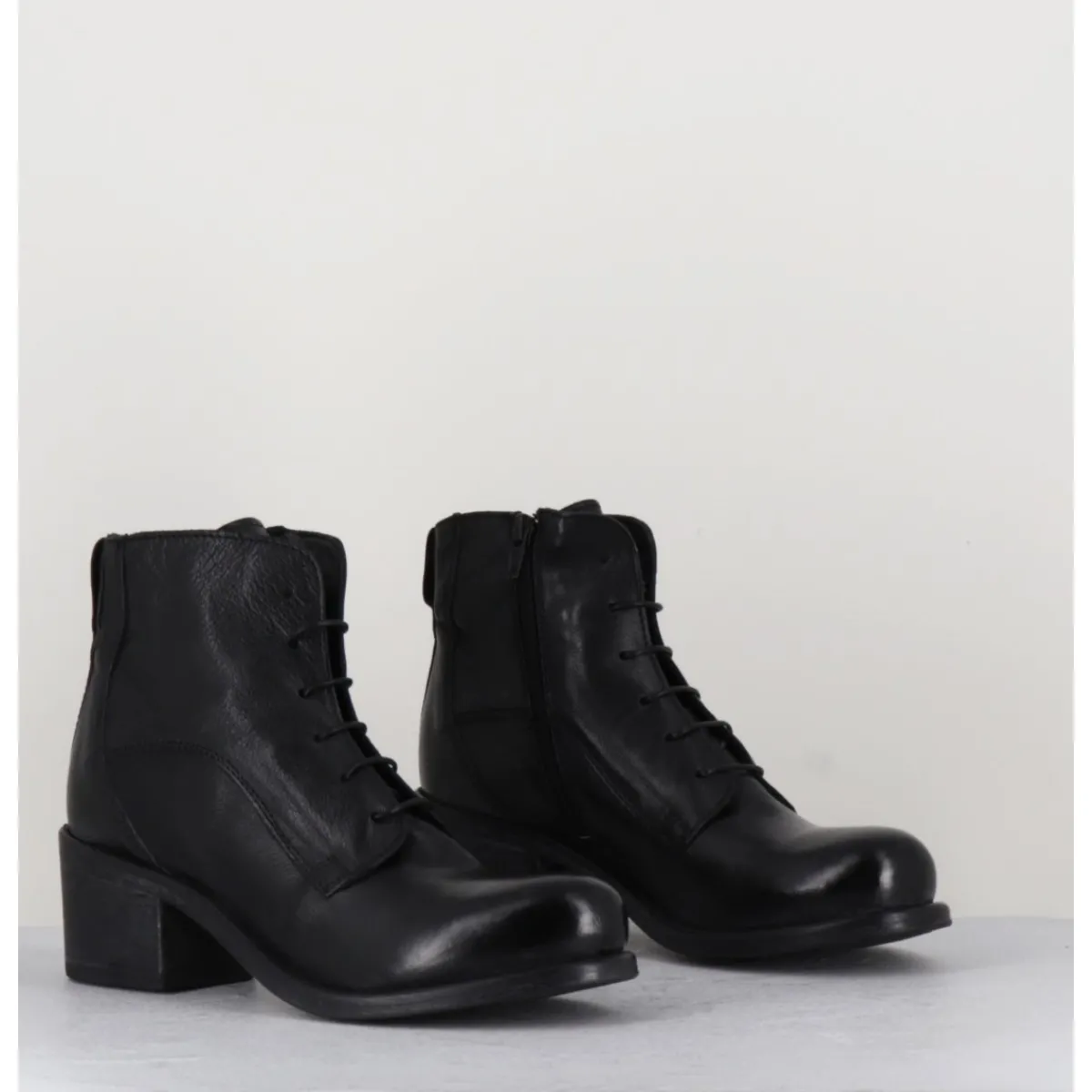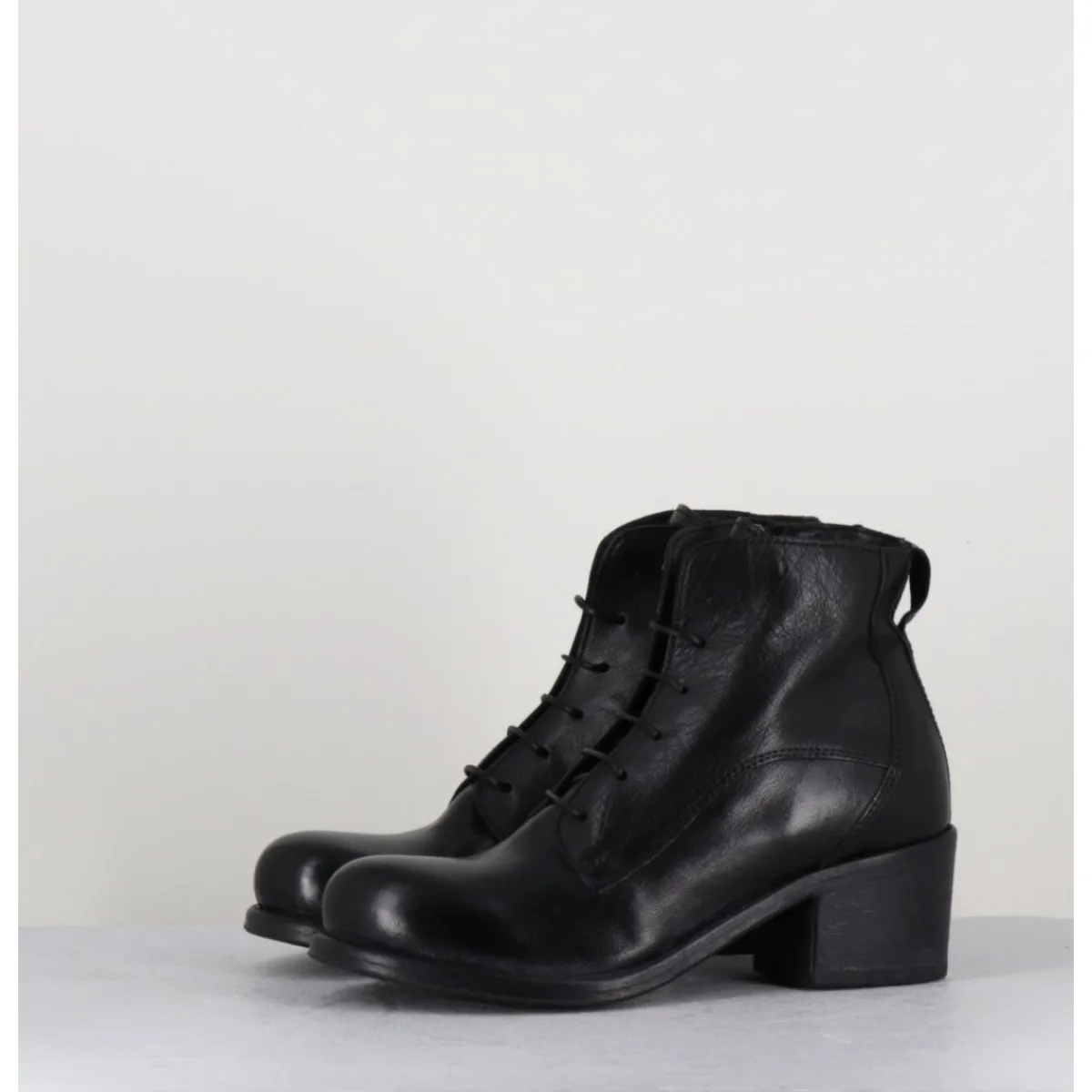 Chaussures en cuir noir, zip intérieur, bout rond, empiècements & coutures ton sur ton, lacets fins noirs montées sur un talon bloc confortable et une semelle cousue main.