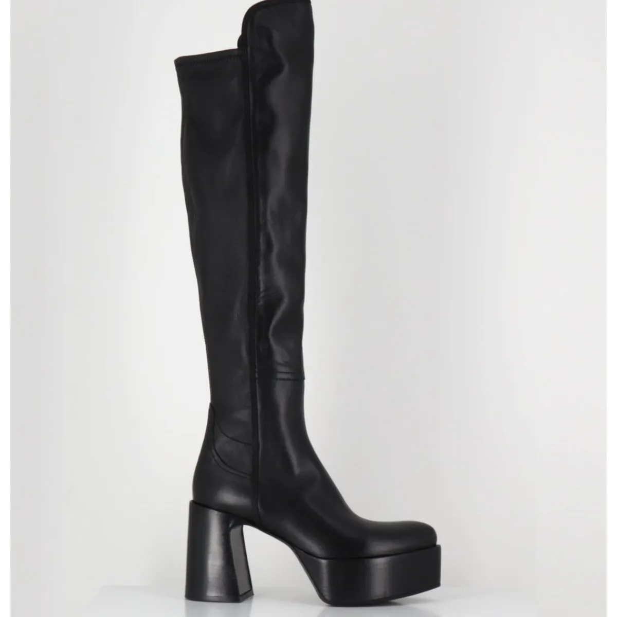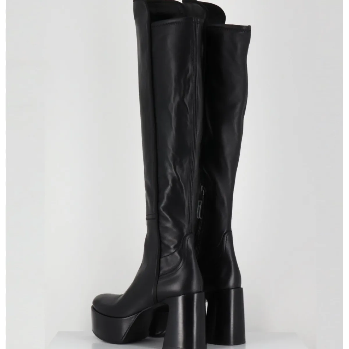 Bottes cuissardes à plateforme en cuir souple & agneau stretch à l’arrière pour un effet galbant, bout pointu soft, zip intérieur, montées sur un talon large