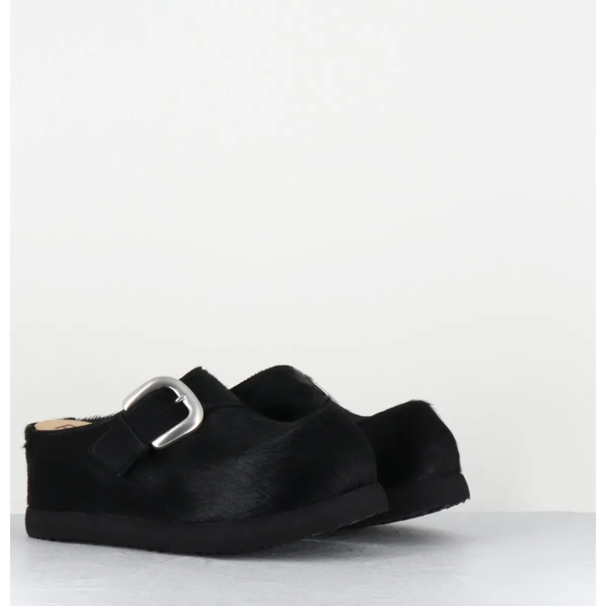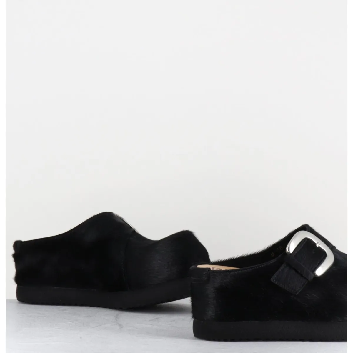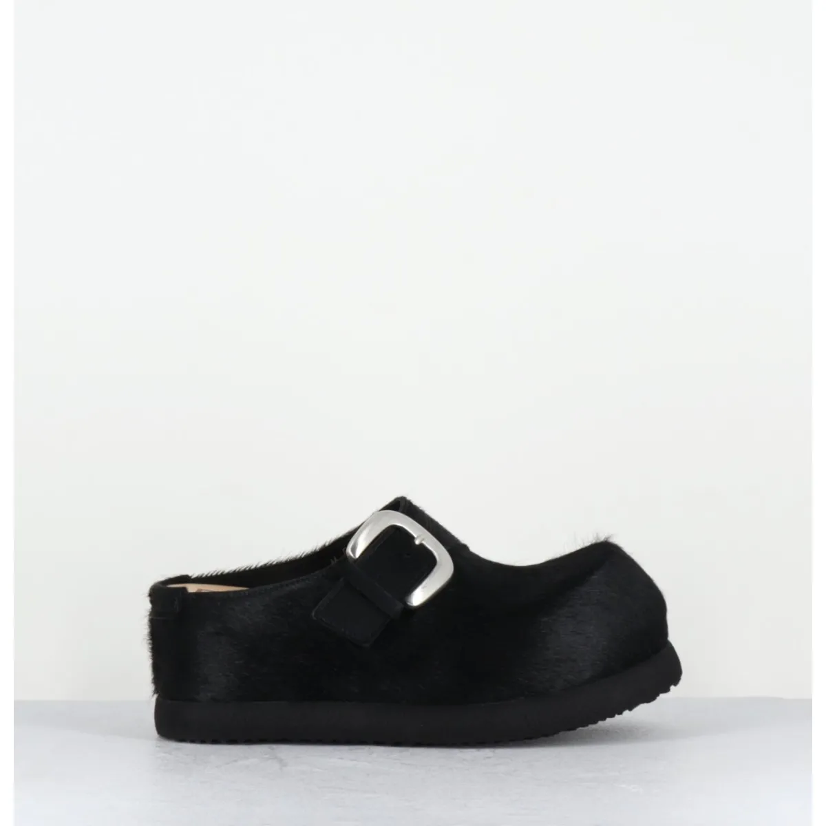 Chaussures sabots en ‘poulain’ noir, forme exagérée et déstructurée à l’avant, boucle argent mat, semelle intérieure à mémoire de forme amovible, montées sur une plateforme ultra légère et une semelle en micro-fibre