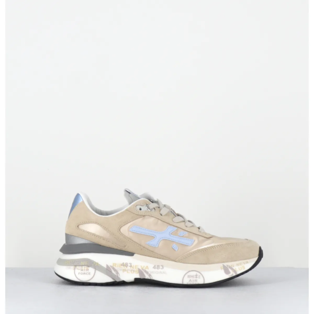 Sneakers esprit années 90, semelle ultra light innovante chez Premiata, daim beige et empiècement de toile nylon avec détails cuir bleu ciel, montées sur une semelle épaisse blanche en micro fibre, avec imprimé signature de la Maison Italienne Premiata.