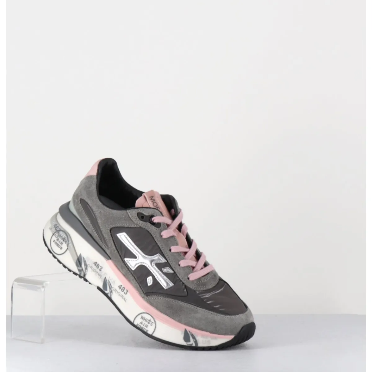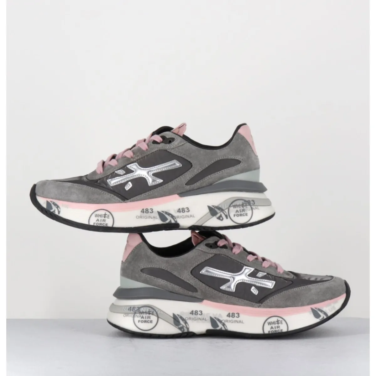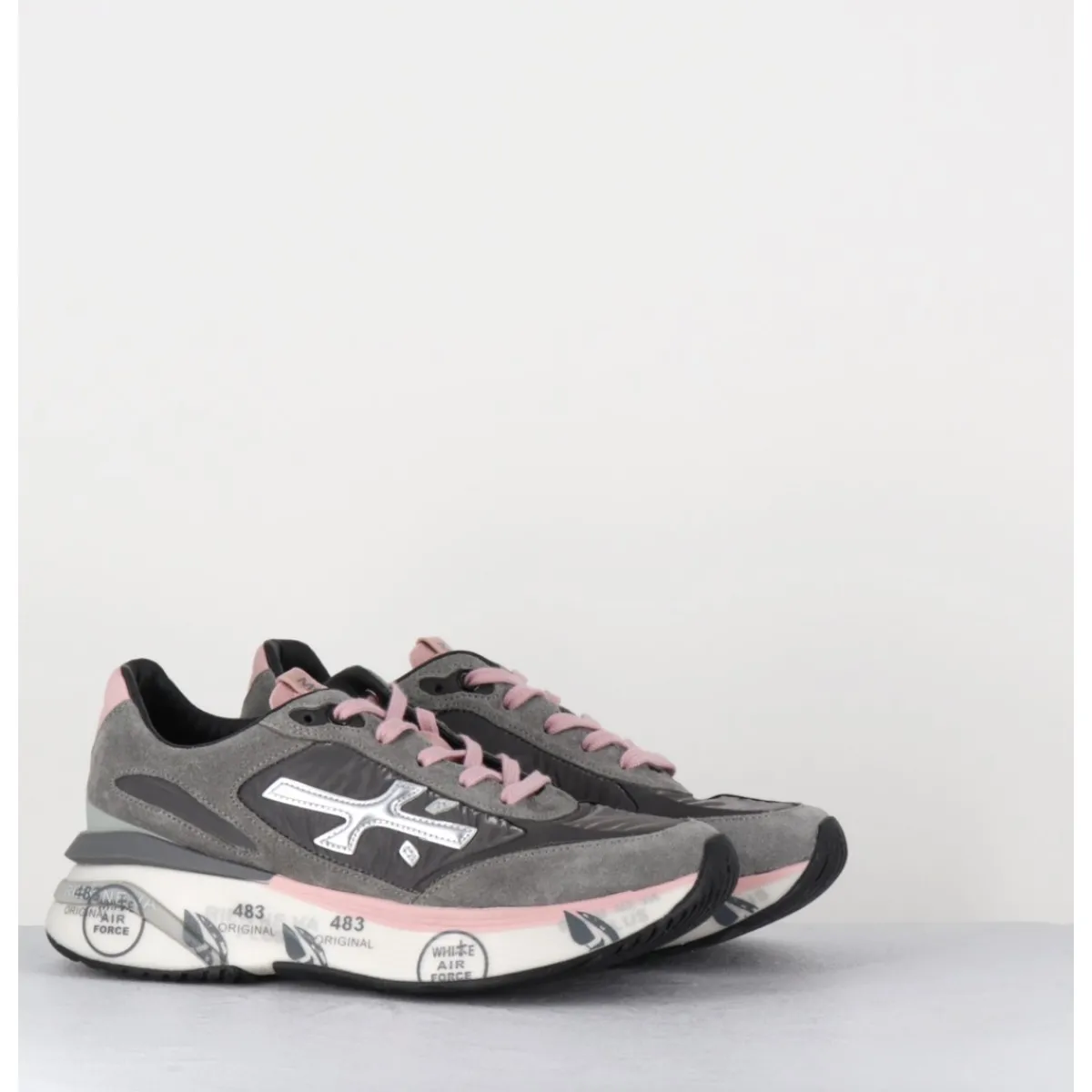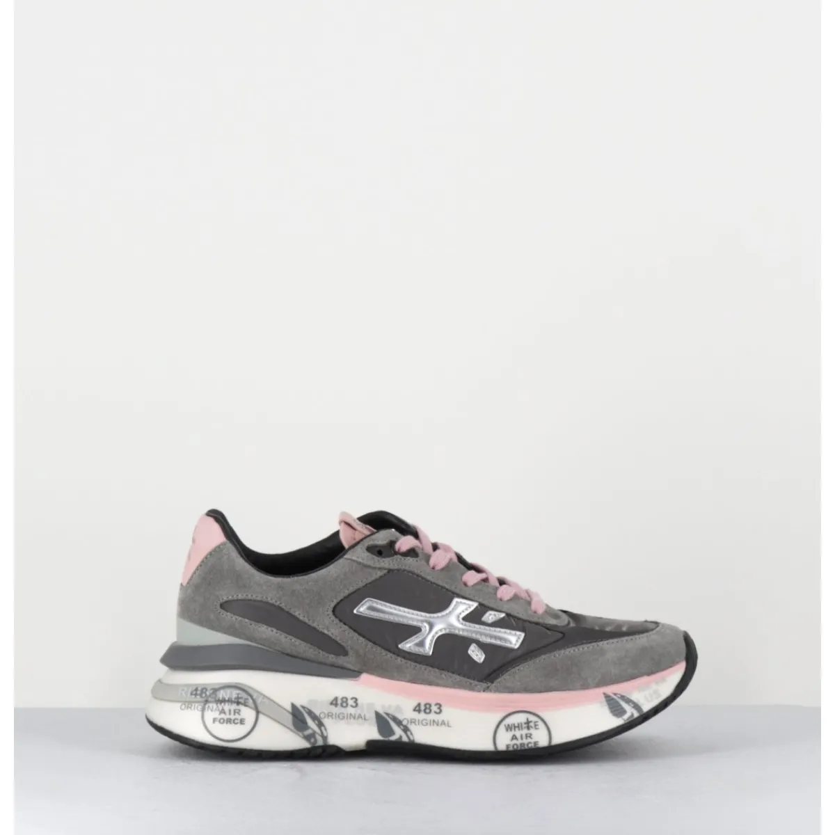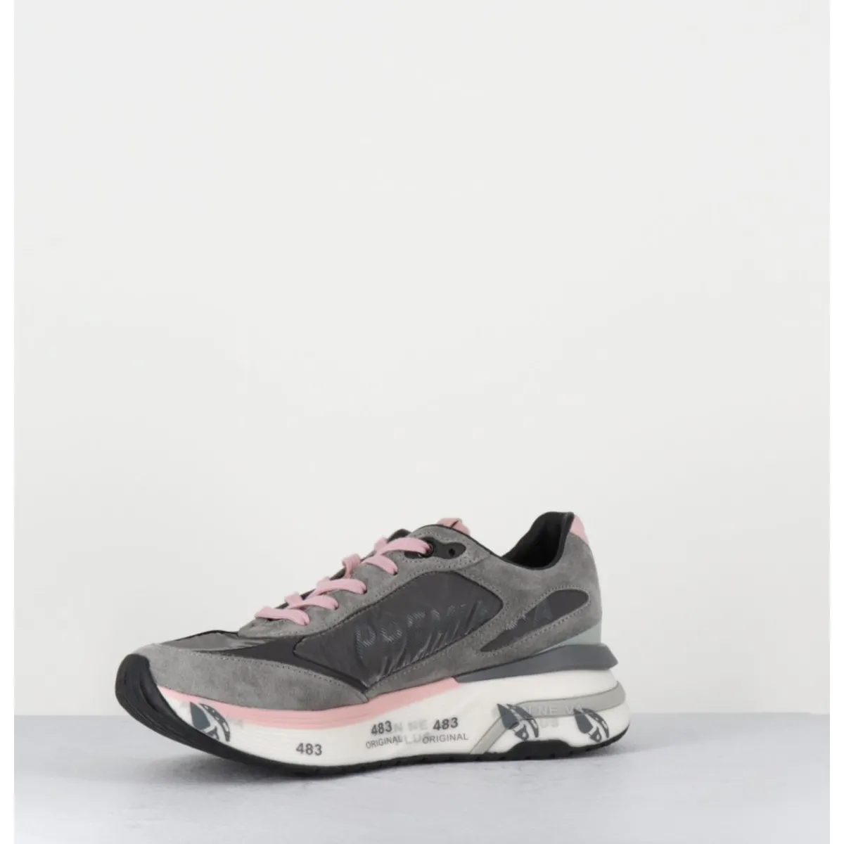 Sneakers esprit années 90, semelle ultra light innovante chez Premiata, daim & toile gris foncé, détails de cuir argent & rose pale, montées sur une semelle épaisse blanche en micro fibre, avec imprimé signature de la Maison Italienne Premiata.