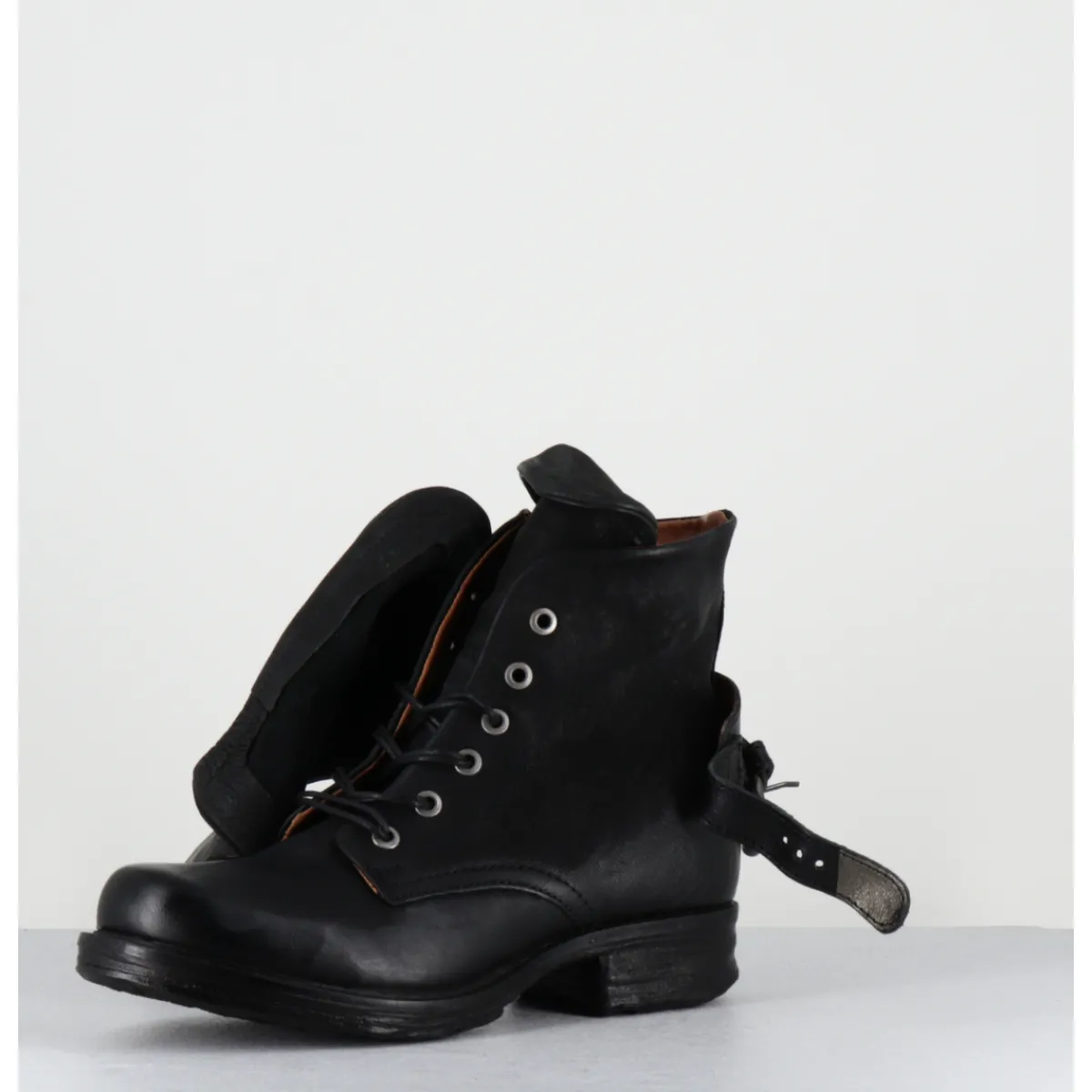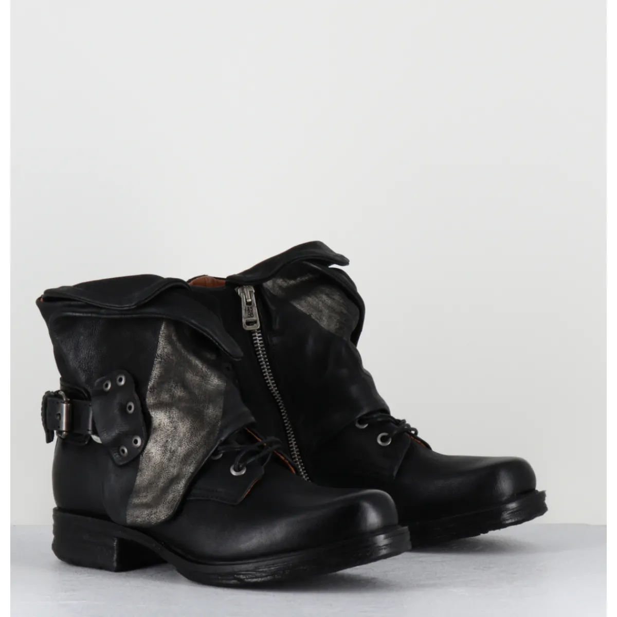 Boots rangers à lacets en cuir gras noir et doré avec empiècement asymétrique et sangle réglable à l’arrière esprit rock