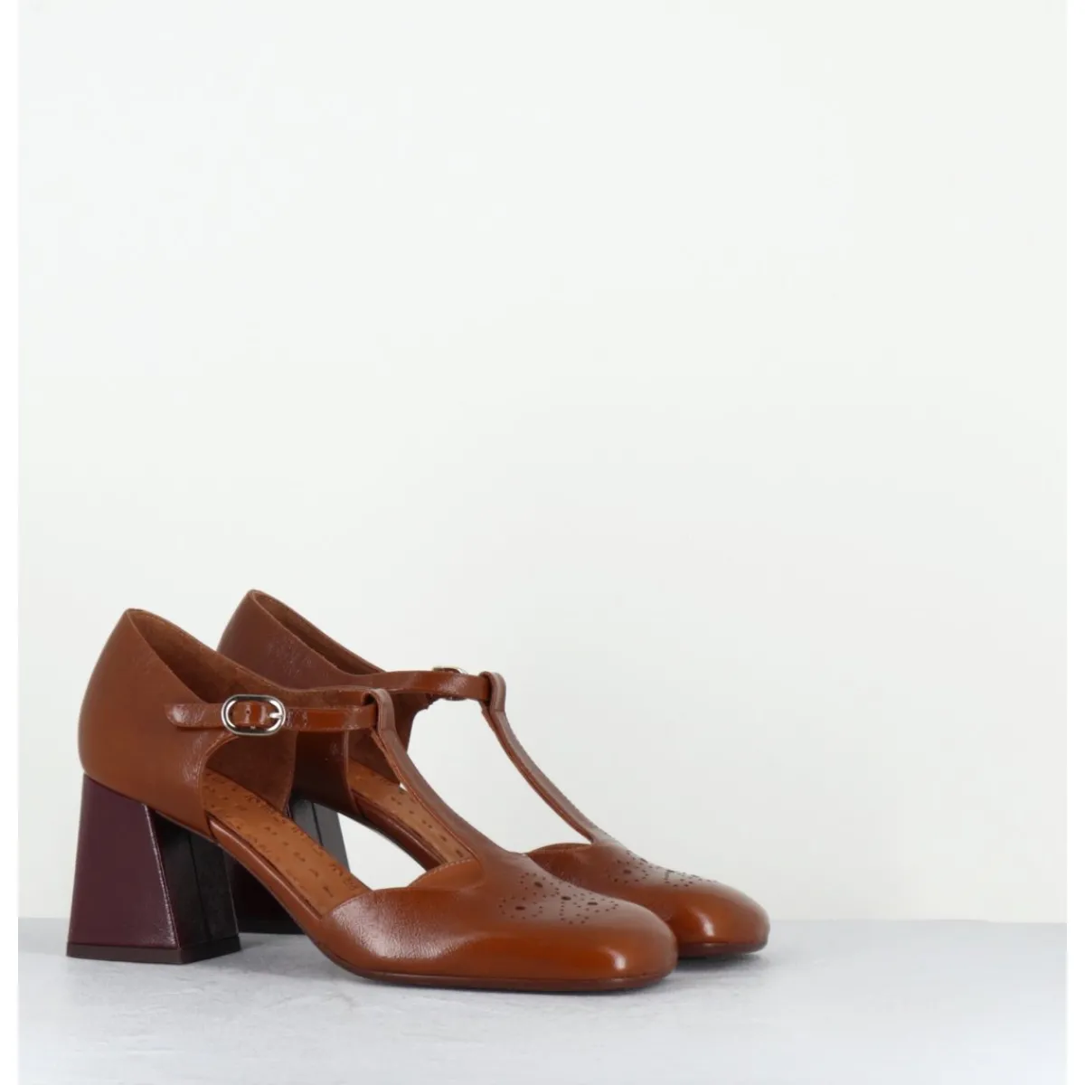 Chaussures salomé à bride en cuir légèrement brillant camel et bordeaux, bout carré arrondi avec design fleuri à l’avant, montées sur un talon stylisé