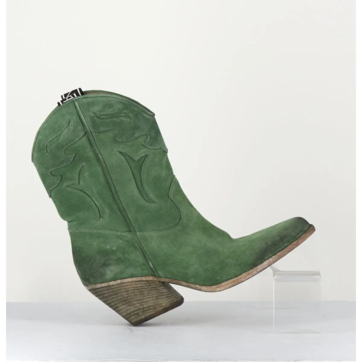 Boots santiags en daim vert souple, découpes motifs traditionnels, bout effilé légèrement brossé au noir pour un effet vieilli, montées sur un talon biseauté confortable