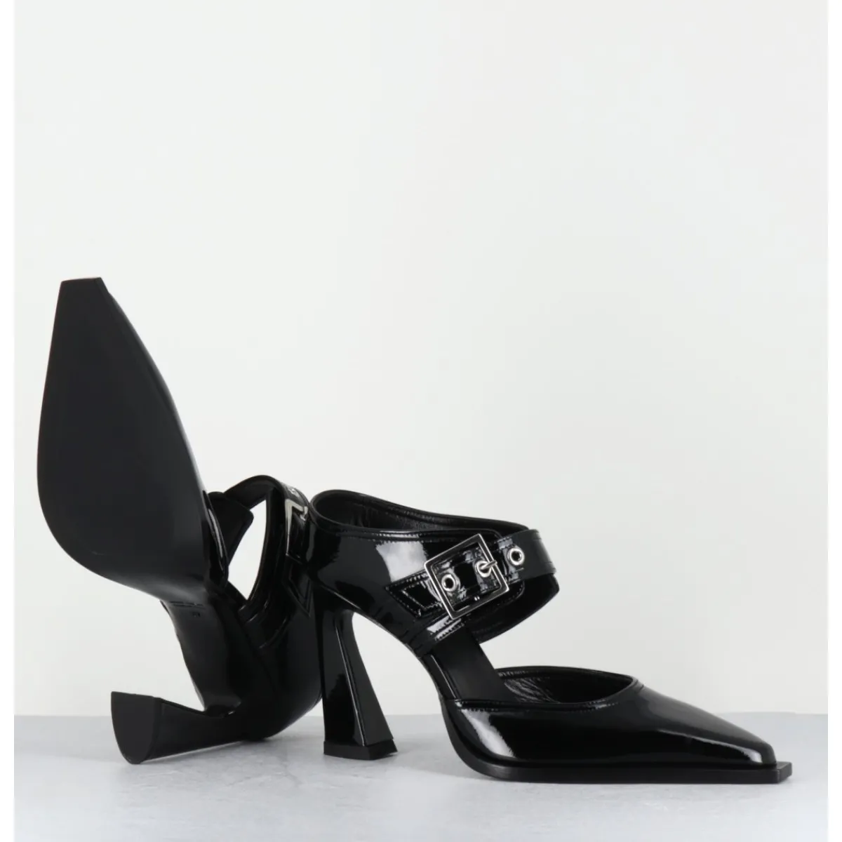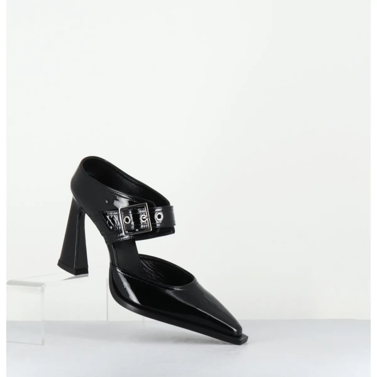 Mules pointu en cuir vernis noir, ligne effilée à bout rapporté, bride à boucle réglable, montées sur un haut talon stylisé