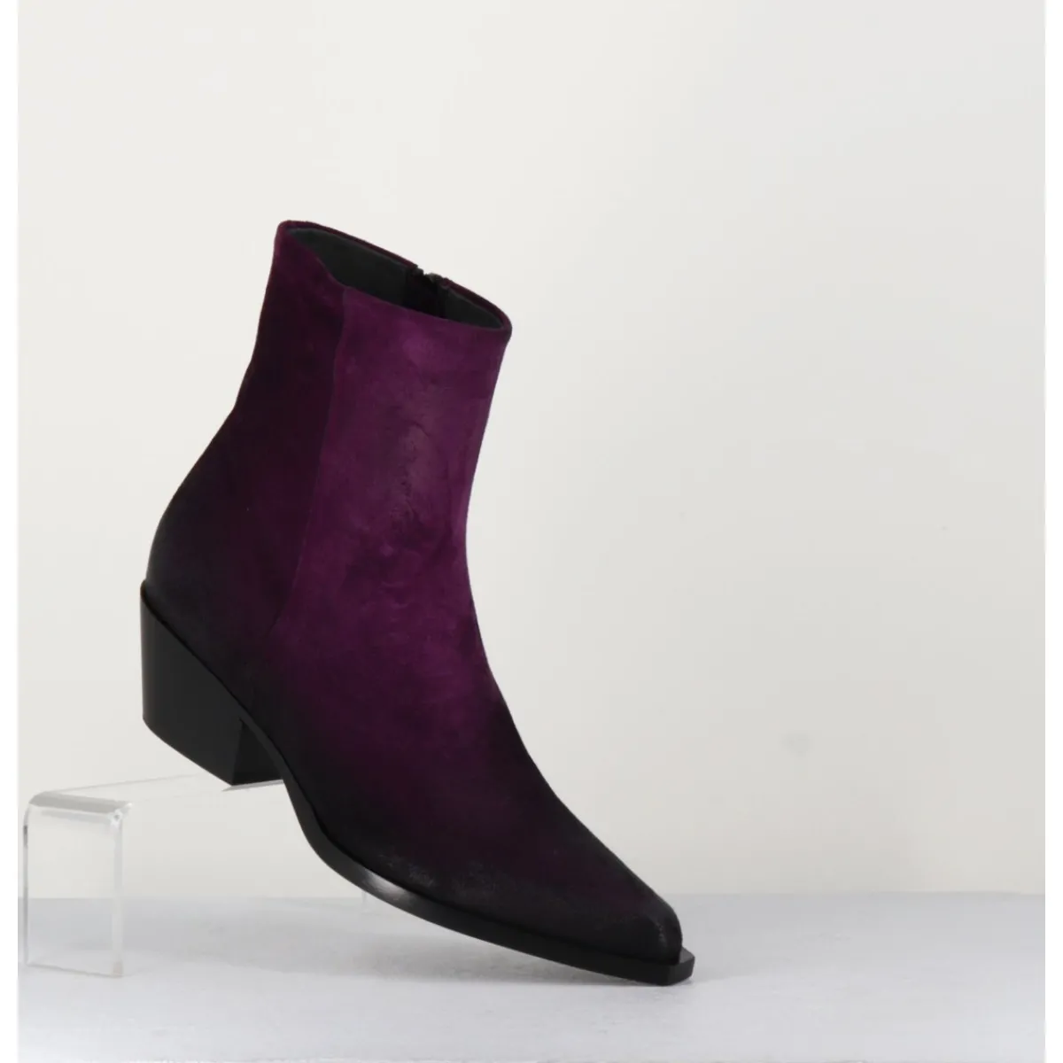Boots santiags en daim violet patiné à la main pour effet vieilli, ligne pure à bout pointu avec petite pointe carrée, zip intérieur, montées sur un talon légèrement biseauté confortable.