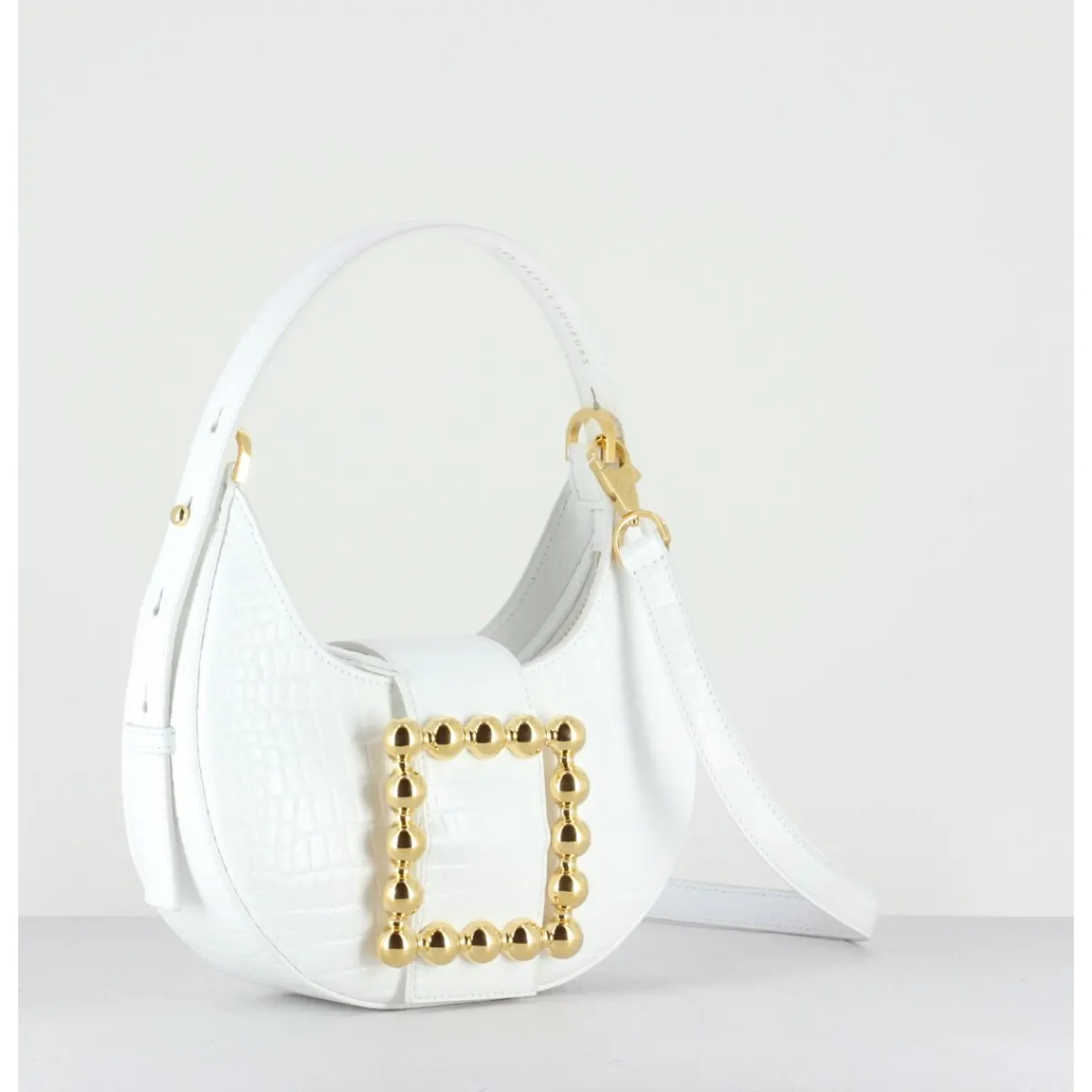 Classique de la maison, le sac Cindy s’inspire des années 90 et se décline cette fois dans une version en cuir imprimé croco blanc et boucle bijou dorée.