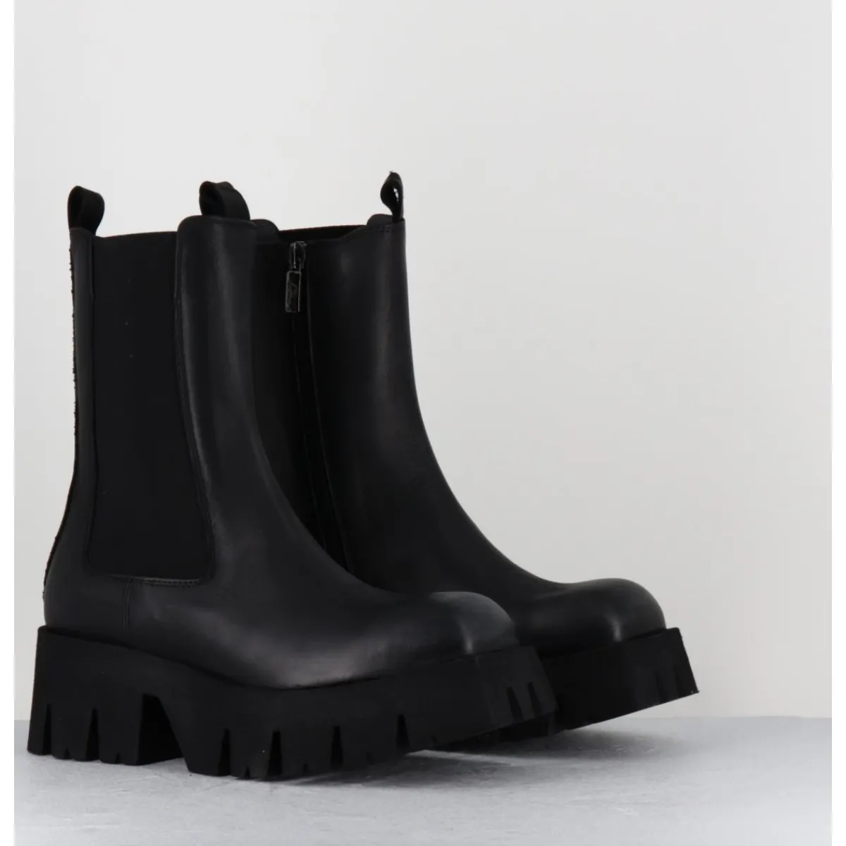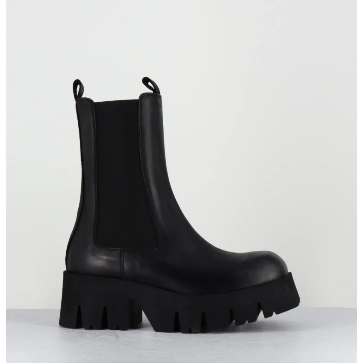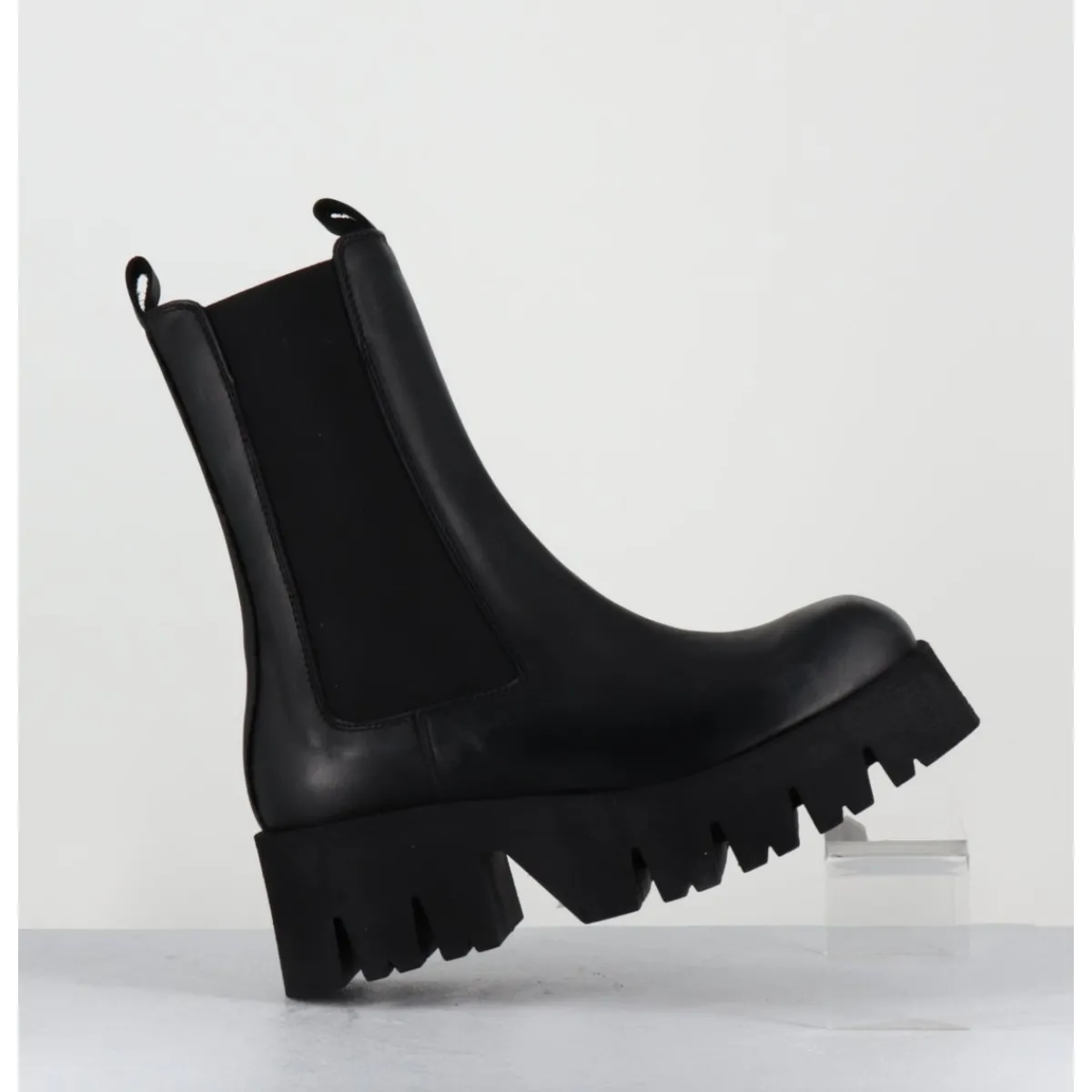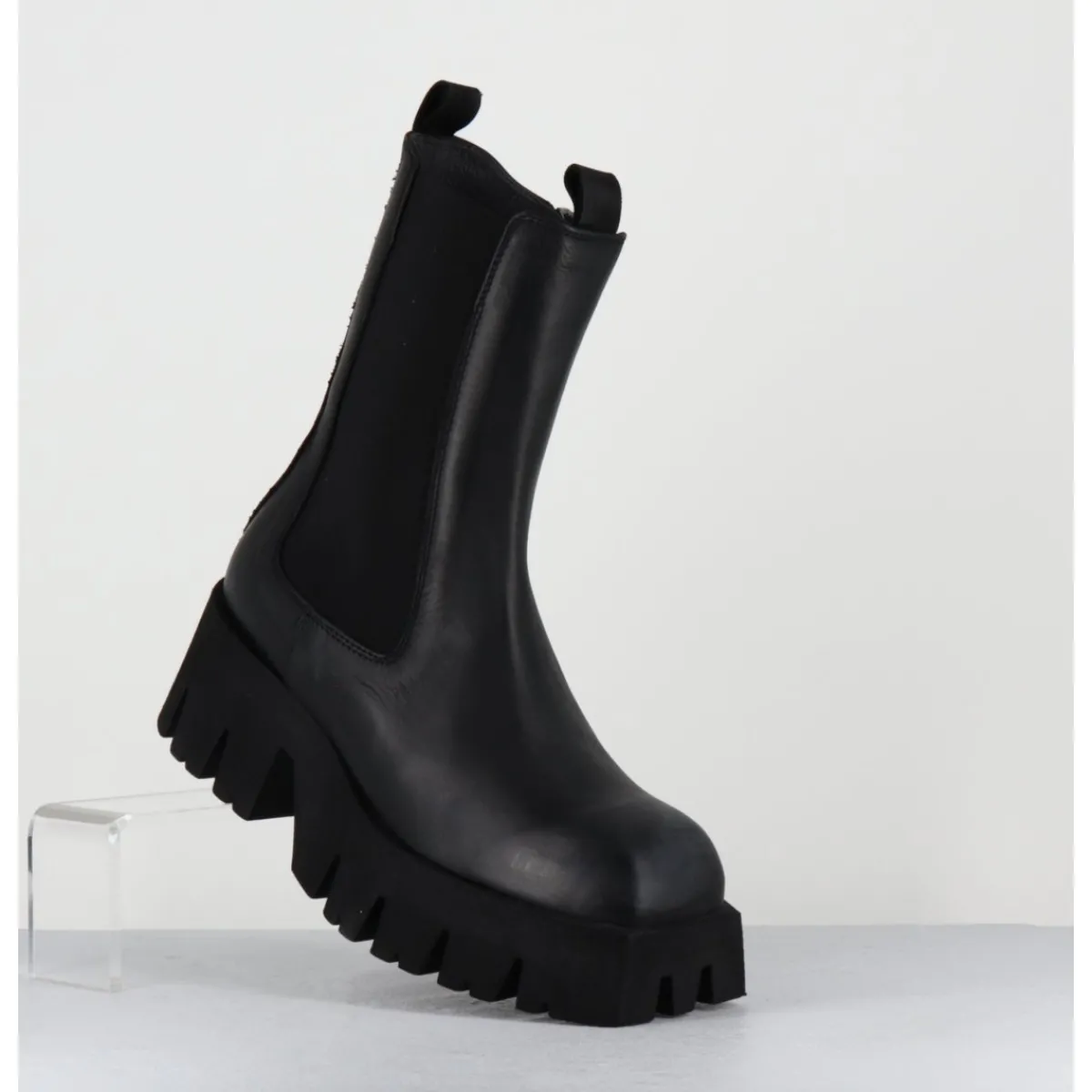 Boots en cuir noir, large élastique unilatéral, zip intérieur, forme carré large structuré, montées sur une semelle épaisse en micro-fibre ultra légère crantée pour plus de flexibilité, d’un grand confort