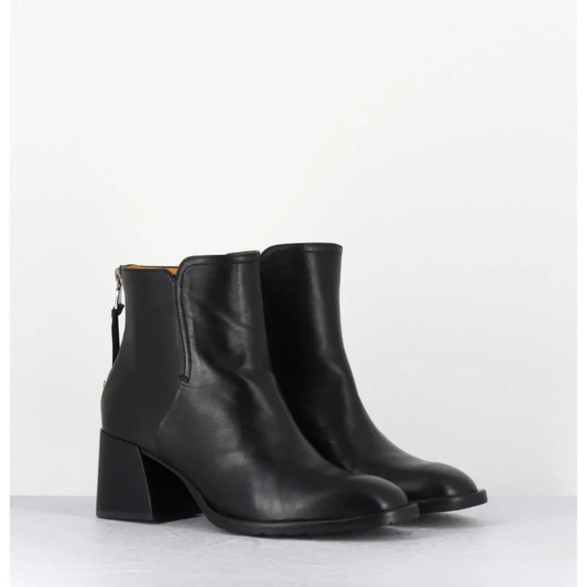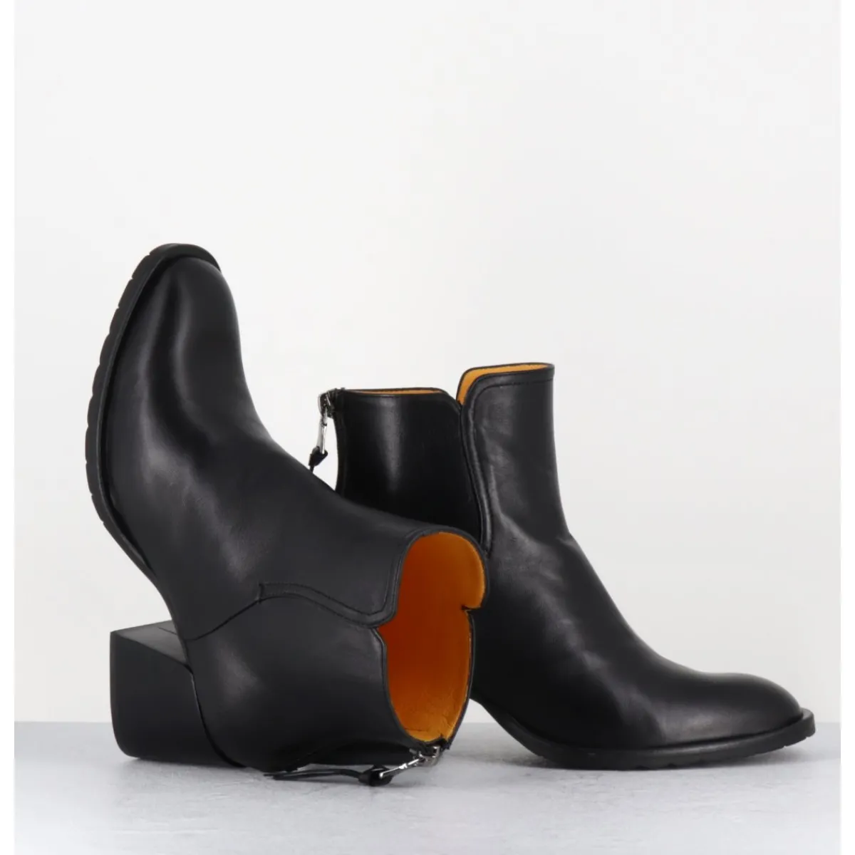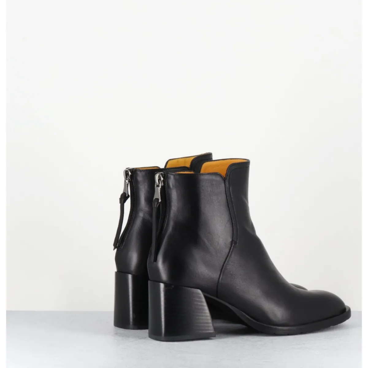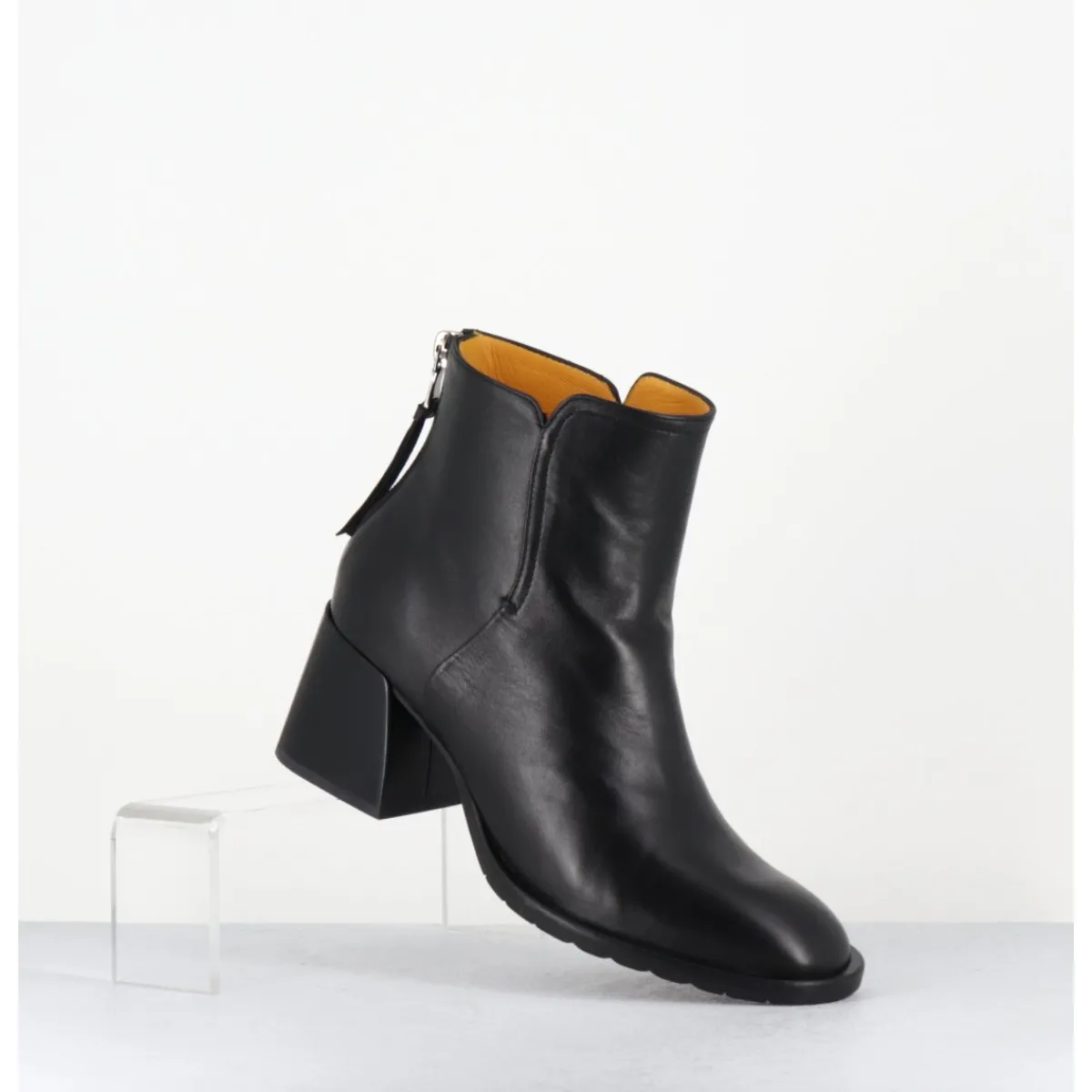 Boots en agneau extrêmement souple noir, tige courte, bout carré arrondi, zip arrière, coutures ton sur ton au look rétro, montées sur un talon bloc confortable esprit années 70