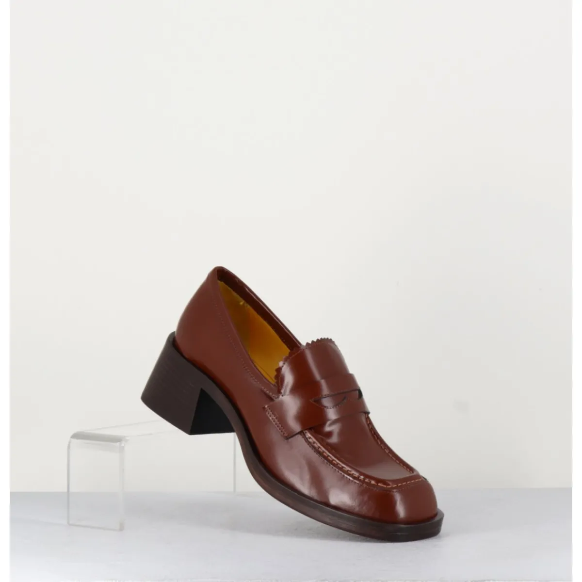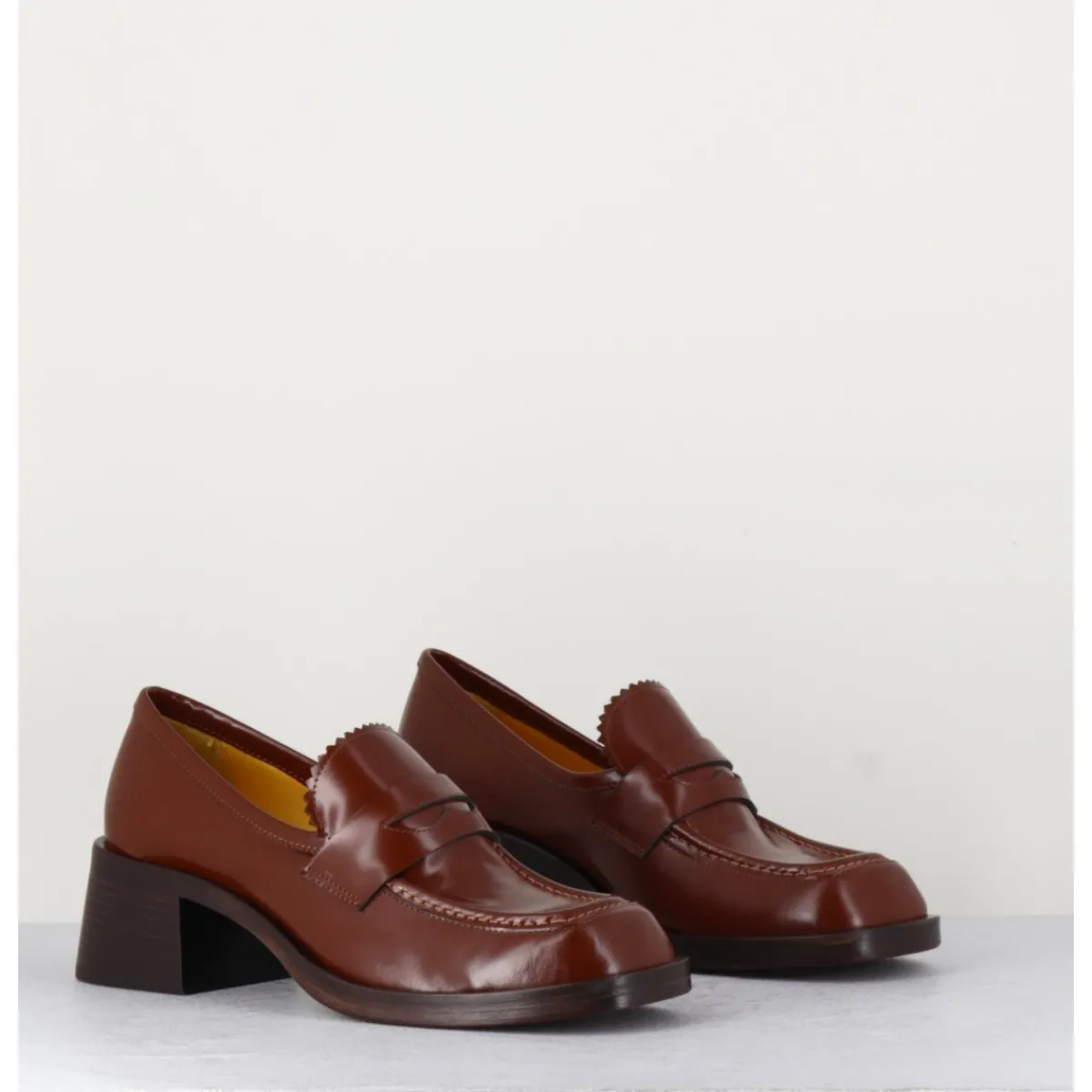 Mocassins en cuir marron, bout carré arrondi avec brogue, languette finitions dentelées, monté sur une semelle et un talon bloc en cuir.