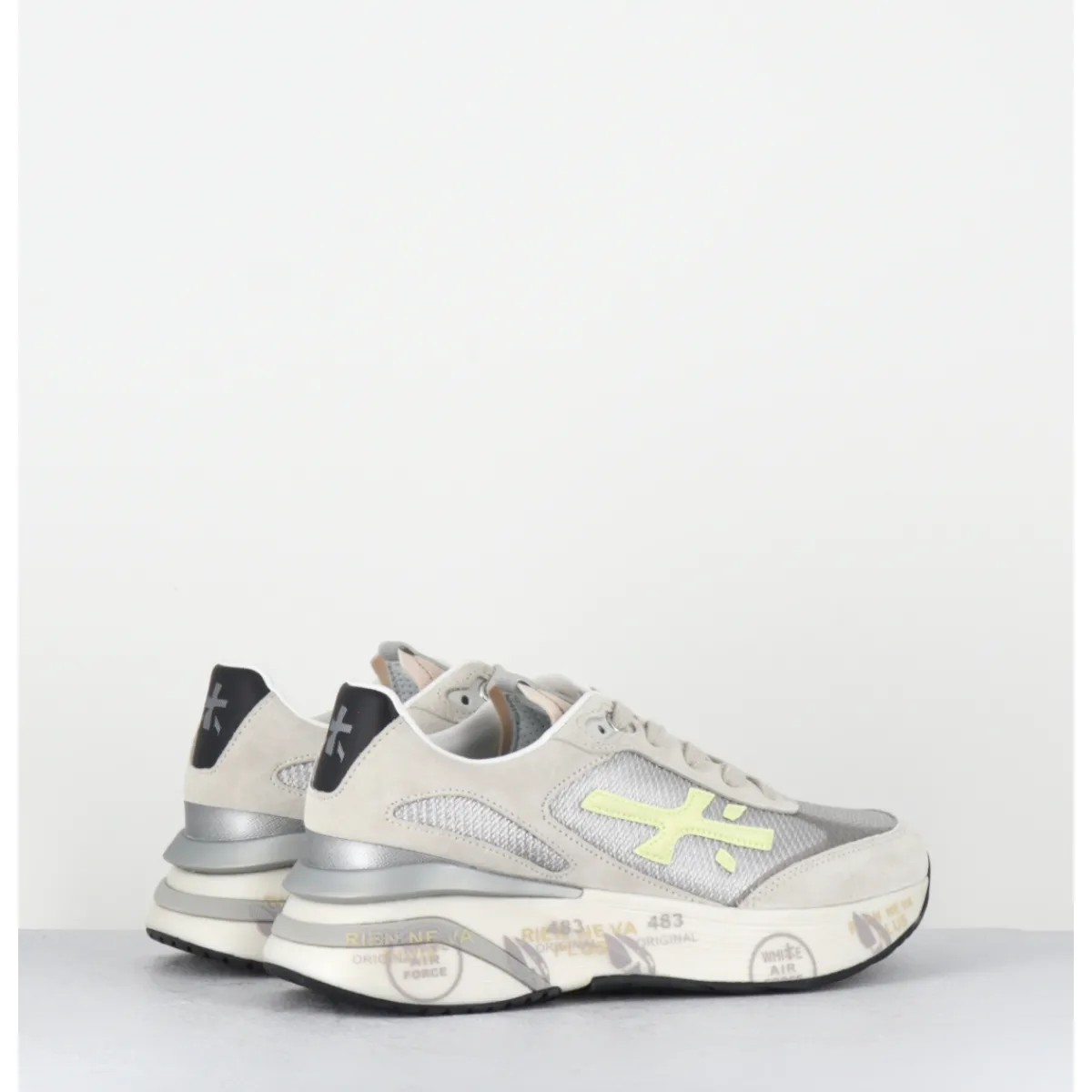 Sneakers esprit années 90, semelle ultra light innovante chez Premiata, daim gris et empiècement de toile métallisé avec détails cuir vert clair, montées sur une semelle épaisse blanche en micro fibre, avec imprimé signature de la Maison Italienne Premiata.