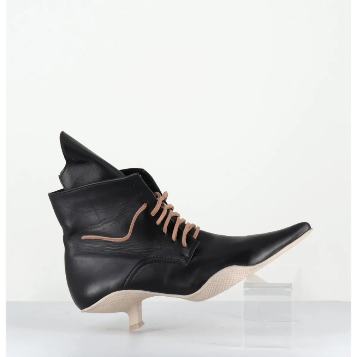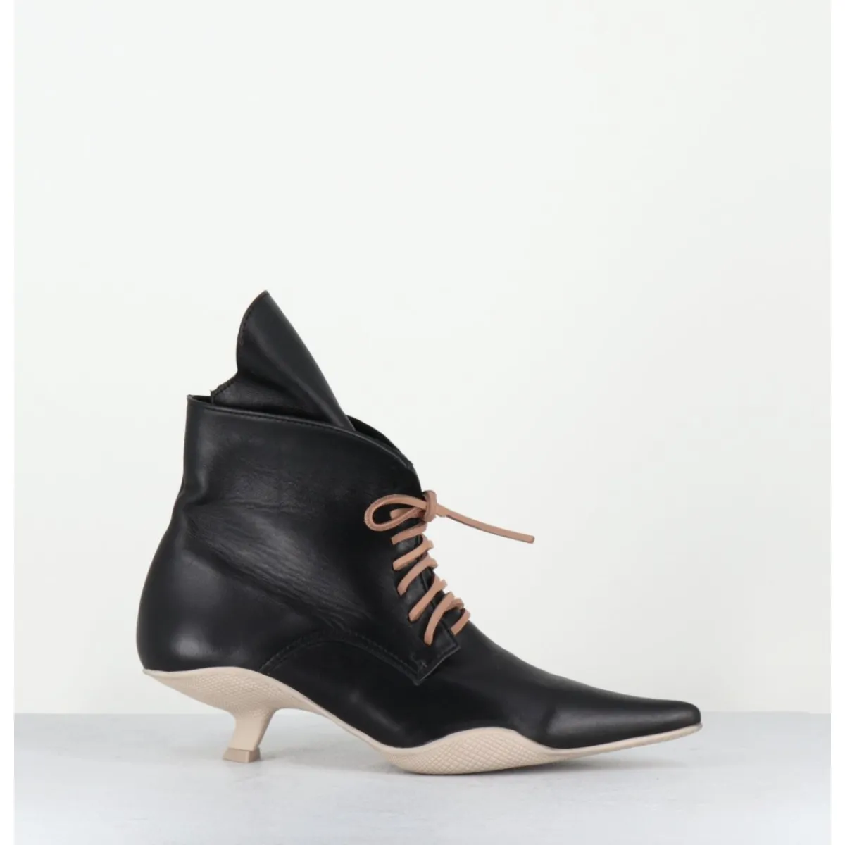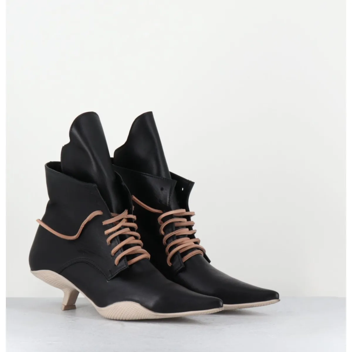 Boots bout pointu en cuir noir, lacets en cuir brut couleur sable (lacets noirs fournis), languette apparente, montées sur une semelle en gomme débordante beige sale et un petit talon stylisé
