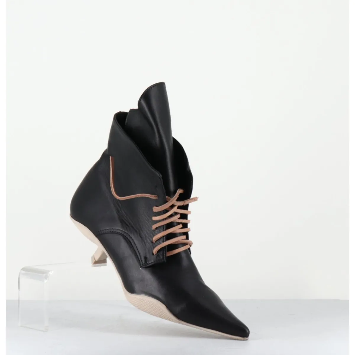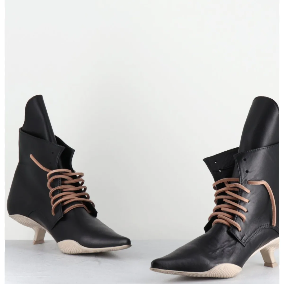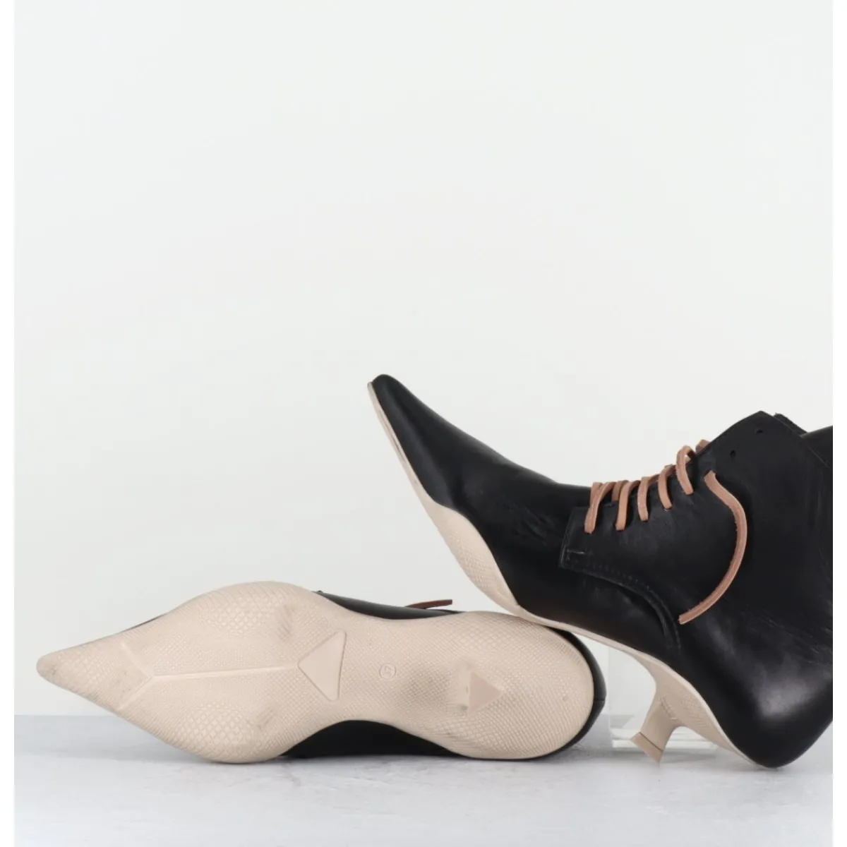 Boots bout pointu en cuir noir, lacets en cuir brut couleur sable (lacets noirs fournis), languette apparente, montées sur une semelle en gomme débordante beige sale et un petit talon stylisé