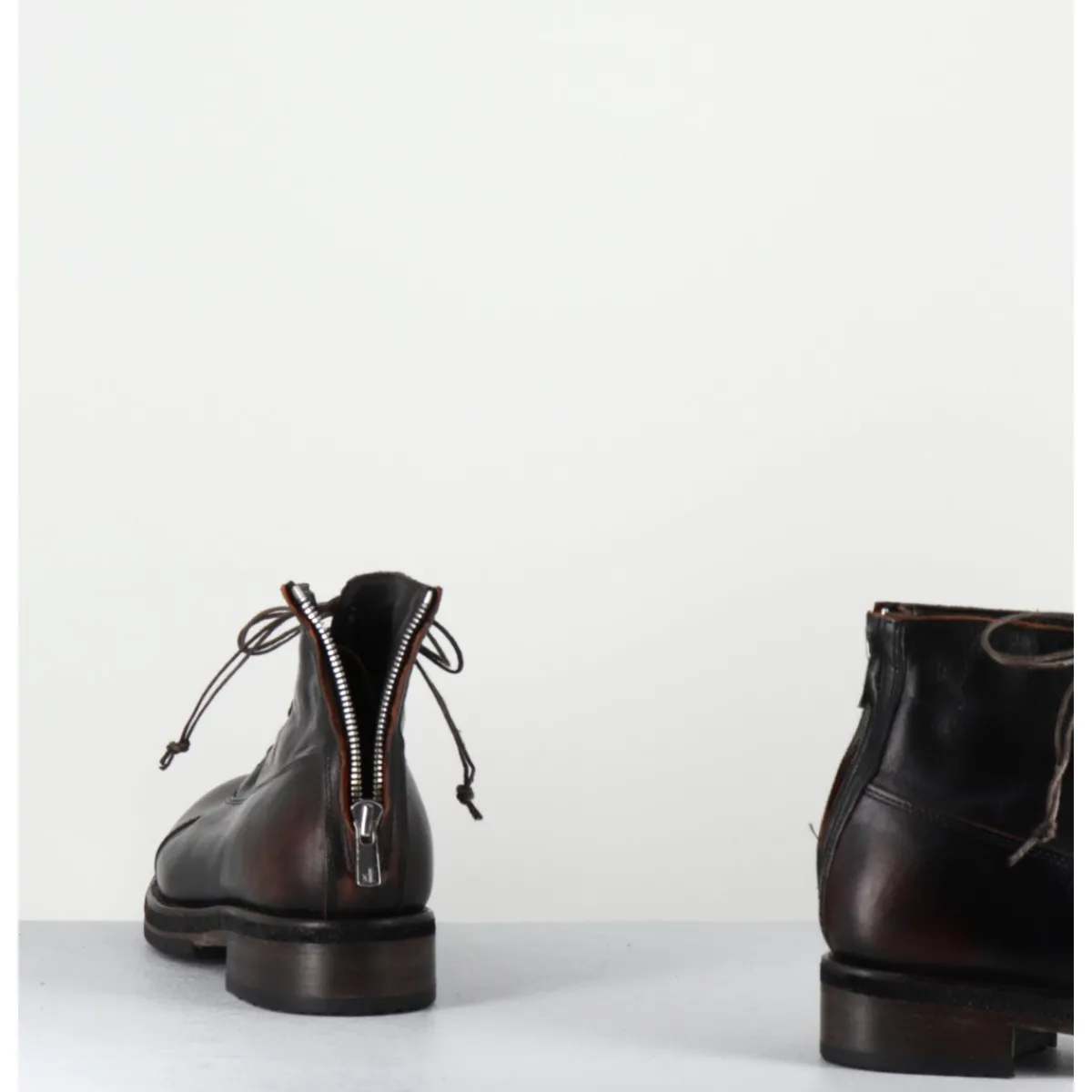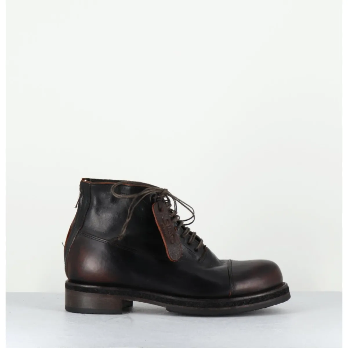 Bottines à lacets en cuir marron foncé lavé à la main pour un effet vieilli à l’avant & à l’arrière, zip arrière, bout rond rapporté, montées sur une double semelle cousue main cuir et crêpe naturel