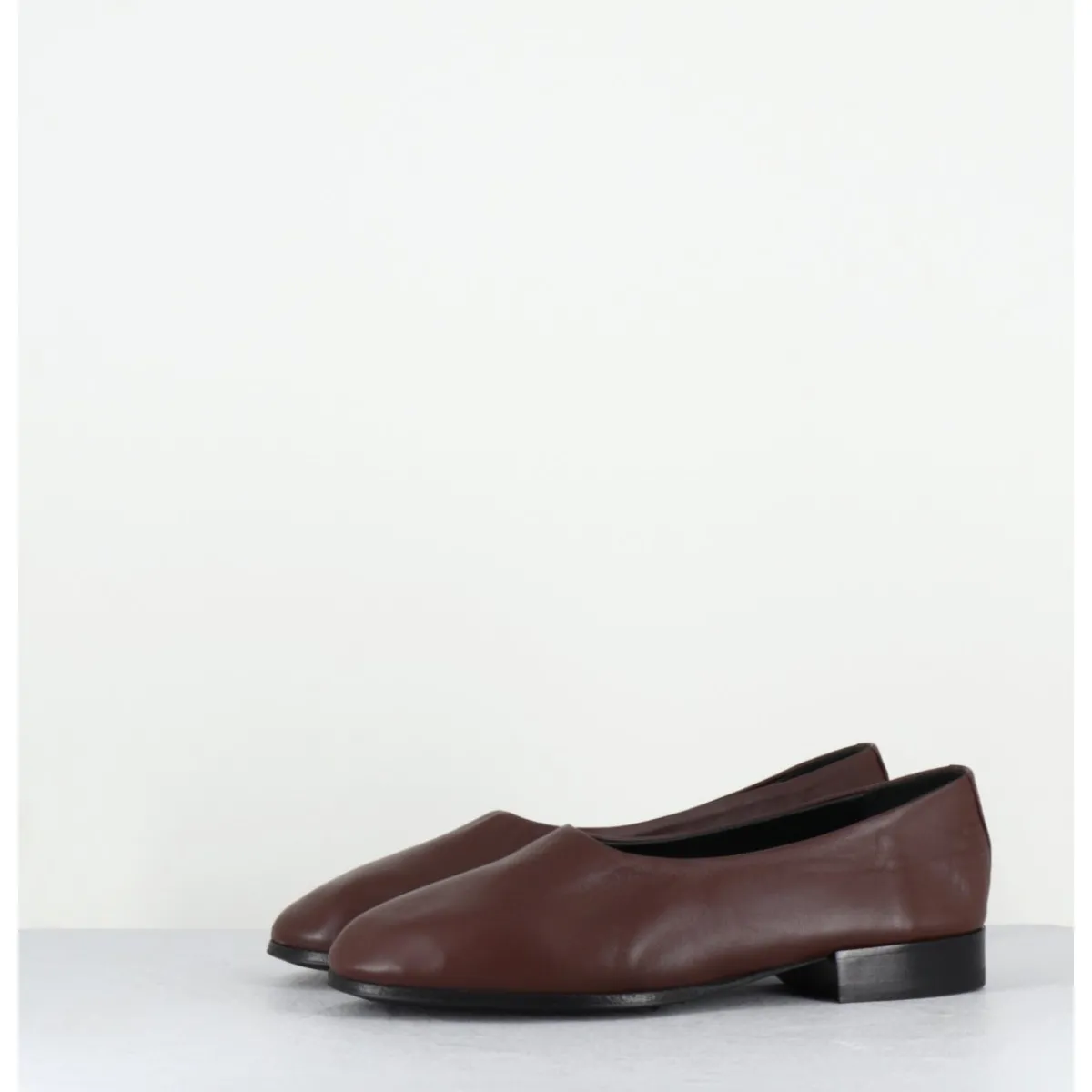 Ballerines en cuir marron extrêmement souple à petit talon, ligne minimaliste japonaise semi-couvrante, montées sur une semelle en cuir cousue
