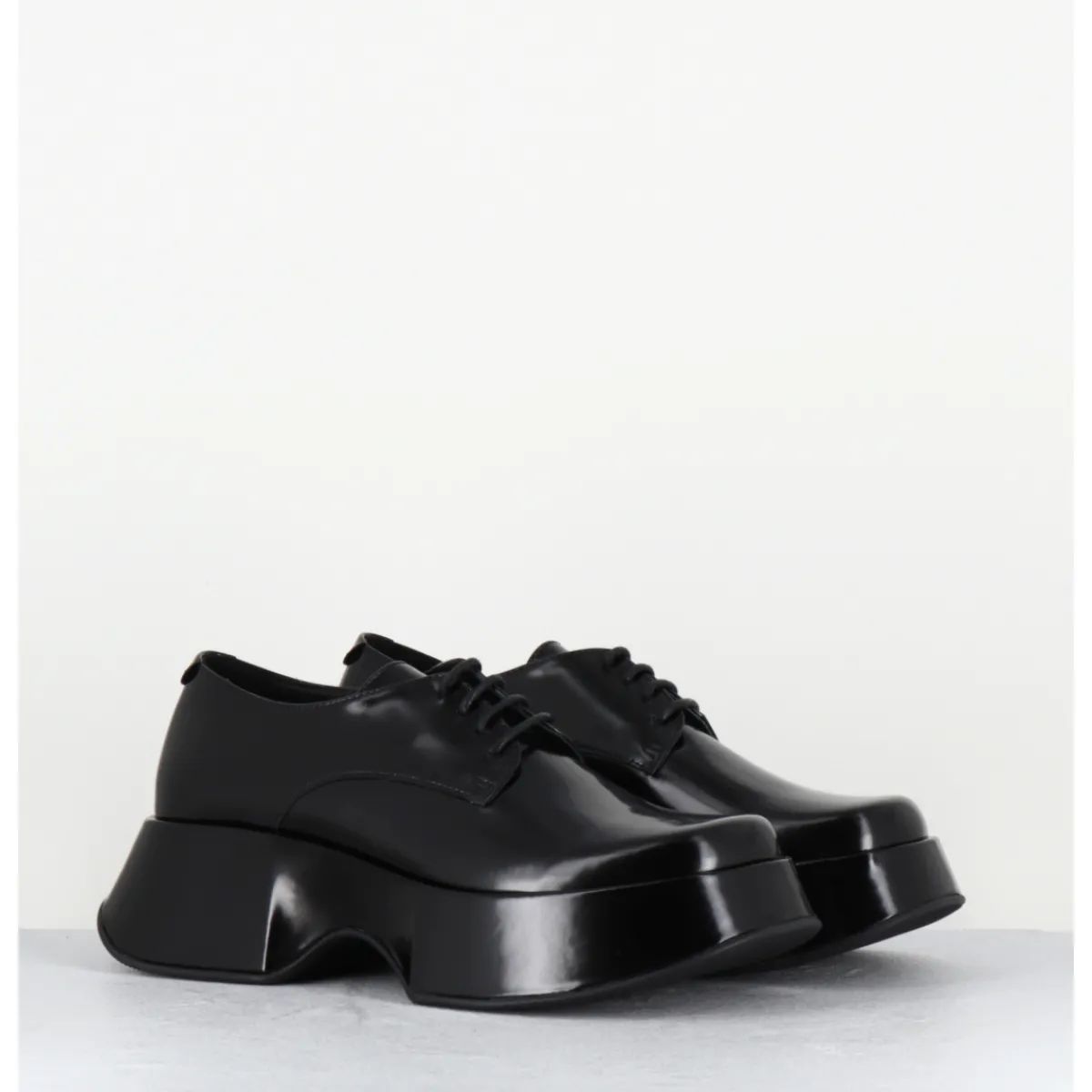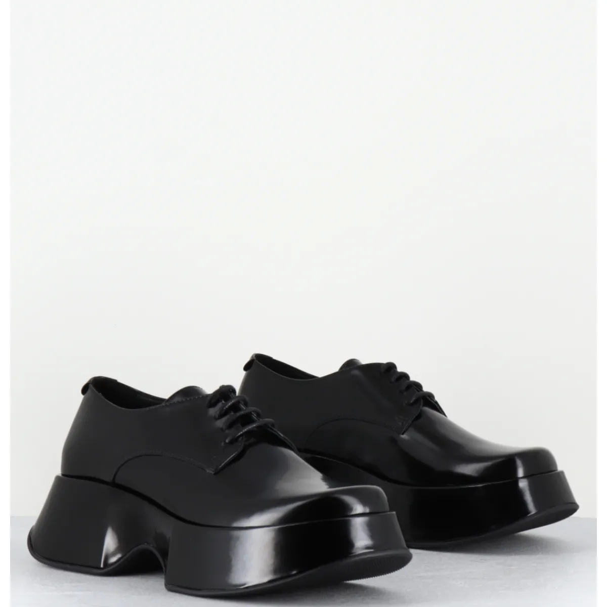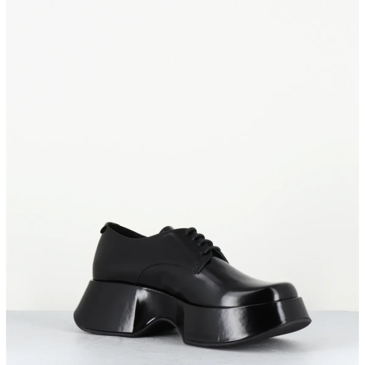 Derbies à lacets cuir noir glacé, montées sur une plateforme bloc légère