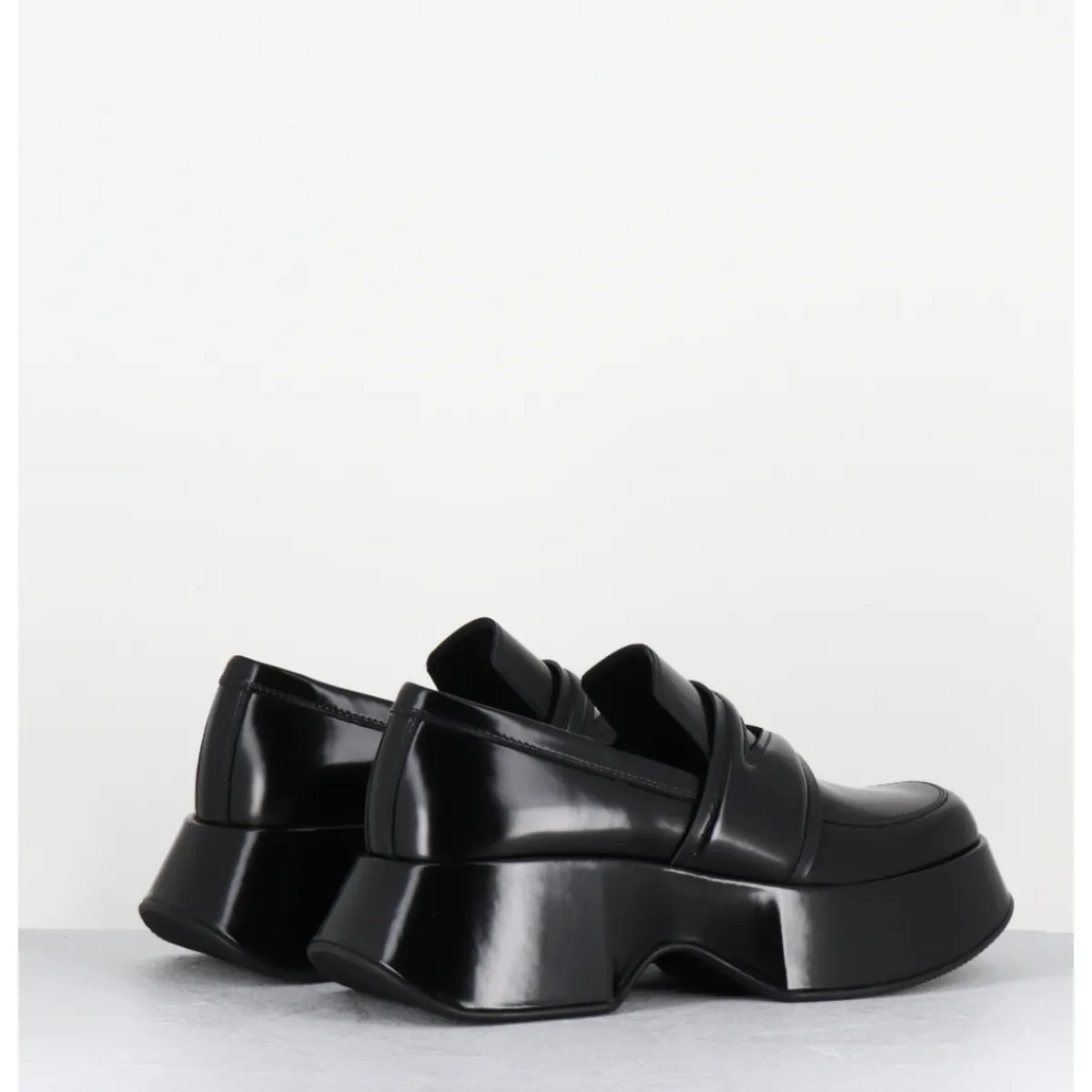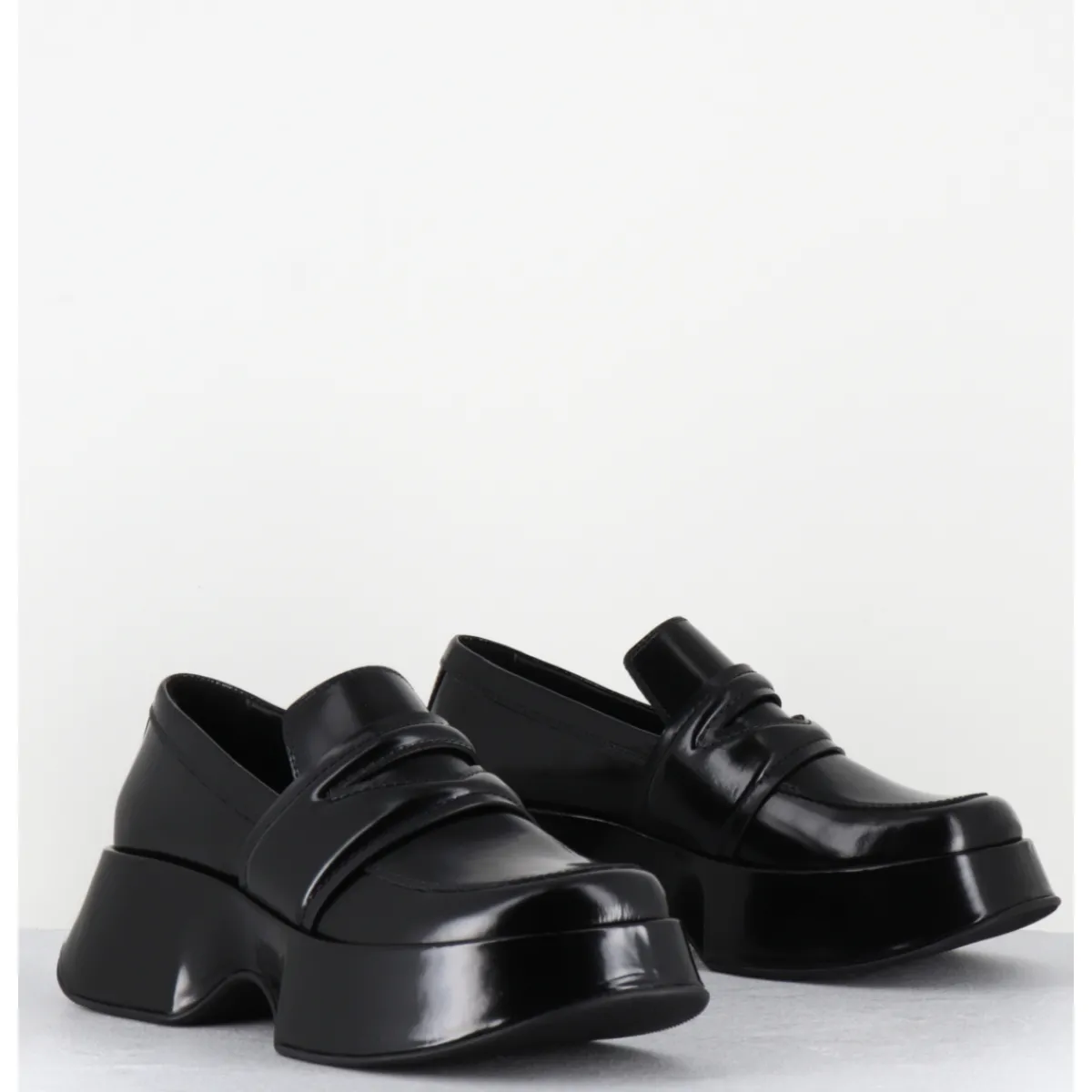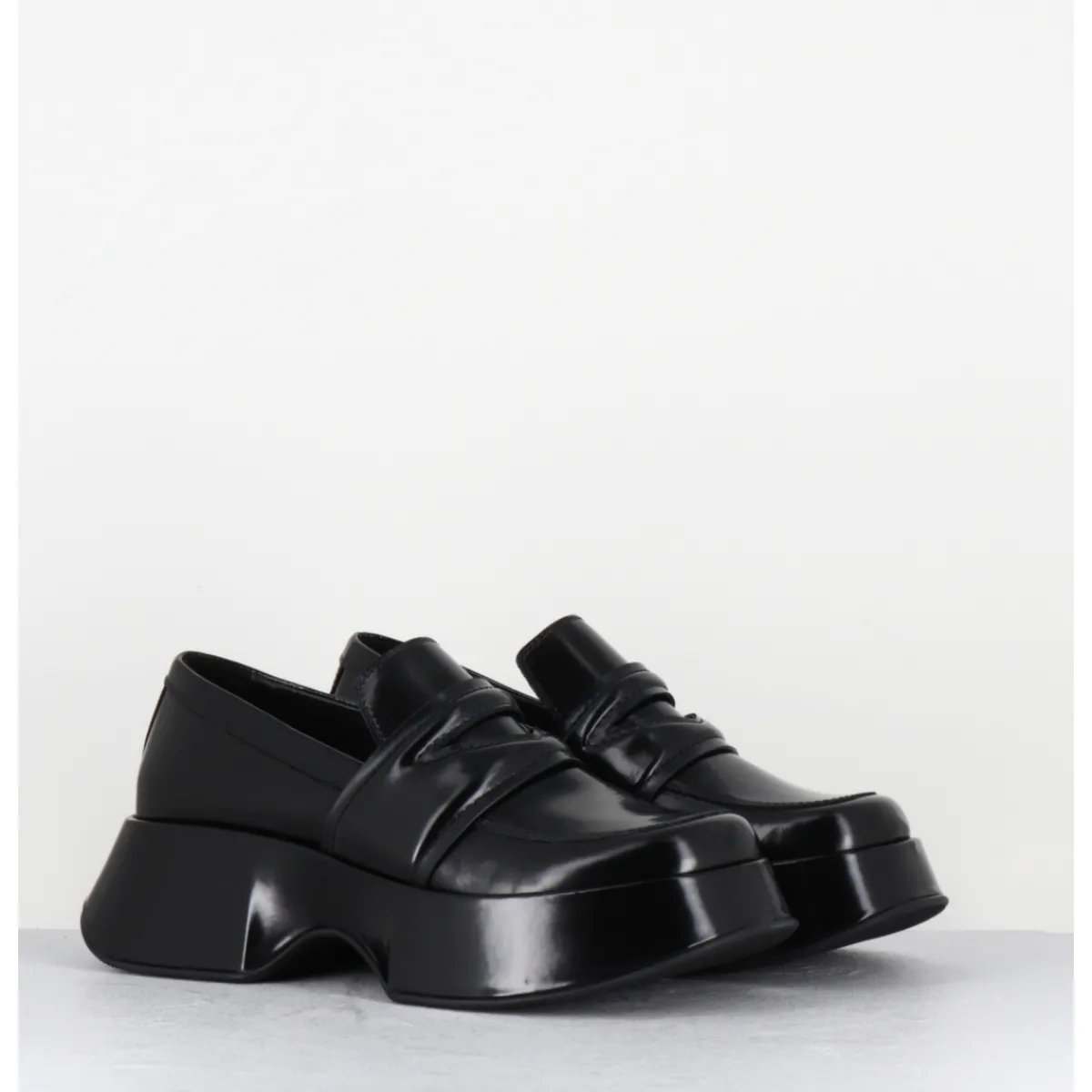 Mocassins cuir noir glacé, montées sur une plateforme bloc légère